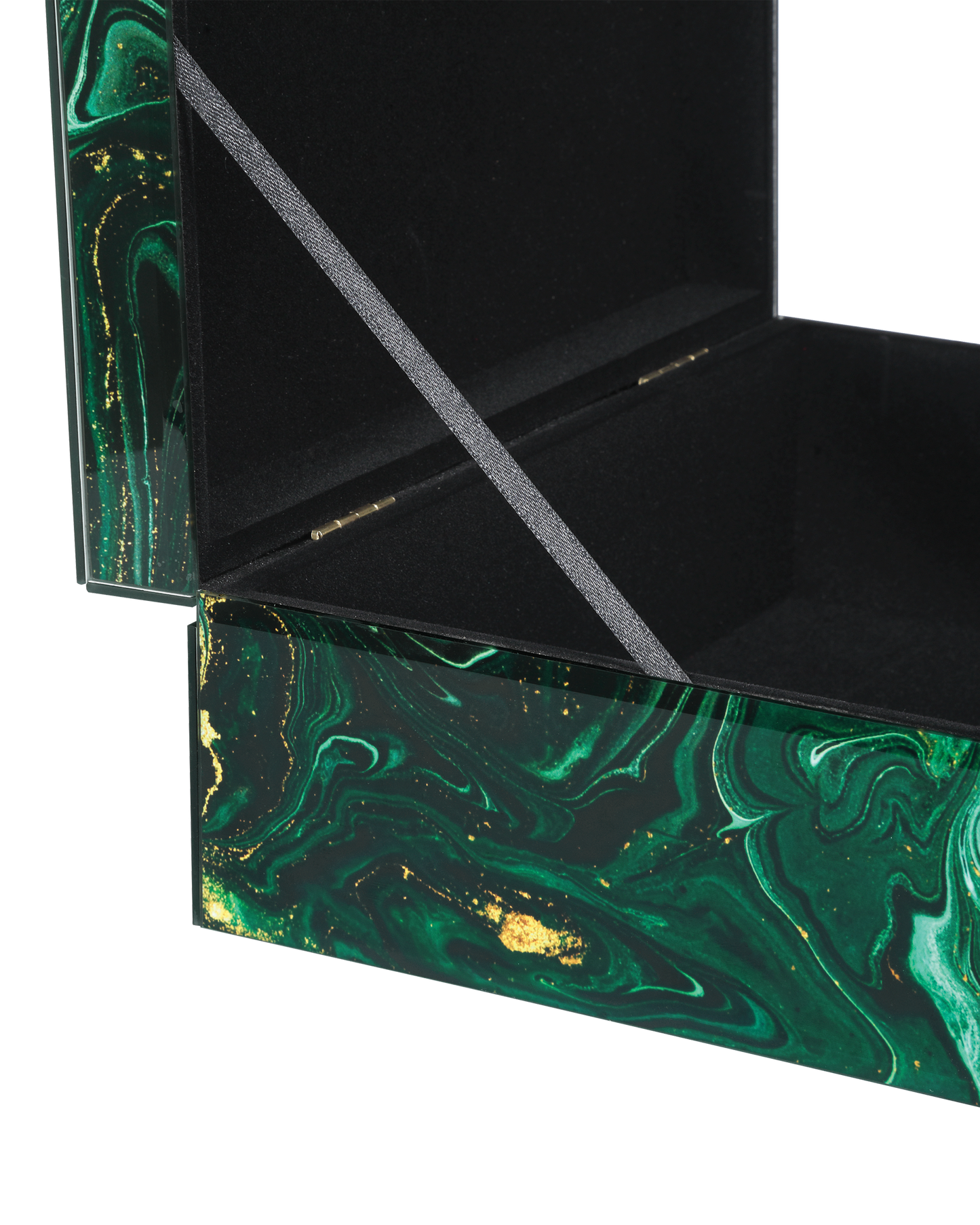 Despite looking like they are made of stone, the Interstellar Green Box Set's surfaces are the result of green swirl paper being encased in glass. The coating brings the exteriors of the decorative boxes an unparalleled sheen. The interiors are covered in black felt, and the small one will nest into the large one. Because these accessories are handmade, the patterns will vary.