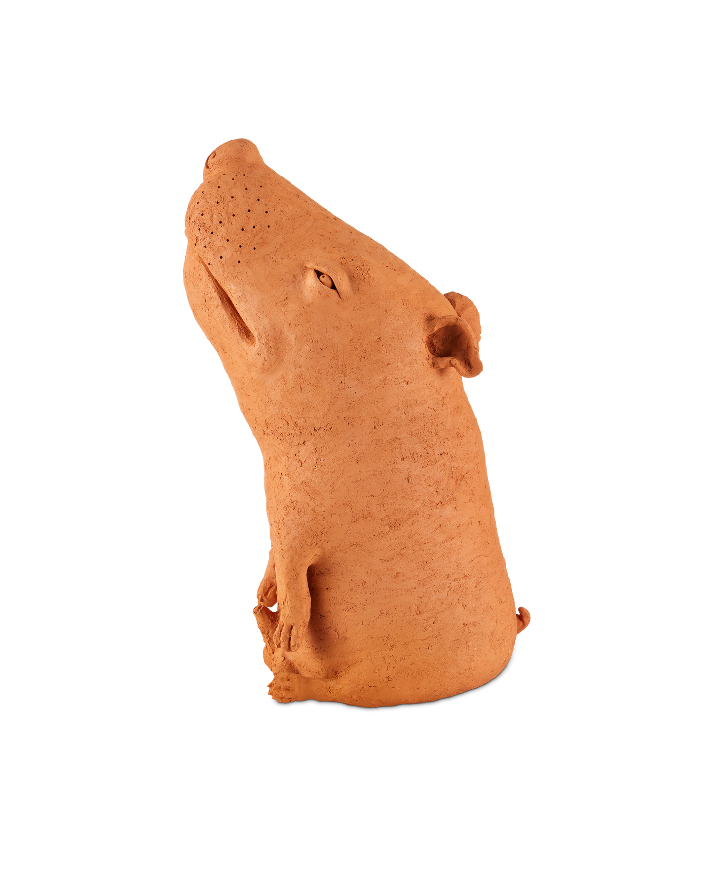 Whimsical in terracotta, Sam the Mutt is a sculpture by the emerging Thai artist Nhut Nhathawut. With an expression that is so lifelike that it feels he may bark at any moment, there are a number of artisanal aspects to the canine sculpture. This includes the obvious strokes of the artist's tools that play along the surface of the dog's body. Brownlee Currey had some fun with this mixed-breed, describing his reality as, "There may be some bulldog in there, but Sams mental and physical acuity is more akin to a potato than a sporting breed."