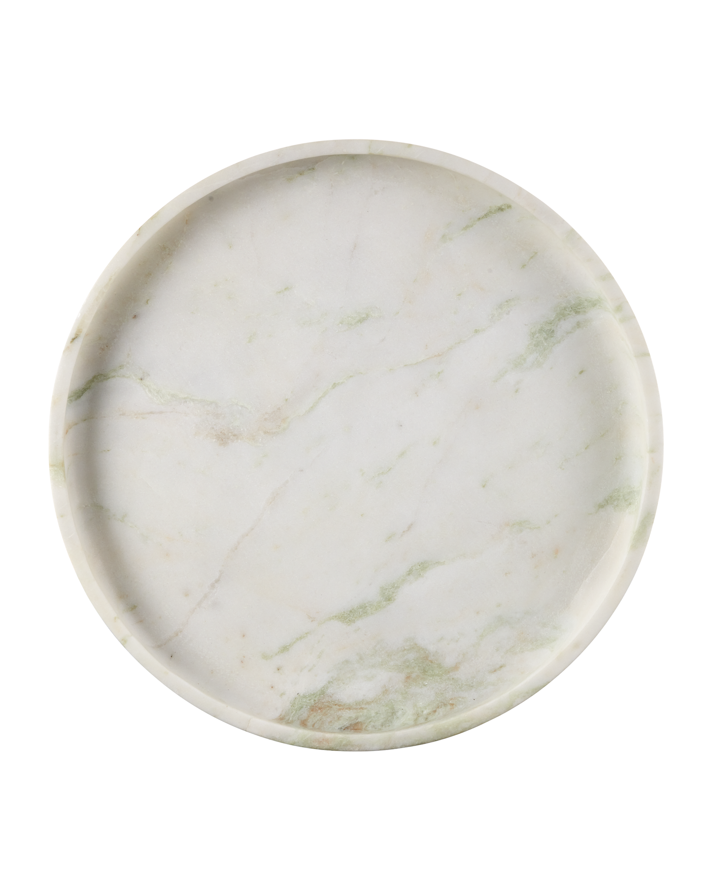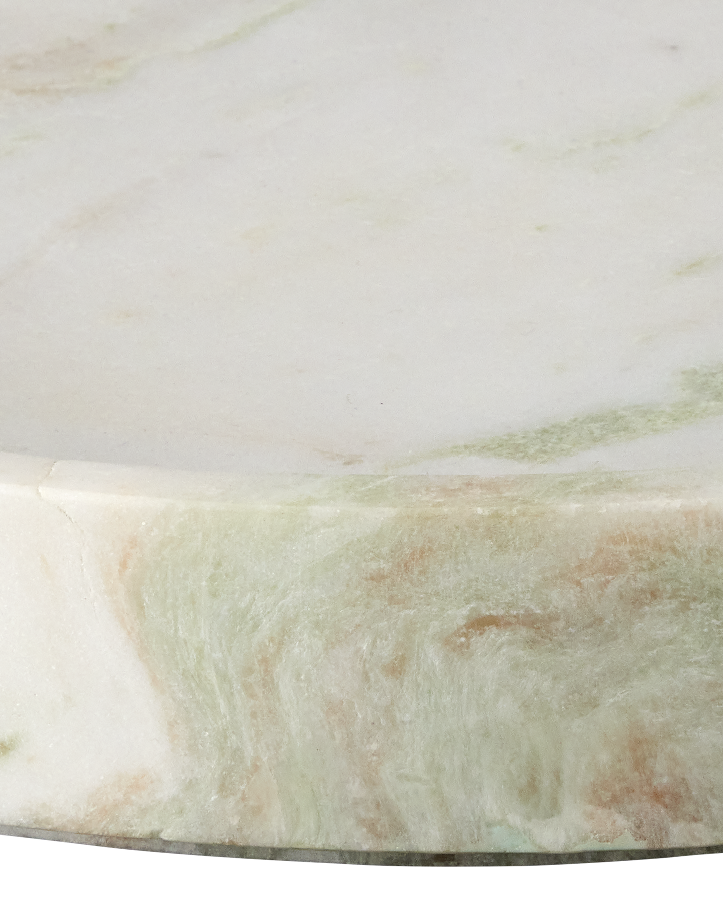 The Bilbao Aravali Onyx Round Tray is made of natural stone with lovely pastel pink and green veining flowing along its surface. The material is sourced from the Aravali Mountain Range in India. Design details include a narrow plinth where the tray tapers off at the bottom and feet that elevate it slightly from the surface. Because this is a natural stone, the veining will vary from piece to piece.