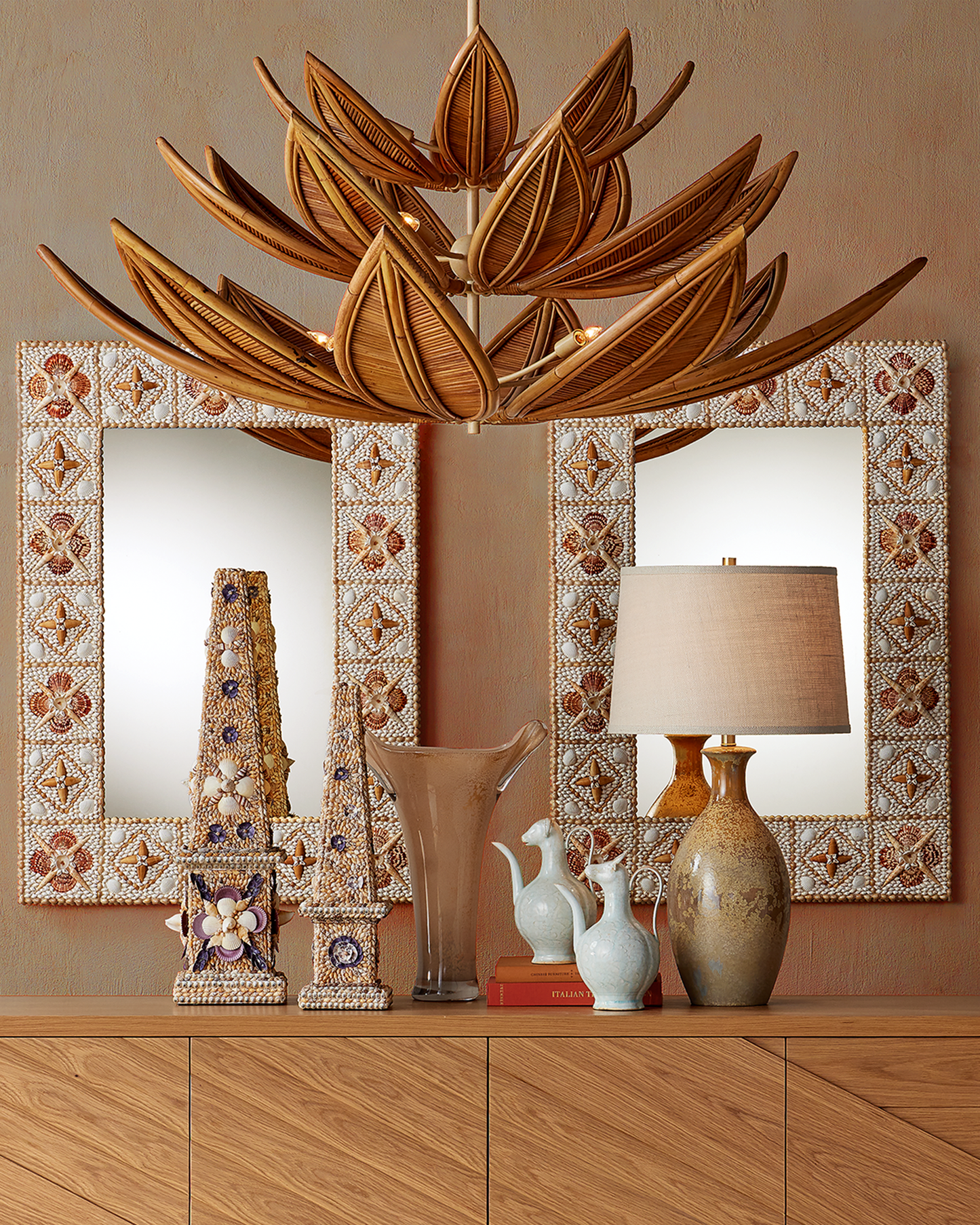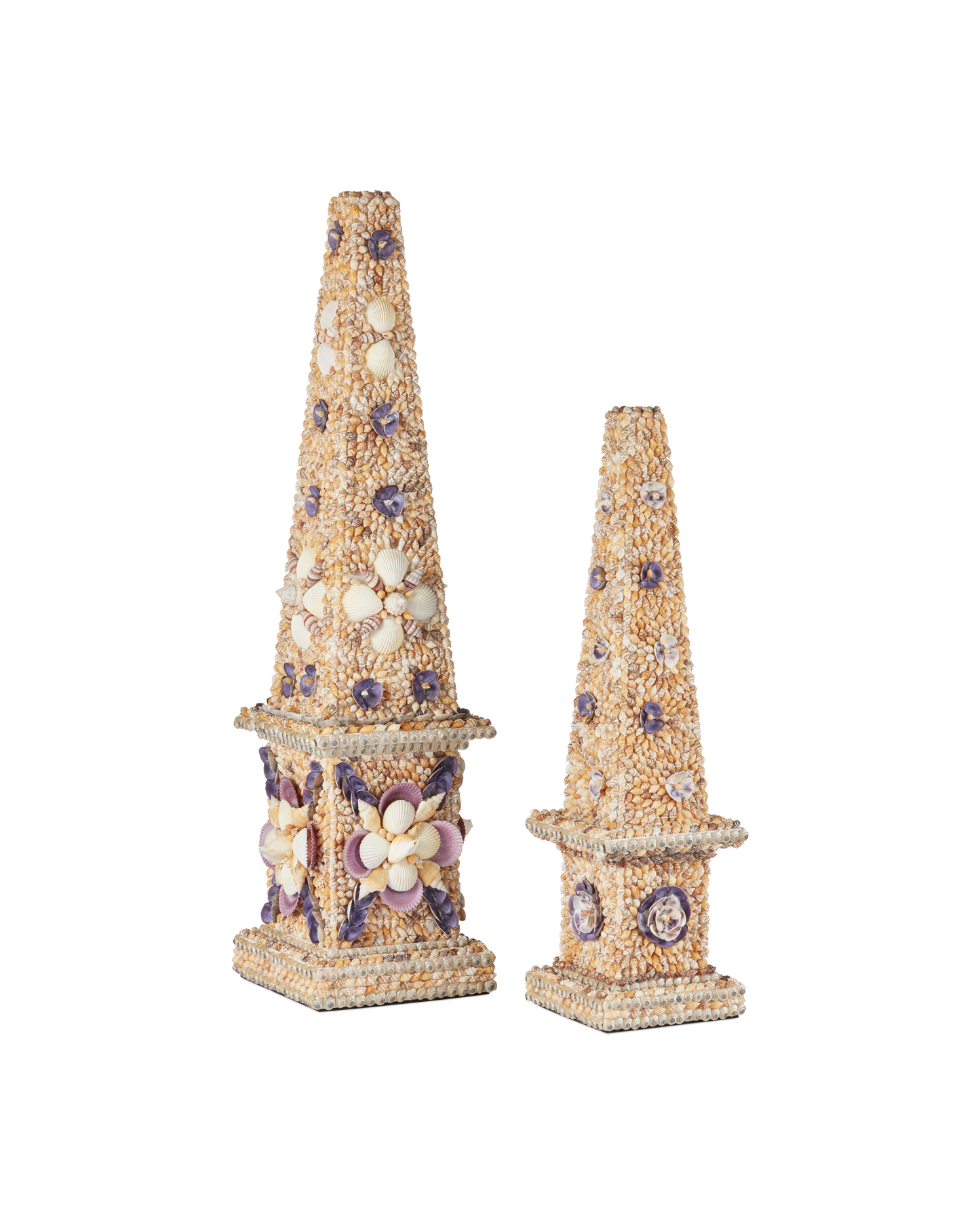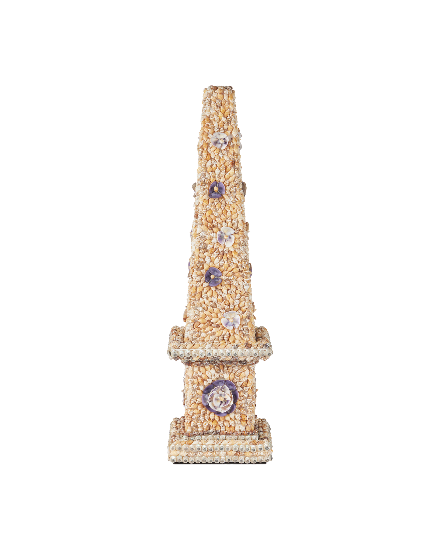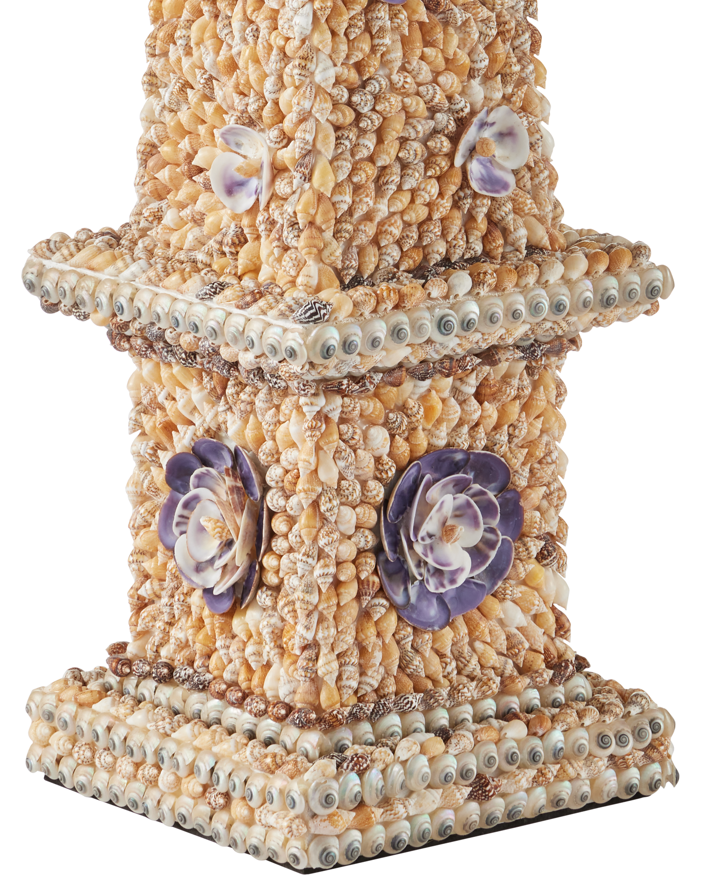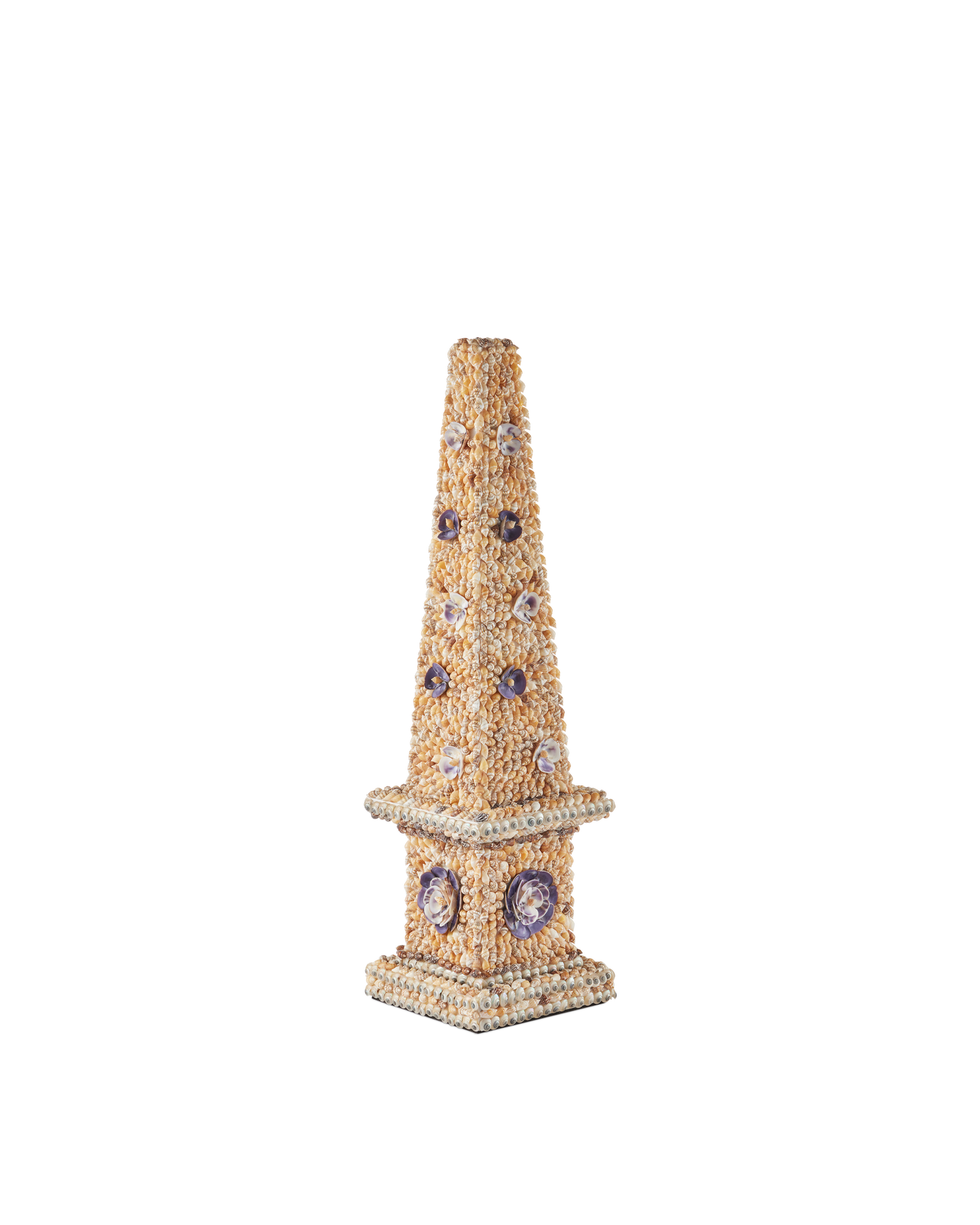 The Coquillage Short Obelisk is a shell-encrusted sculpture inspired by a mosaic wall created in coquillage, one of the worlds oldest art forms that utilizes natural shells. The complex pattern, which includes floral motifs in pale peach, white, and purple tones, is affixed to the shape made of wood. Standing almost 23 inches tall, this shell sculpture will be a commanding decorative accessory.