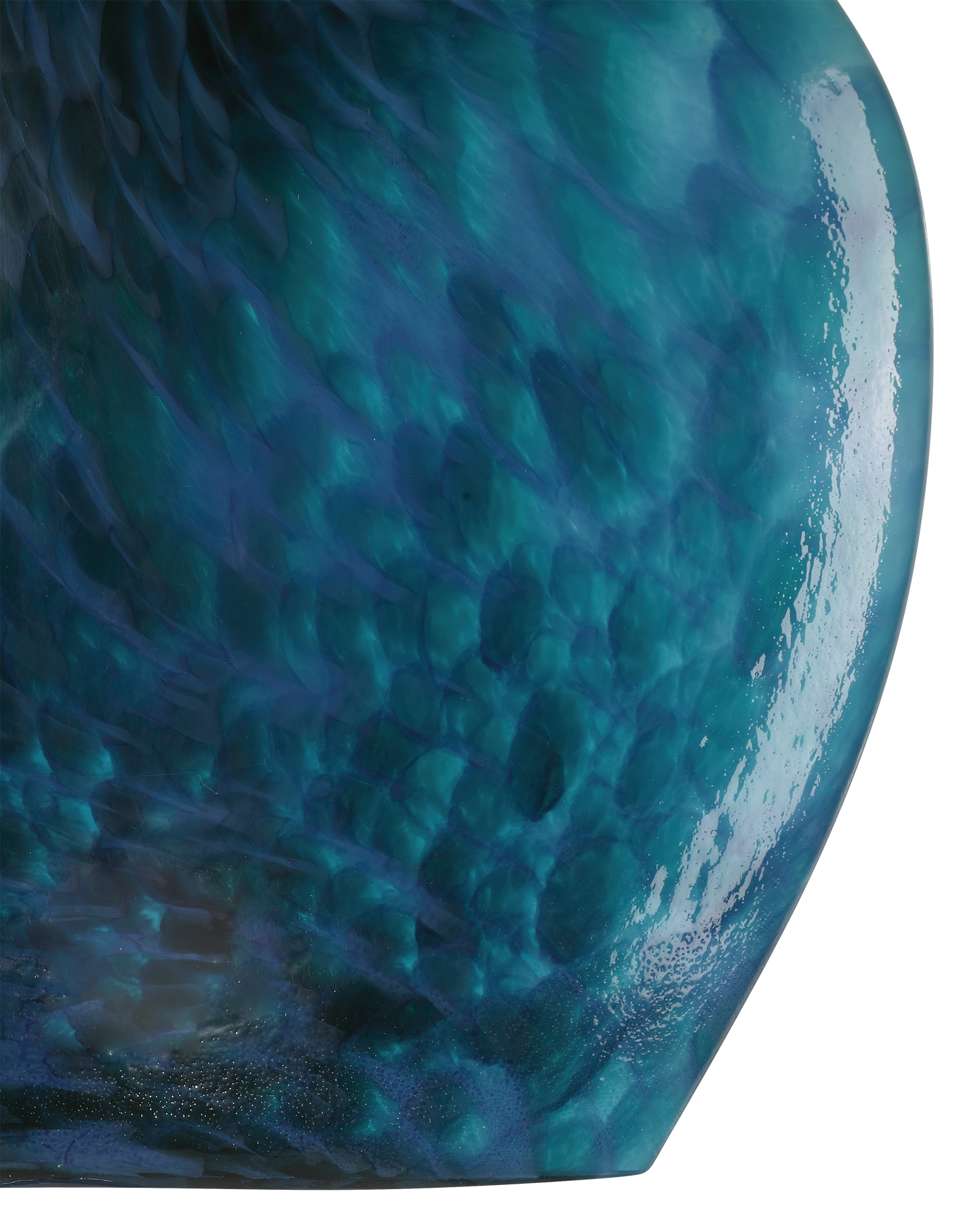 The Pavonini Vase is a mold-made glass vase shaped like an oversized perfume bottle that dazzles in a brilliant shade of blue. The surface seems alive with dynamic movement achieved when deep blue and bright teal glass are expertly fused and marbled. The bold silhouette gives the vase a luxurious appeal. The decorative piece is shallow so it can sit close to the wall to take up less surface space on a console or nightstand.
