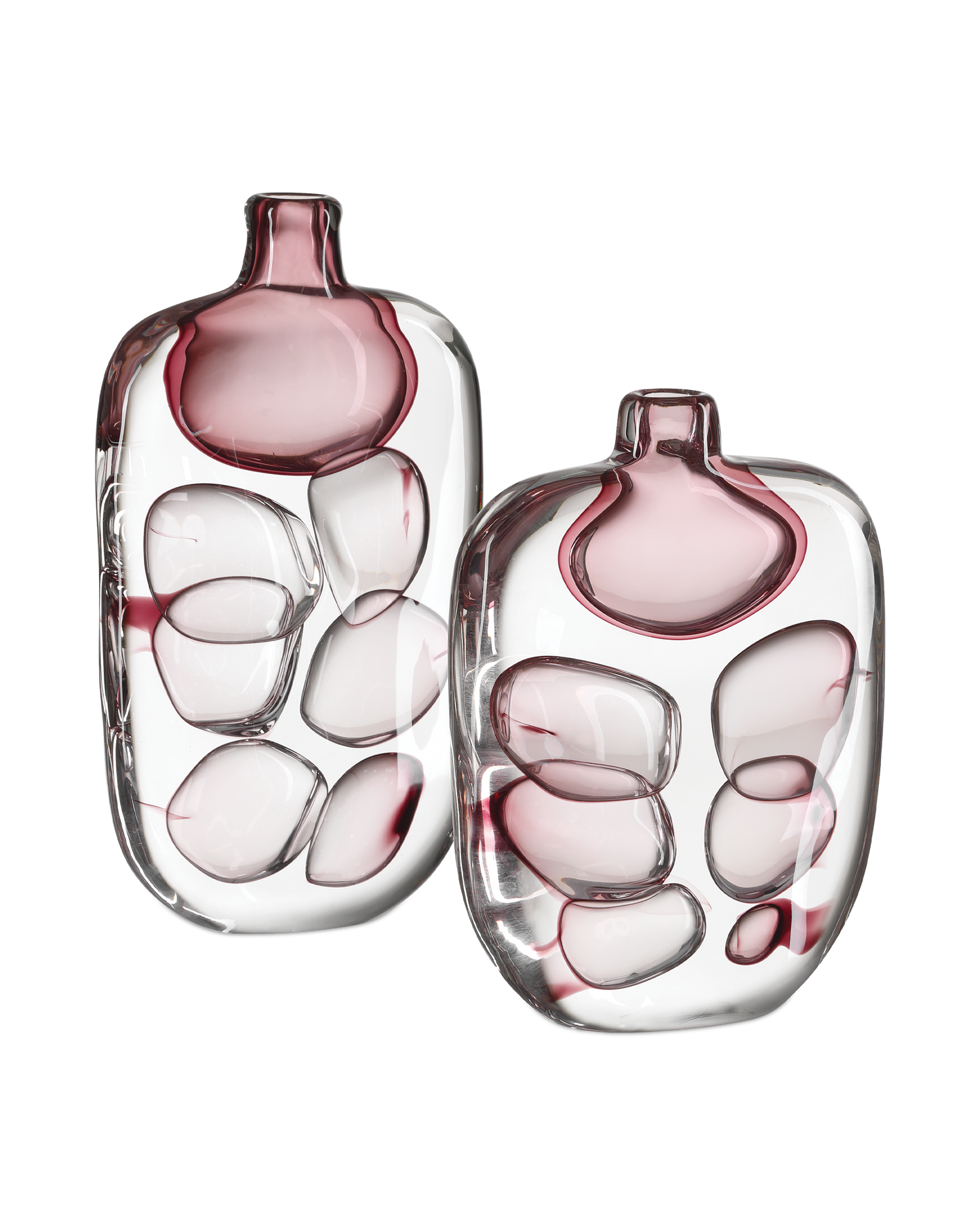 The Vicolino Large Vase is made of clear and purple hand-made glass with organically placed bubbles floating within its overall form. The vase was created using a Venetian glass technique that is very rarely practiced in modern times. The slim silhouette has a shape that is reminiscent of a perfume bottle, the narrowness making the vase ideal for nightstands, smaller consoles, or shelves that are not very deep. Both sculptural and functional, this vase will be a glamorous accent piece in the most sophisticated setting.