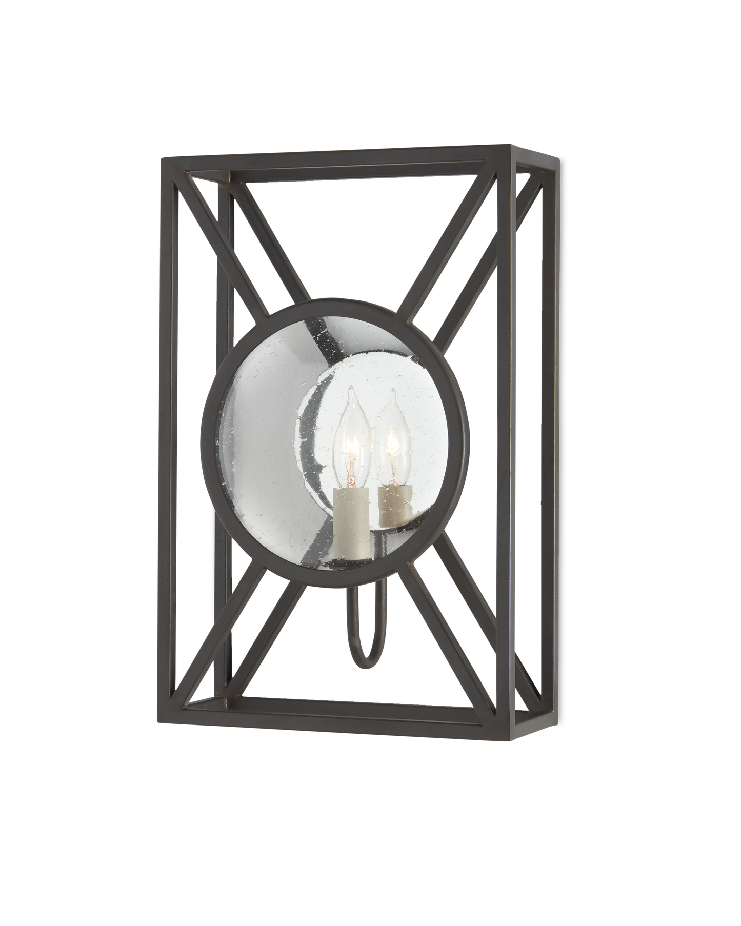 The Beckmore Black Wall Sconce has a mirrored glass reflector that radiates brilliance through a seeded glass front panel. Certified for damp locations, this one-light sconce in an old iron finish is in our Lillian August Collection.