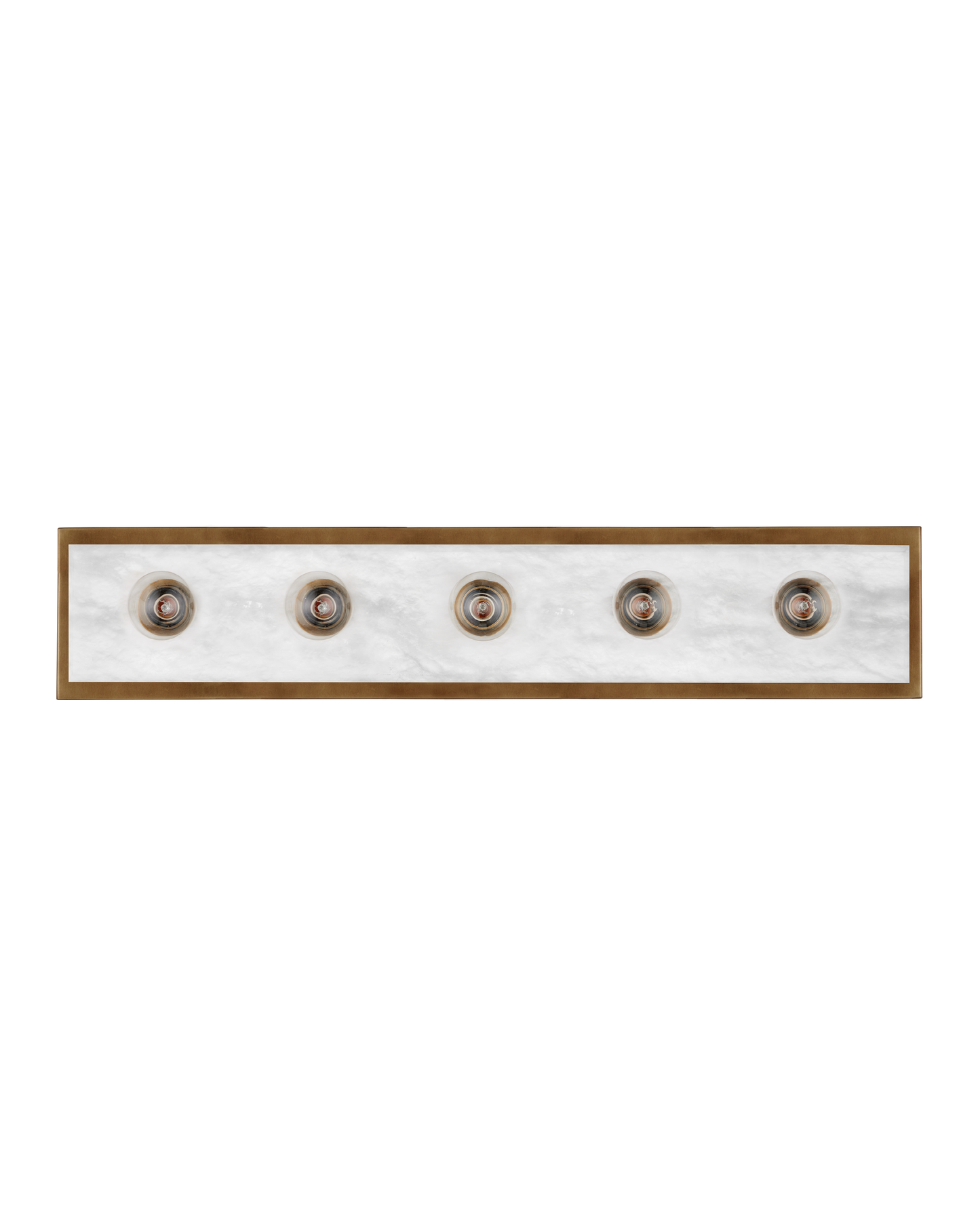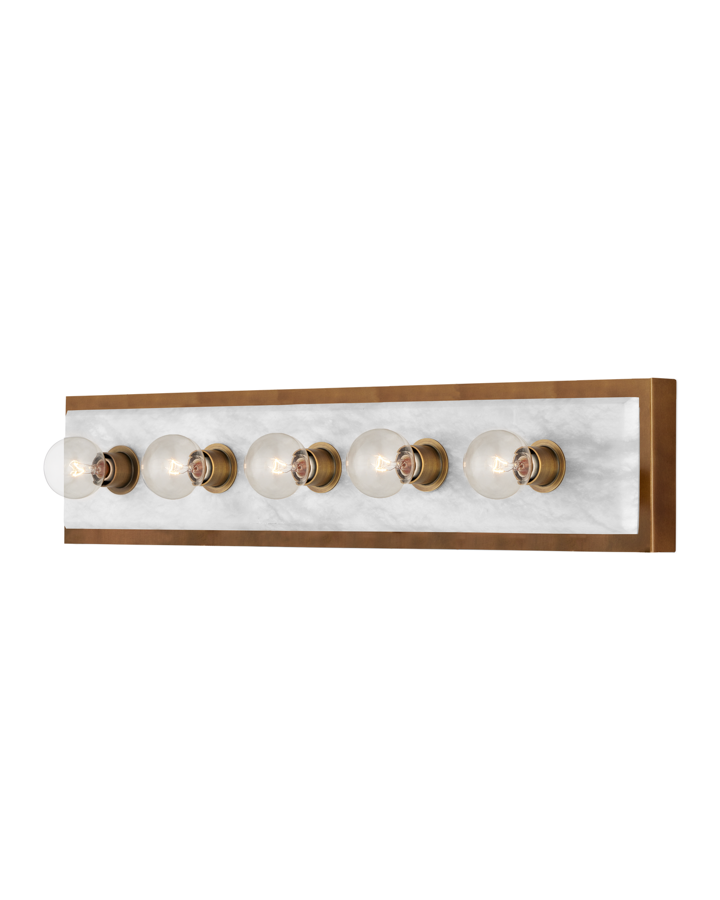 The Berdine Large Brass Bath Bar is a simple design that allows the natural alabaster to shine. Made of metal in an antique brass finish, the warmth of the gold contrasts the coolness of the stone to bring a subtle complexity to this design. It can be mounted vertically or horizontally, and the alabaster panel has a nice bevel to it where it meets the metal rim.