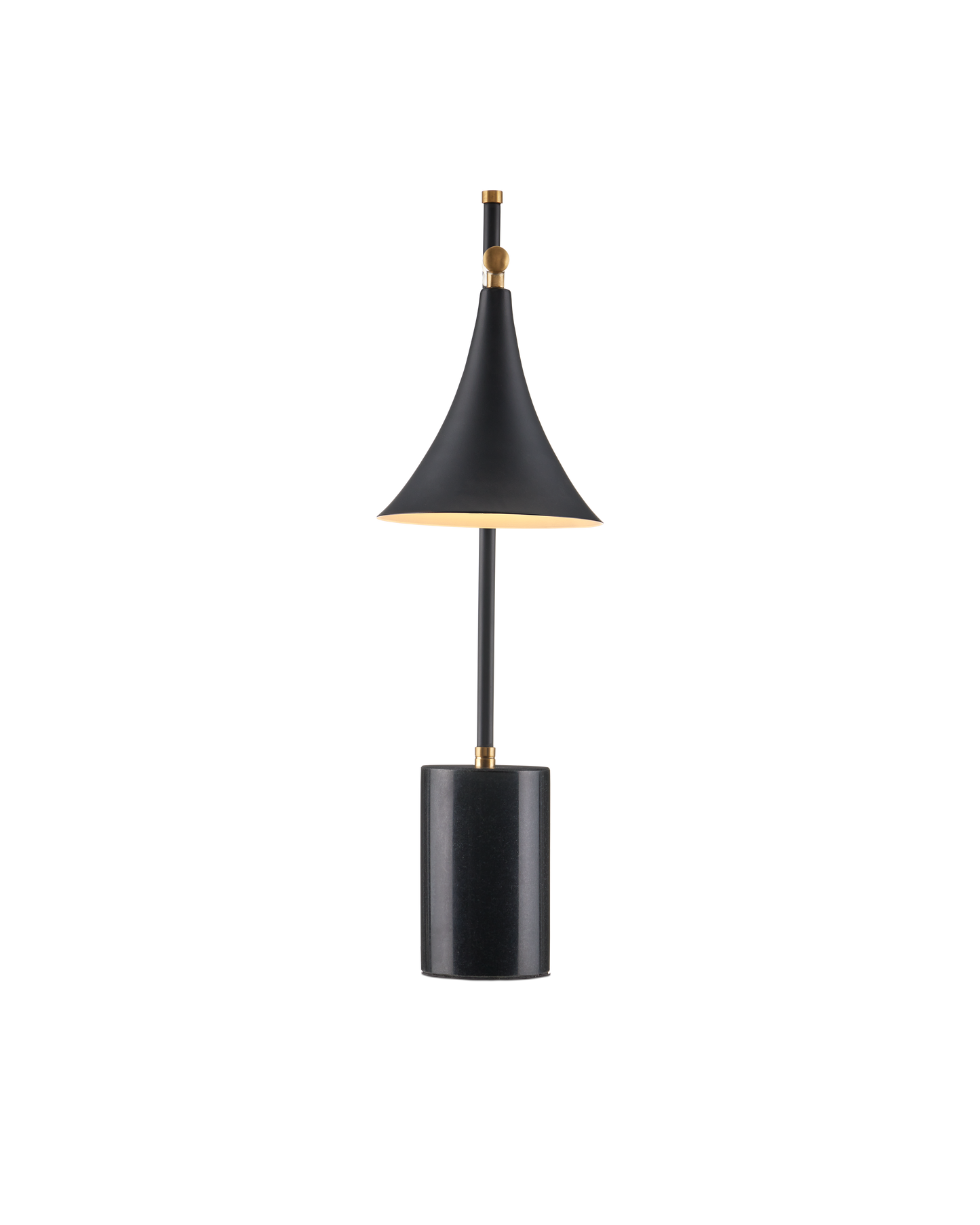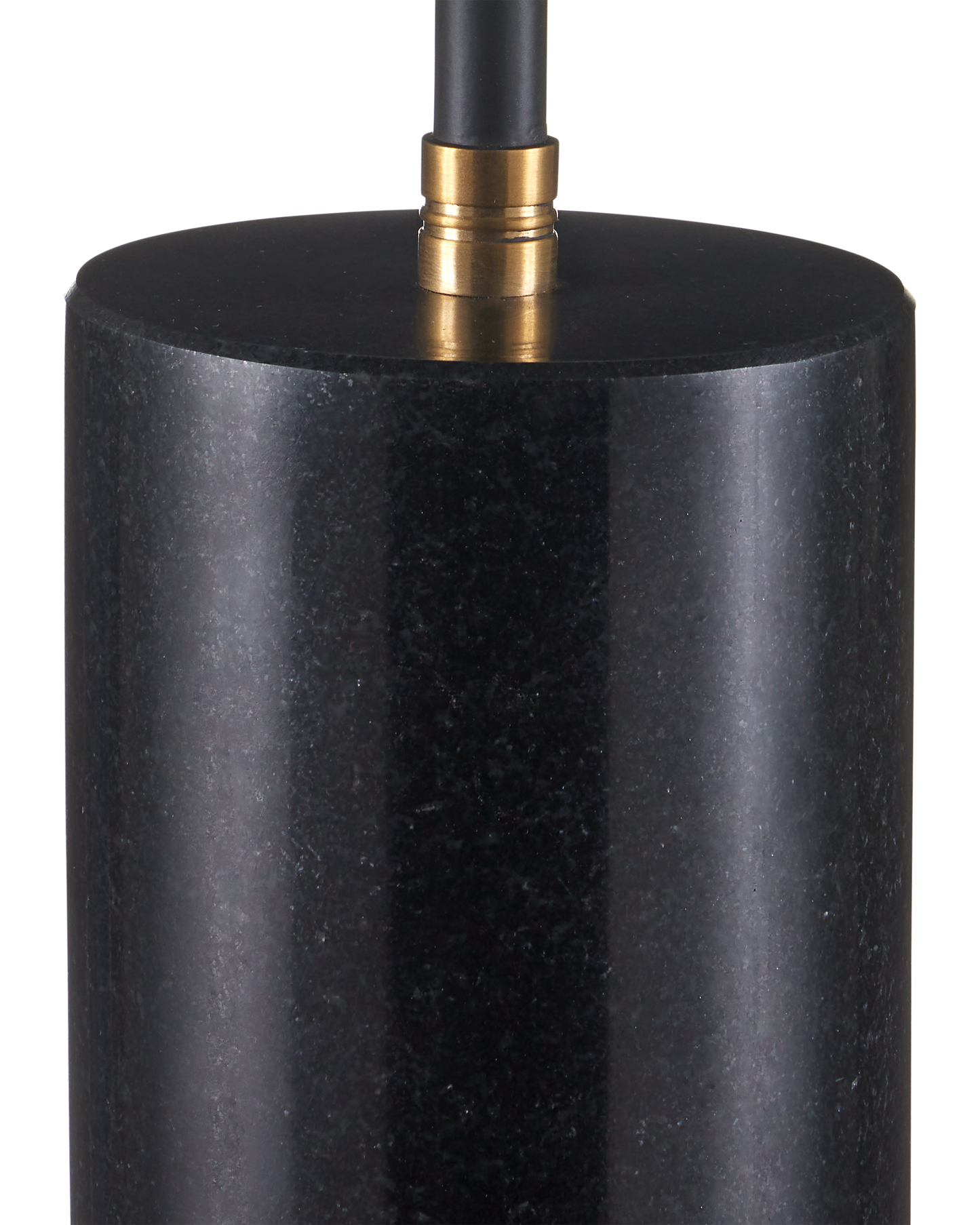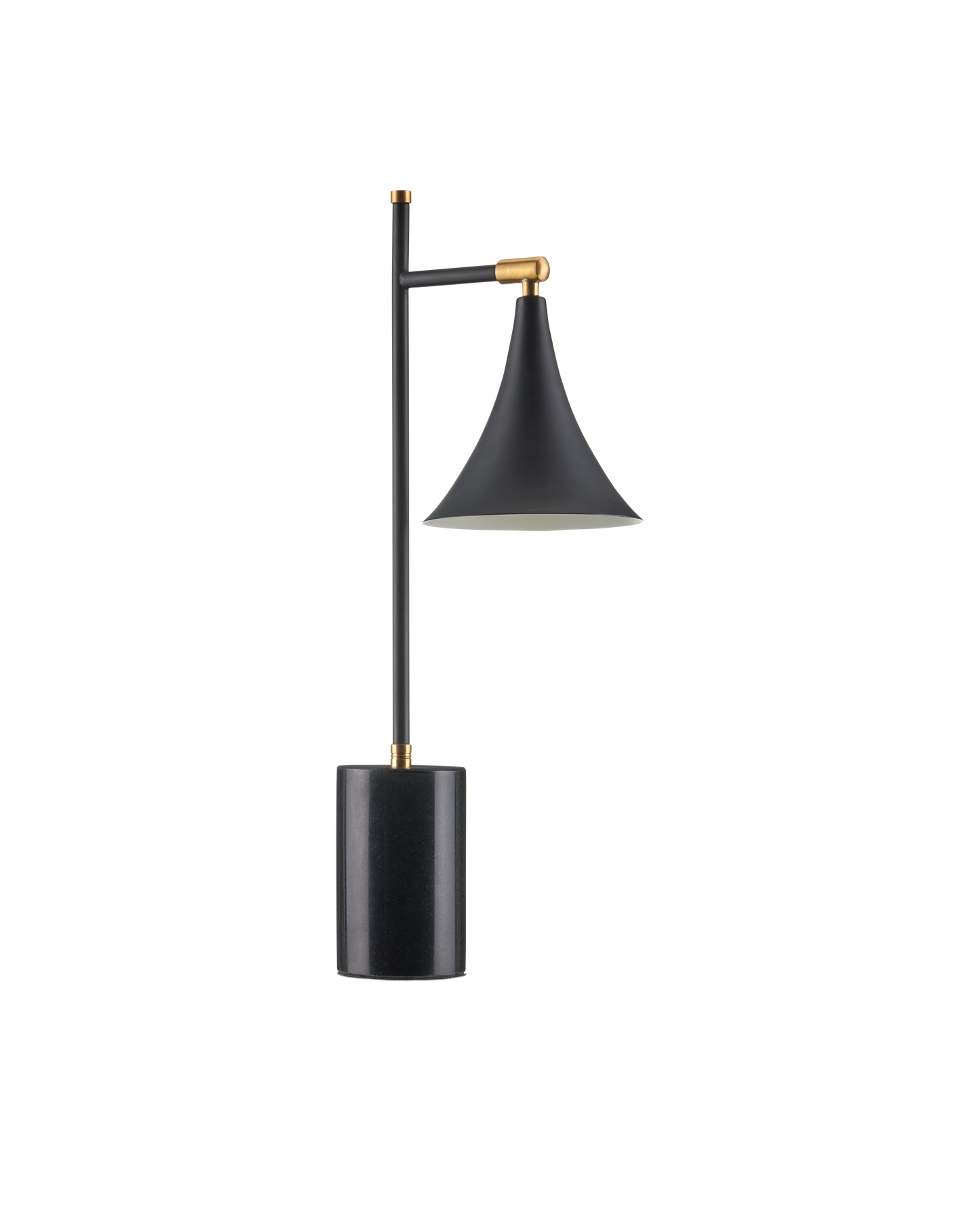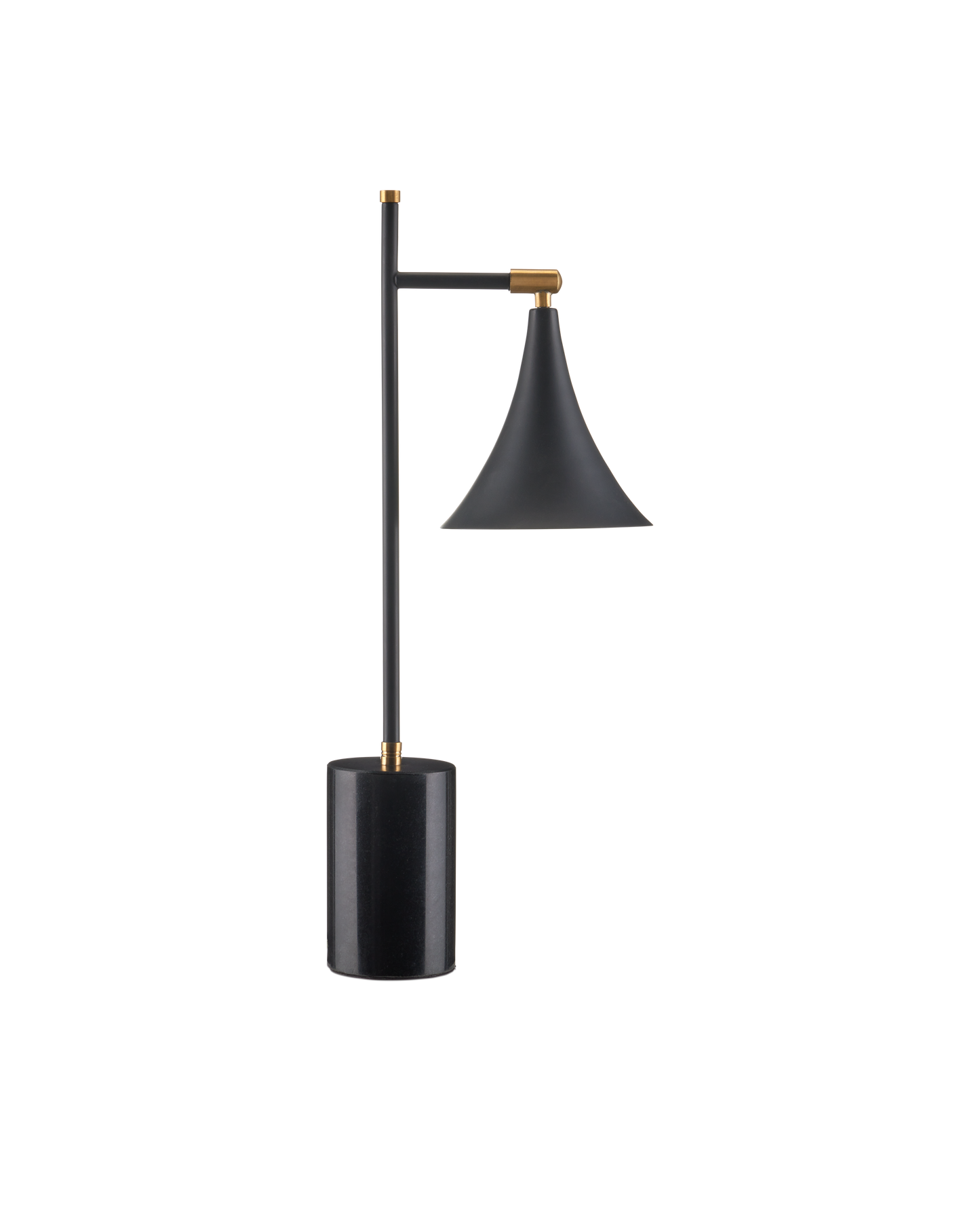 The Bibliophile Table Lamp earns its name with its elegant fluted shade that will cast down-light on the task being undertaken. The thin stem, which rises from a tall cylindrical black marble base, and the shade are in a matte black finish with sophisticated matte brass accents. Though this is a perfect helpmate for a desk, the black table lamp is not adjustable.