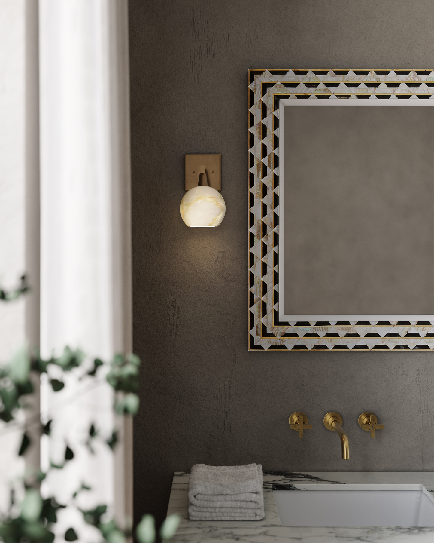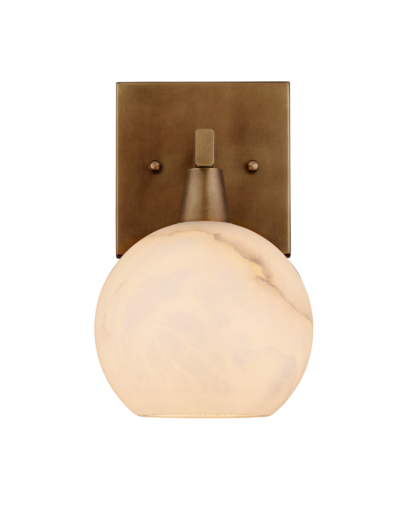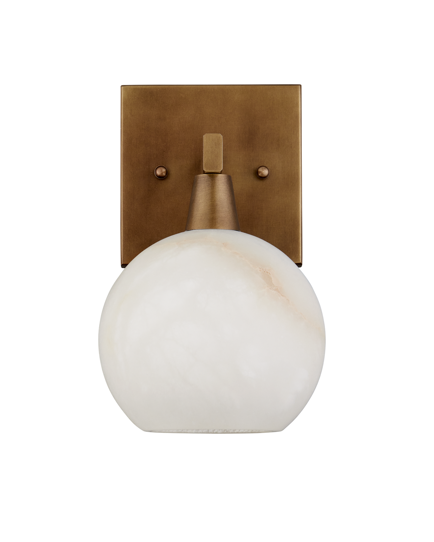 The Bombelles Brass Bath Wall Sconce was designed to spread abundant light over a bathroom counter, the gold sconce joining others in the Bath Collection. The globe will be luminous when it is lit, as it is made of natural alabaster, and the antique brass finish on the metal adds warmth to the design. Alabster is a natural material, so there will be slight variations in each of the fixtures. The Bombelles can be mounted with the globe pointing up or down.