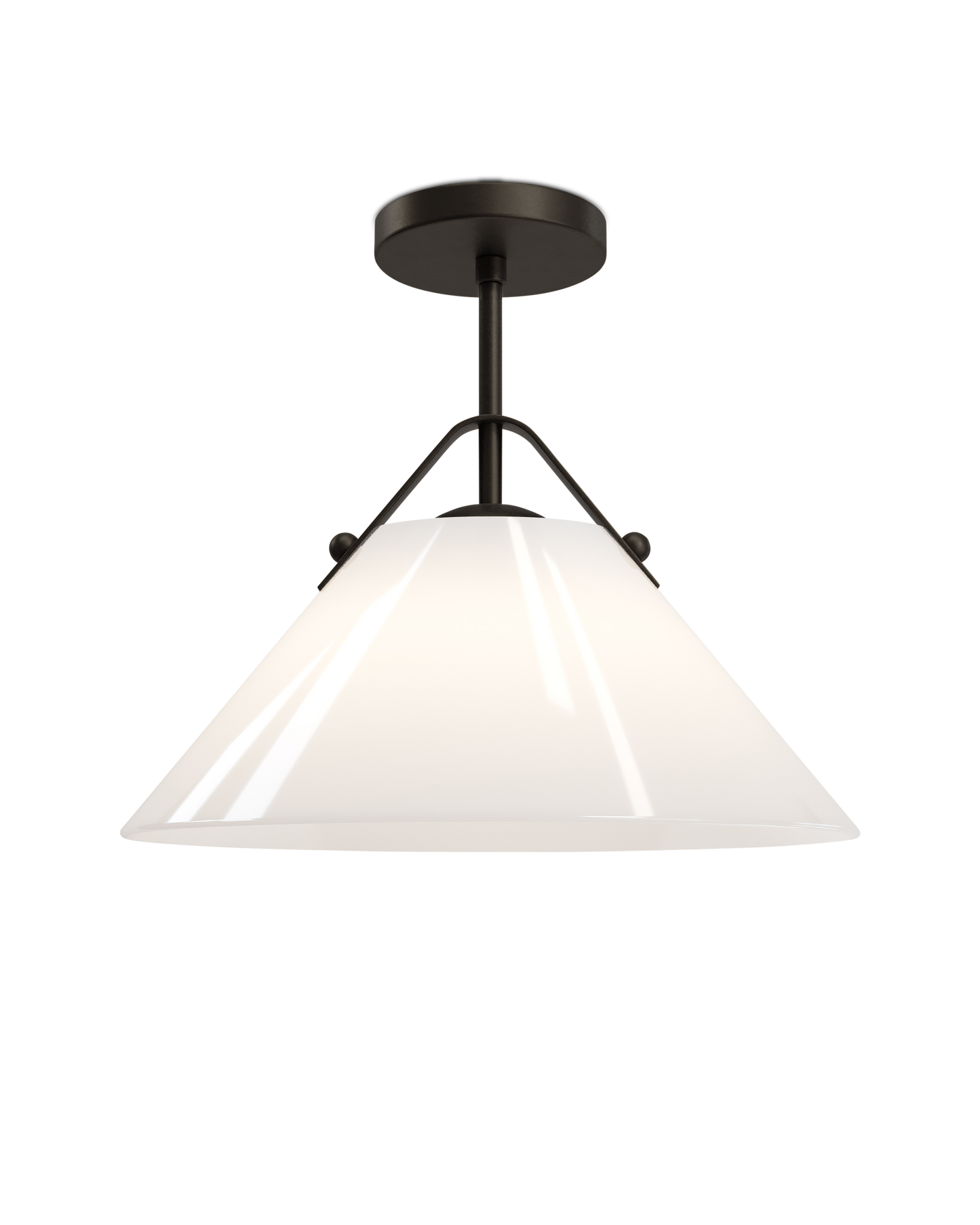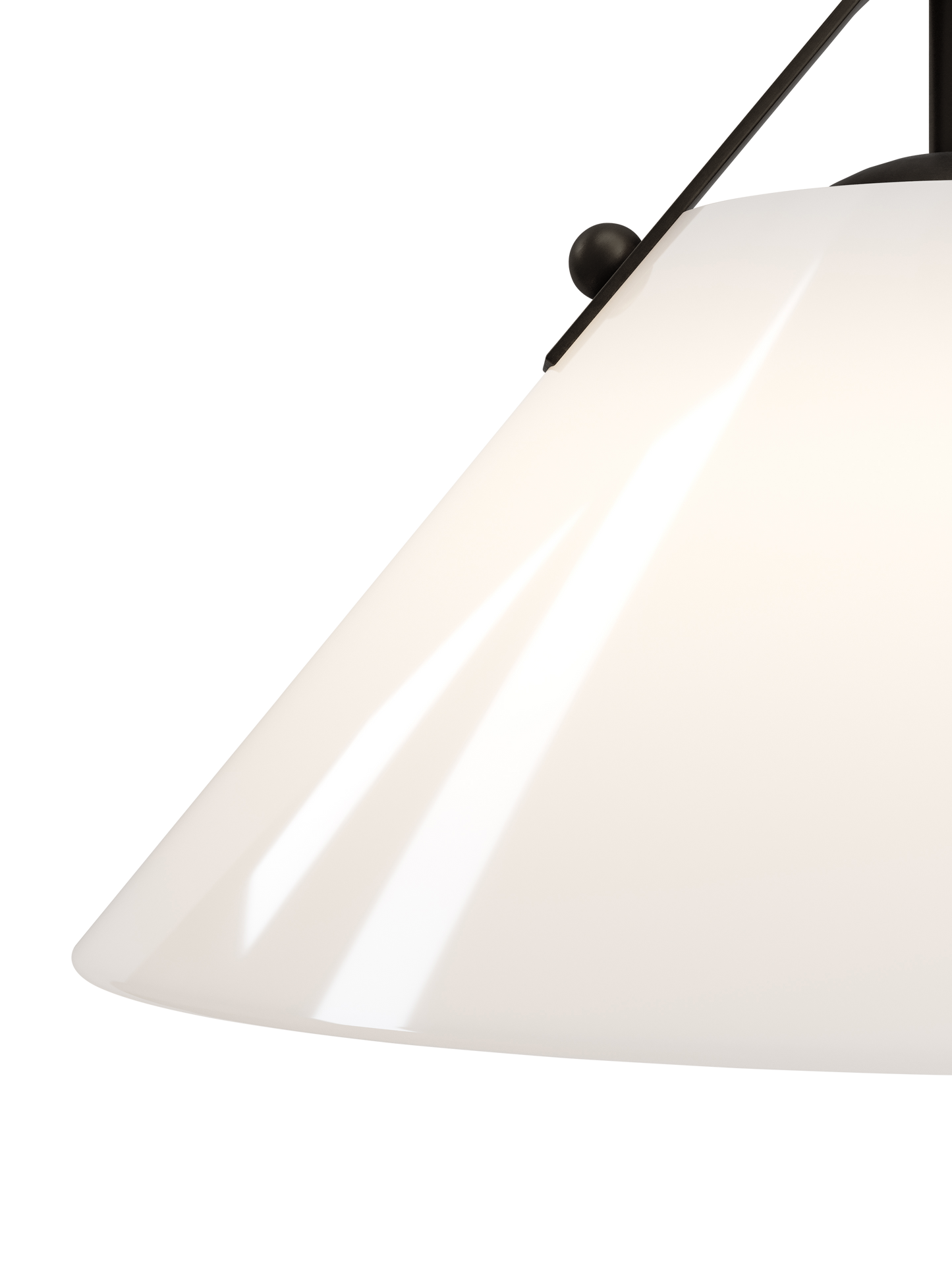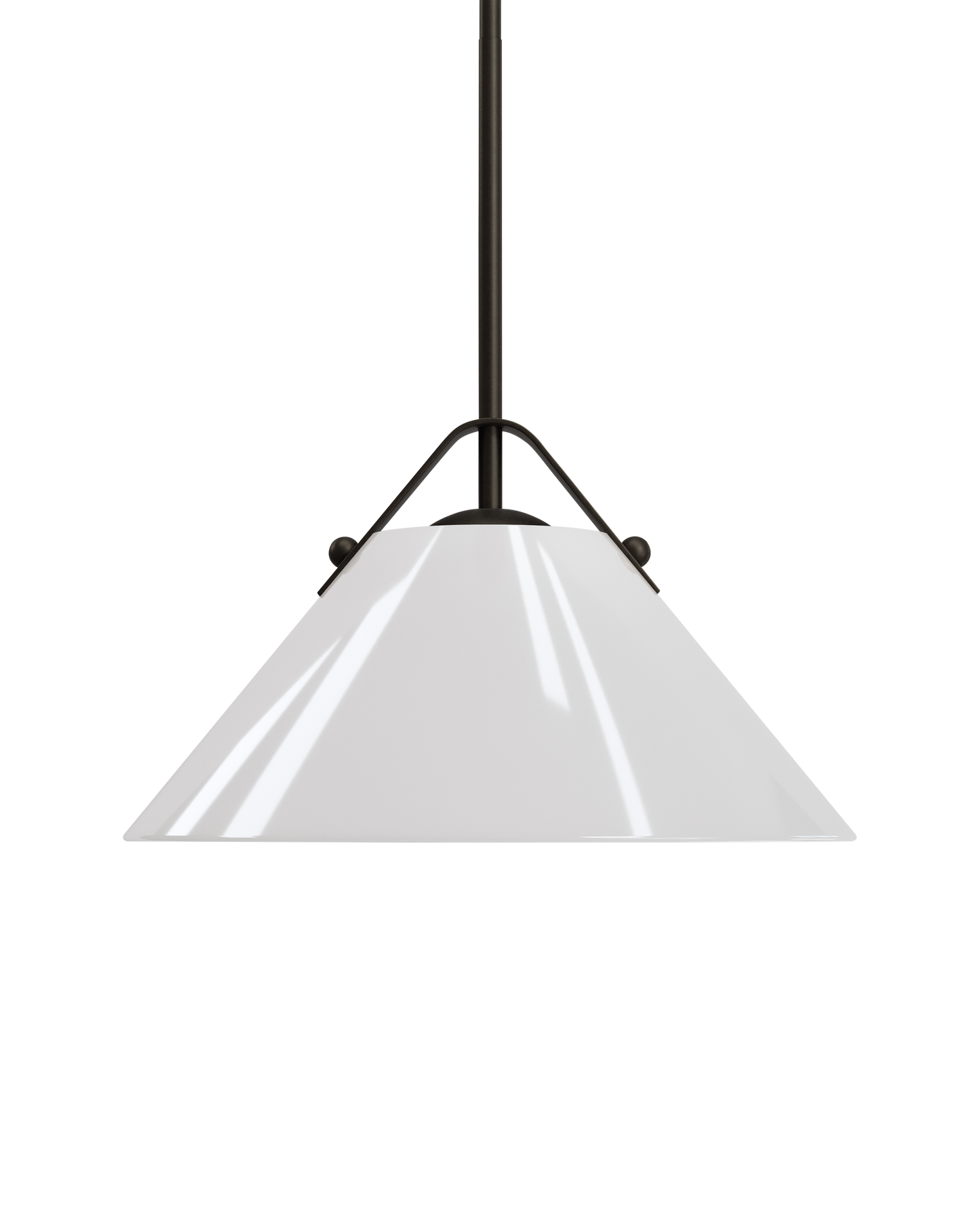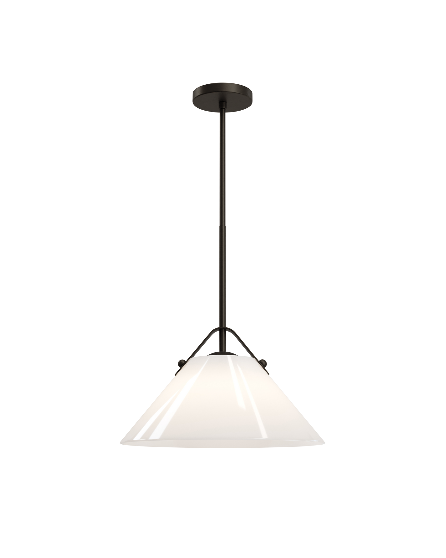 The Bronwen Bronze Pendant is an equestrian-inspired design with a flaring white glass shade fastened to the round canopy with a sophisticated strapa subtle nod to classic tack hardware. The profile can lean modern farmhouse, though it also complements other design styles. The metal in an oil-rubbed bronze finish is a nice contrast to the paleness of the shade, which has a glossy surface that glows. At 19 inches in diameter, the one-light pendant is dimmable. Adjustable from 18" to 60" with use of included chain/rod kit/cable. If your space calls for a longer drop, additional chain/rods/cable is available for purchase.