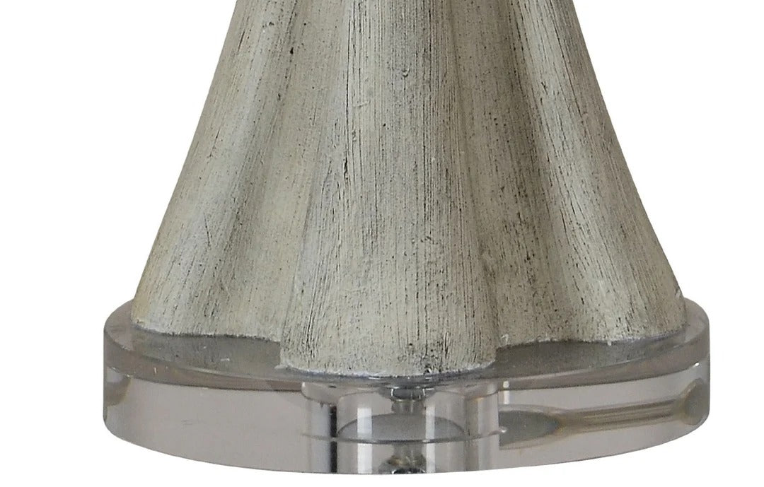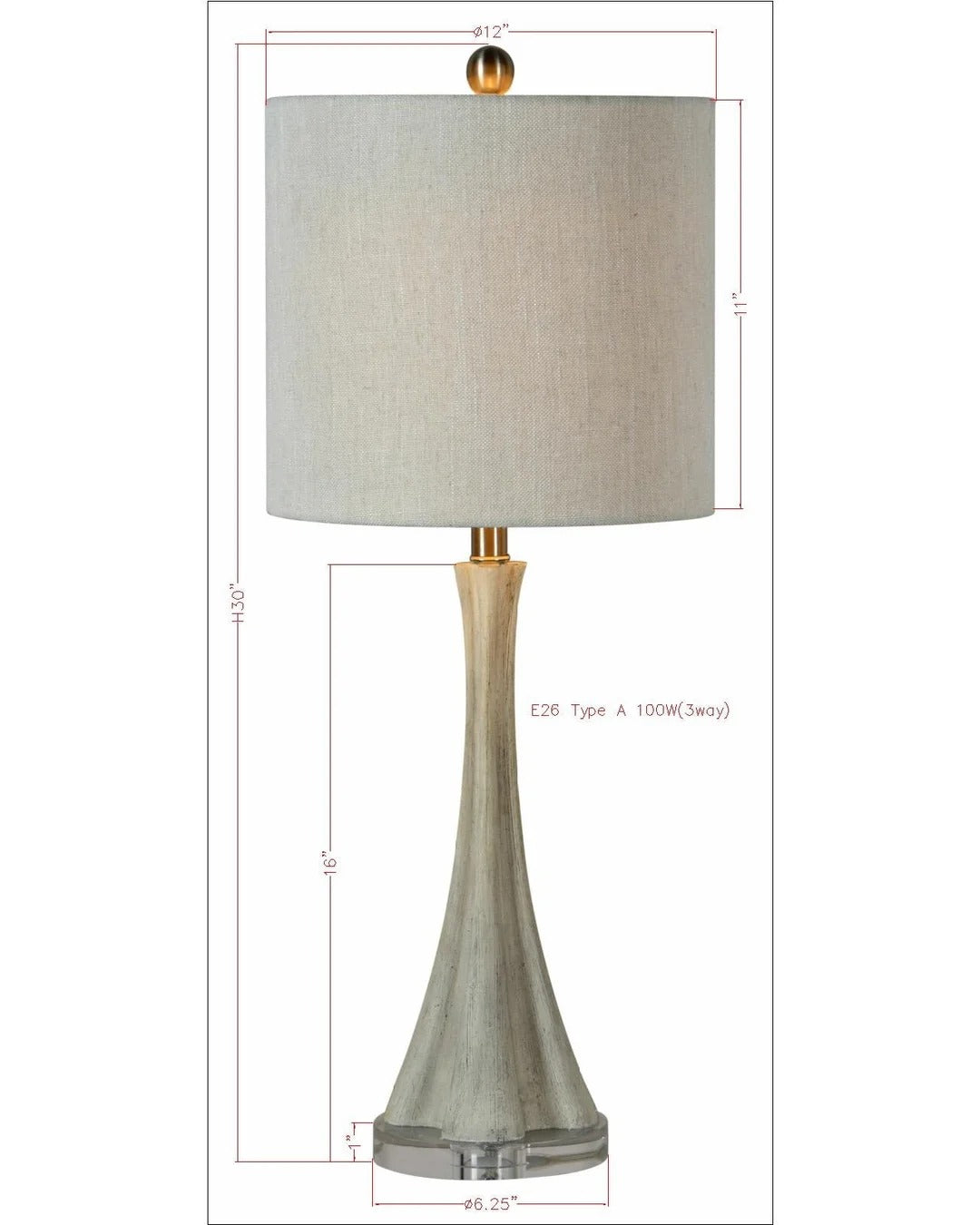 Sleek, gracious & transitional best describe this smooth wood-look design. Done in a beautiful grey and white finish sitting on top of a crystal base. Its long neck base that gracefully tapers at the top creates a feminine and graceful design. It is complimented by silver hardware and a natural linen drum shade to complete its neutral gray tone look!