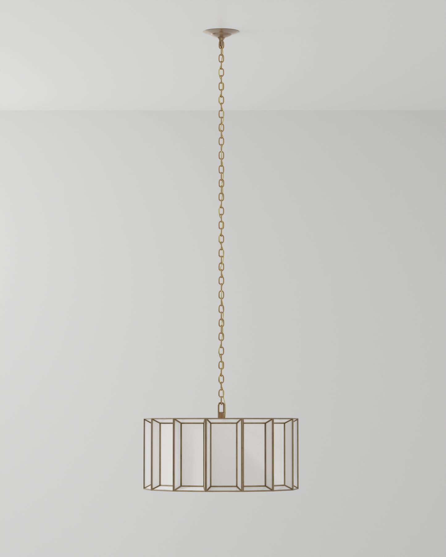 When a soft glow is desired, milk glass is one of the best materials to diffuse illumination. Our Daze Large Pendant is made of articulated panels of white milk glass that are joined together by ribs of metal in an antique brass finish. This white pendant will turn luminous when it is switched on. Adjustable from 19.5" to 87.5" with use of included chain/rod kit/cable. If your space calls for a longer drop, additional chain/rods/cable is available for purchase.