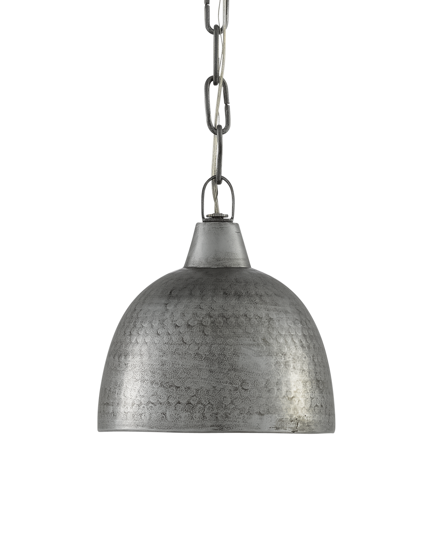The Earthshine Steel Small Pendant has a hammered dome shape for a cool industrial look. Made of iron in a blackened steel finish, this sturdy silver pendant has a luminous glow on the interior. Adjustable from 14" to 84" with use of included chain/rod kit/cable. If your space calls for a longer drop, additional chain/rods/cable is available for purchase.