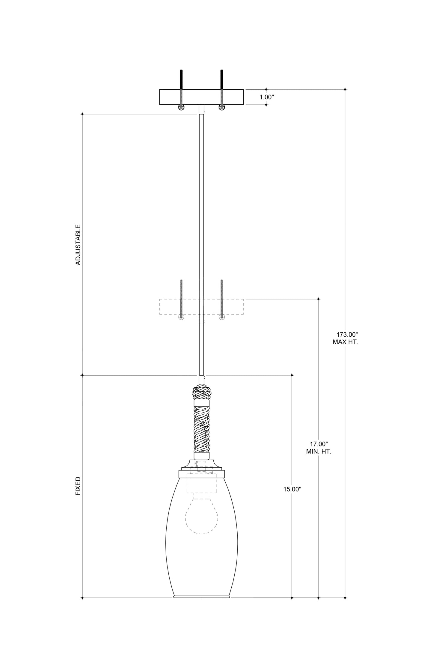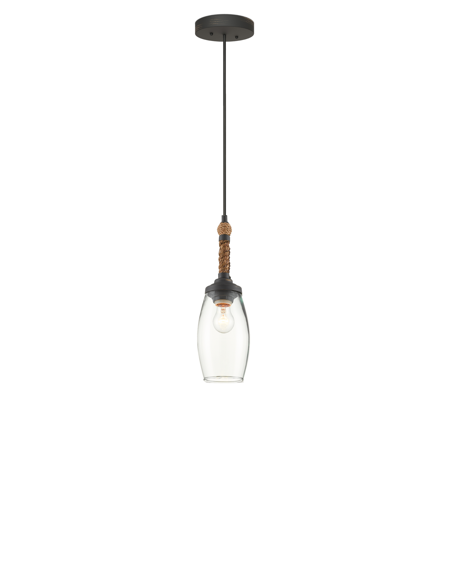The perfect combination of natural and industrial materials, the Hightider Pendant has a recycled glass shade and wrought iron hardware in a French black finish. The Abaca rope that is wrapped around the neck of the nautical pendant brings it a hint of texture. Inspiration came from the small bells used by people selling ice cream in the Philippines. Adjustable from 17" to 173" with use of included chain/rod kit/cable. If your space calls for a longer drop, additional chain/rods/cable is available for purchase.