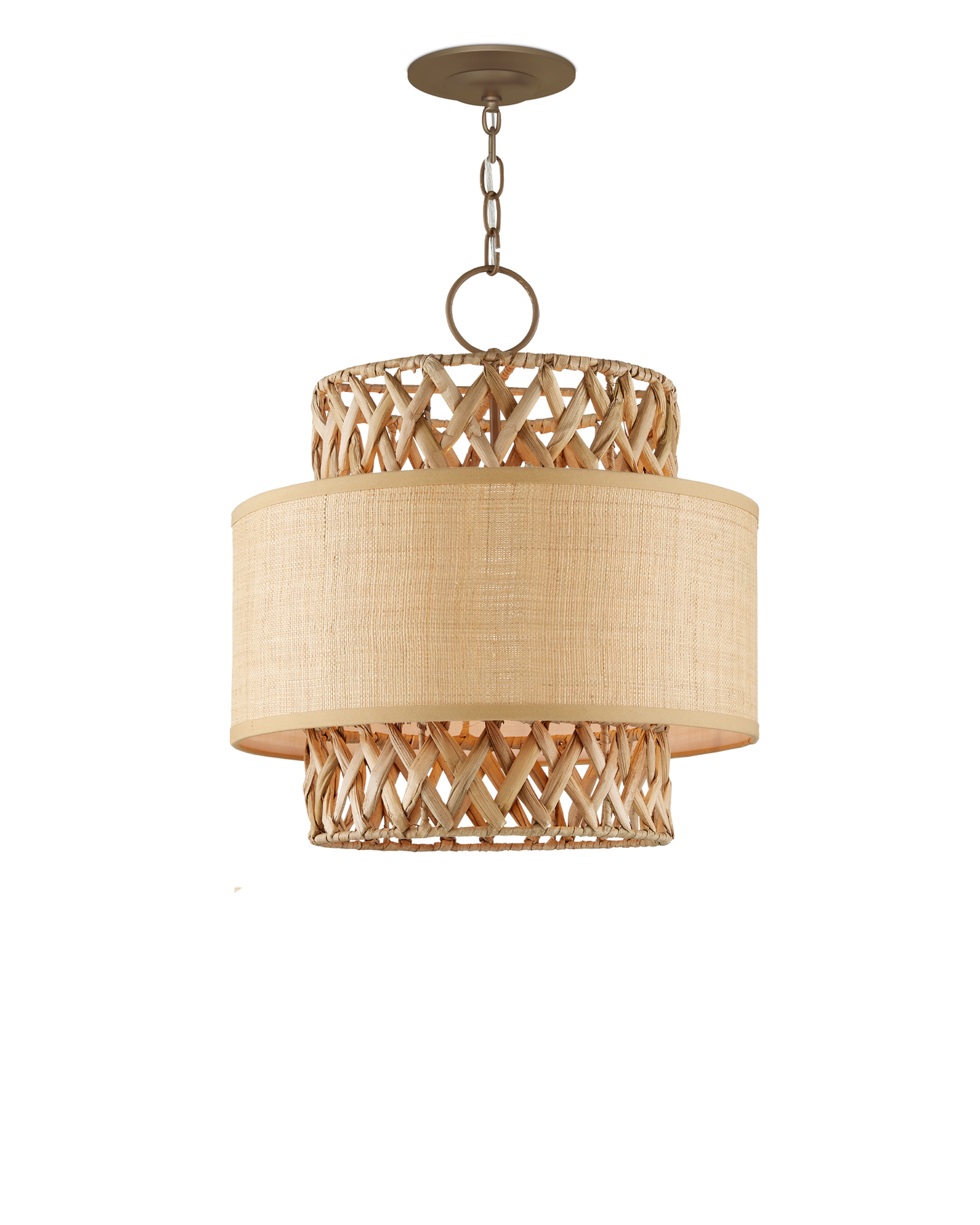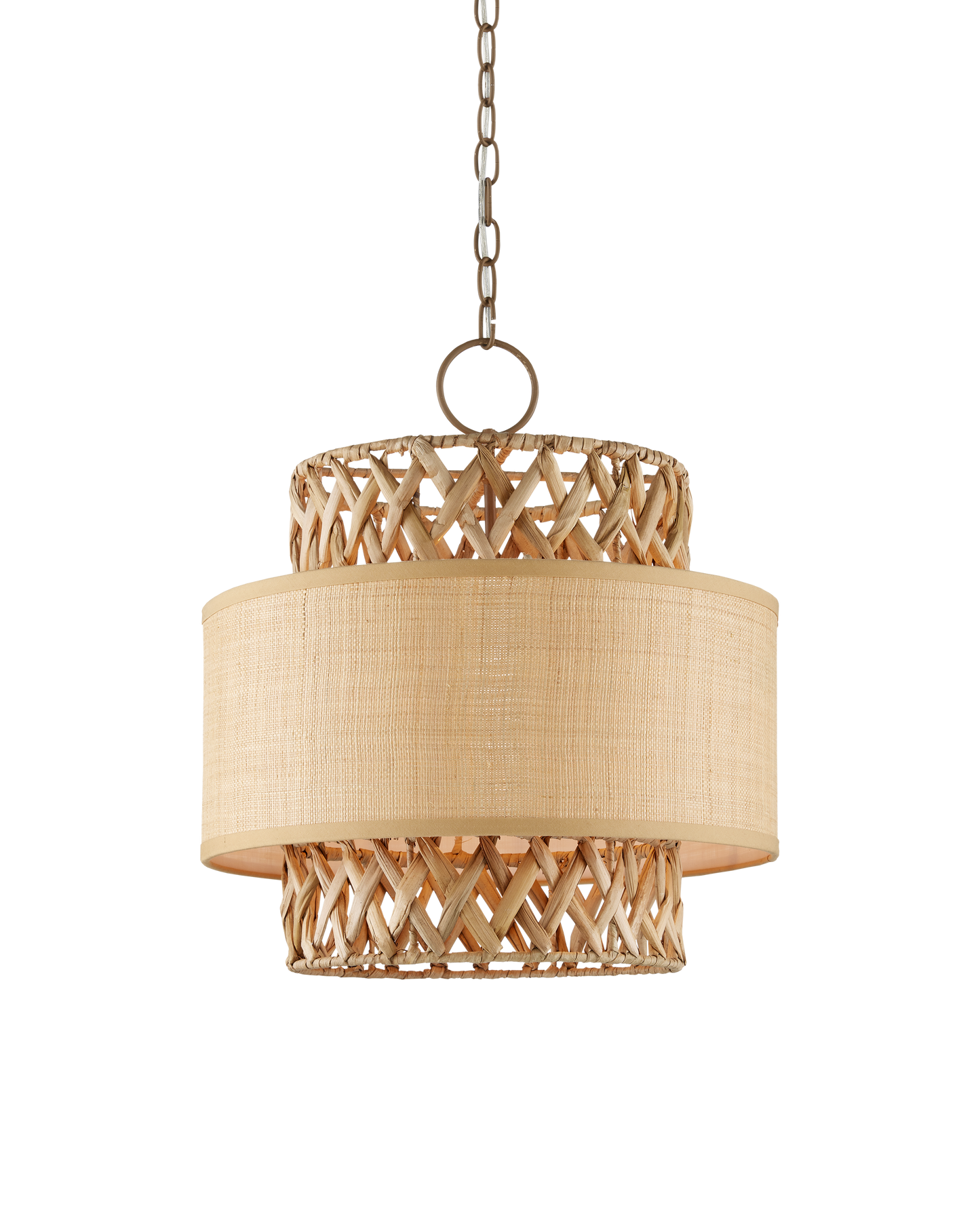 The natural material story continues with the Isola Pendant with its wrought iron frame in a khaki finish and mix of natural water hyacinth and grasscloth fabric. The smaller, taller cylinder that encircles the light has a rough luxe weave of the water hyacinth; while the wider, shorter cylinder has a tighter weave that juxtaposes the looser crosshatching on this tan pendant. Both the interior and exterior of the inner geometric form are finely finished to create a refined and sophisticated product. Adjustable from 25" to 99" with use of included chain/rod kit/cable. If your space calls for a longer drop, additional chain/rods/cable is available for purchase.