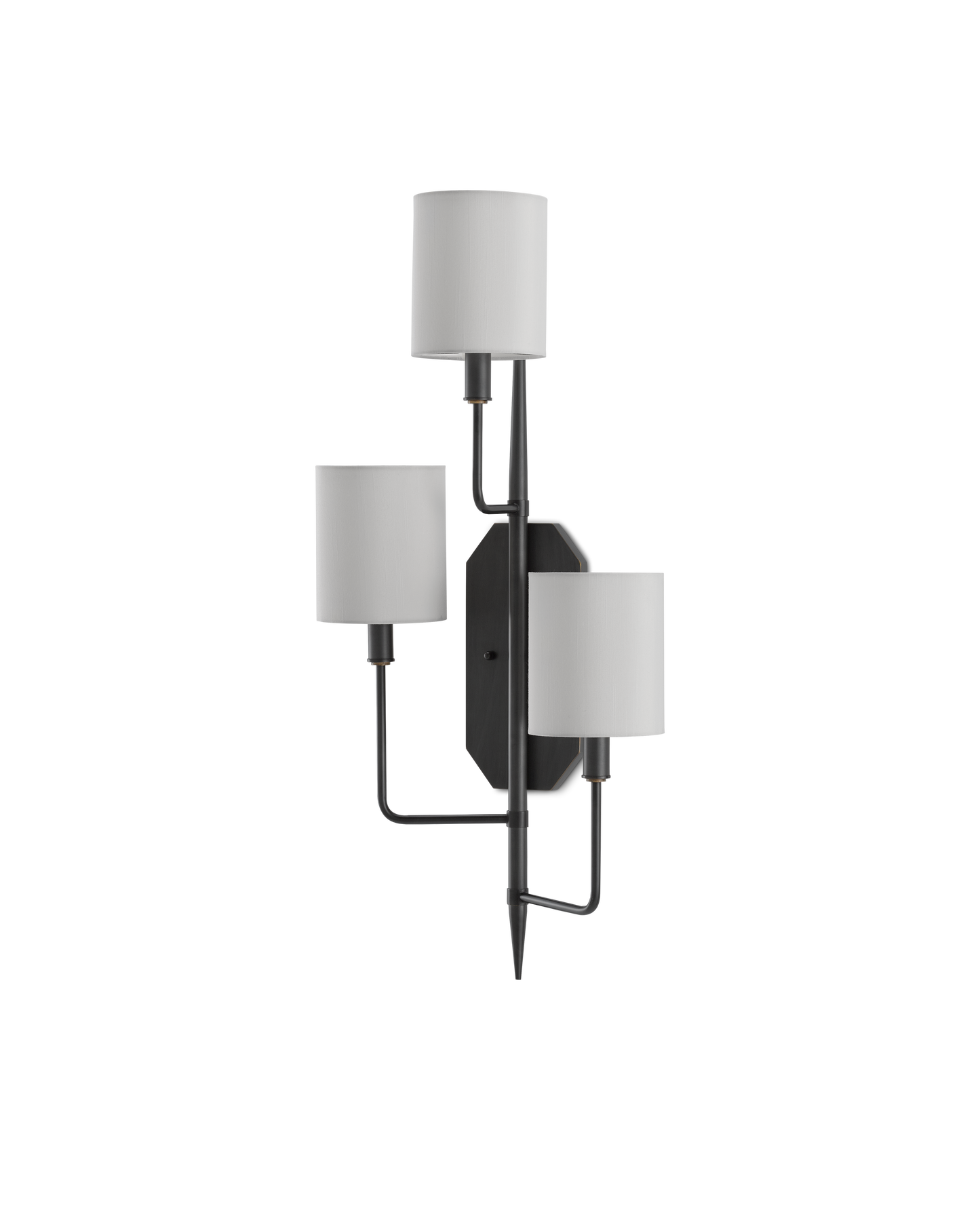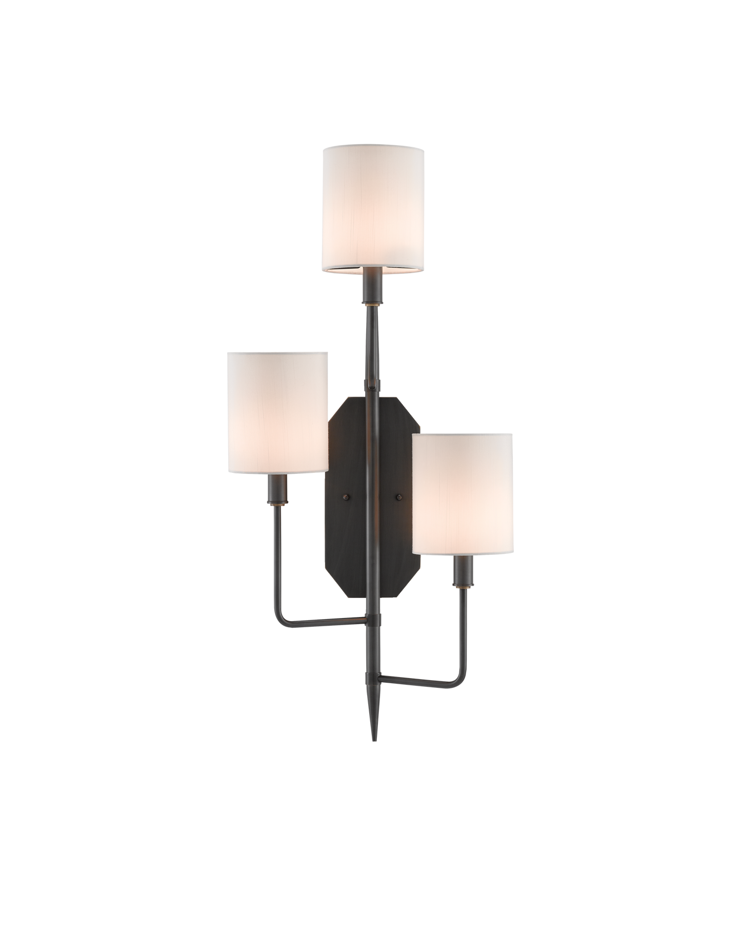 The Knowsley Left Wall Sconce has a thin armature in an oil-rubbed bronze finish that holds three tailored off-white shantung shades. The thinness of the arms and stem make this sconce a light design until the dark finish was added to give the bronze sconce heft.