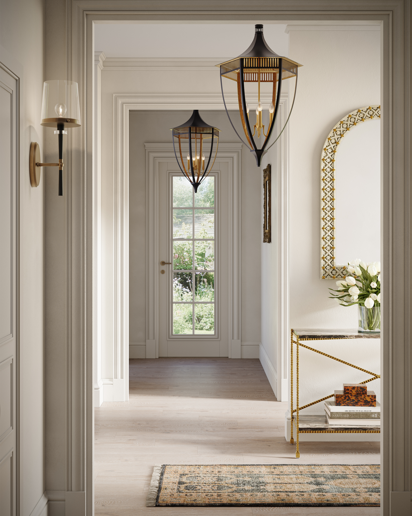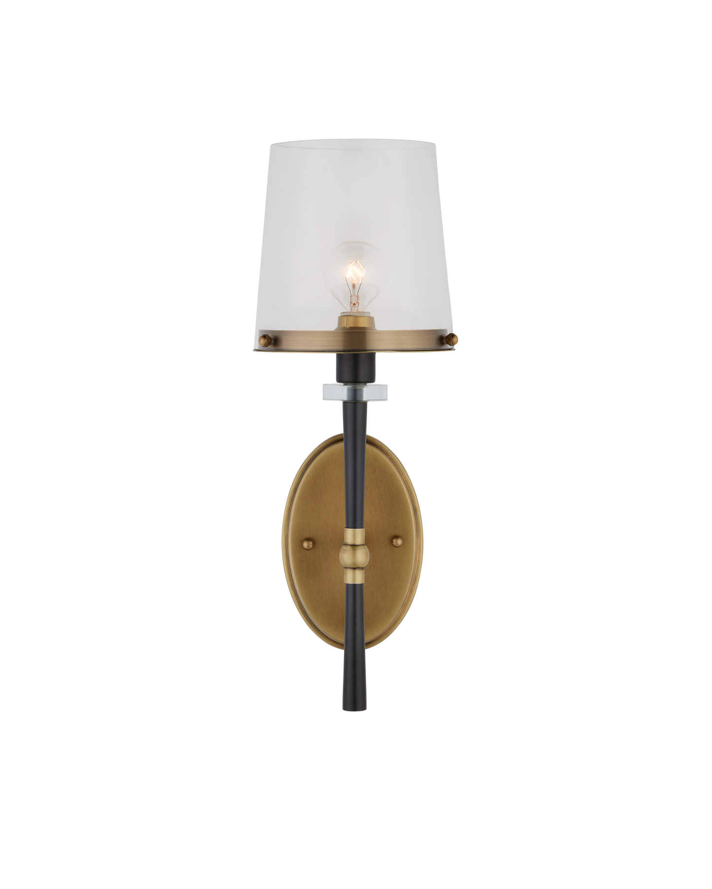 We designed the Lyndall Wall Sconce with simple shapes in mind. The clean feel of the glass shade and the unobtrusive fasteners that affix it to the metal ring, which match the fasteners on the wall-plate, contribute to the appeal. The antique brass finish on the top ring and wall-plate contrast the oil-rubbed bronze on the stem, which has several stylish accents: an optic crystal disc just before it meets the shade and a geometric fitting at its narrowing center.