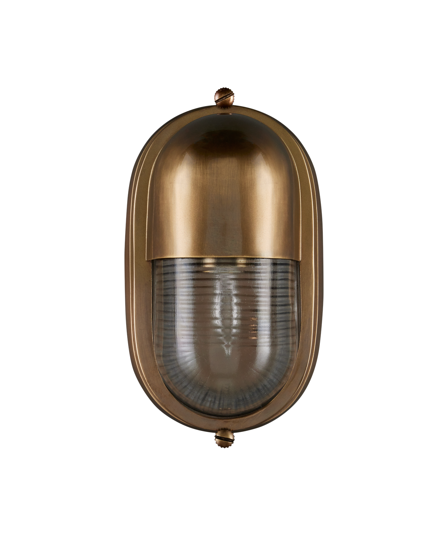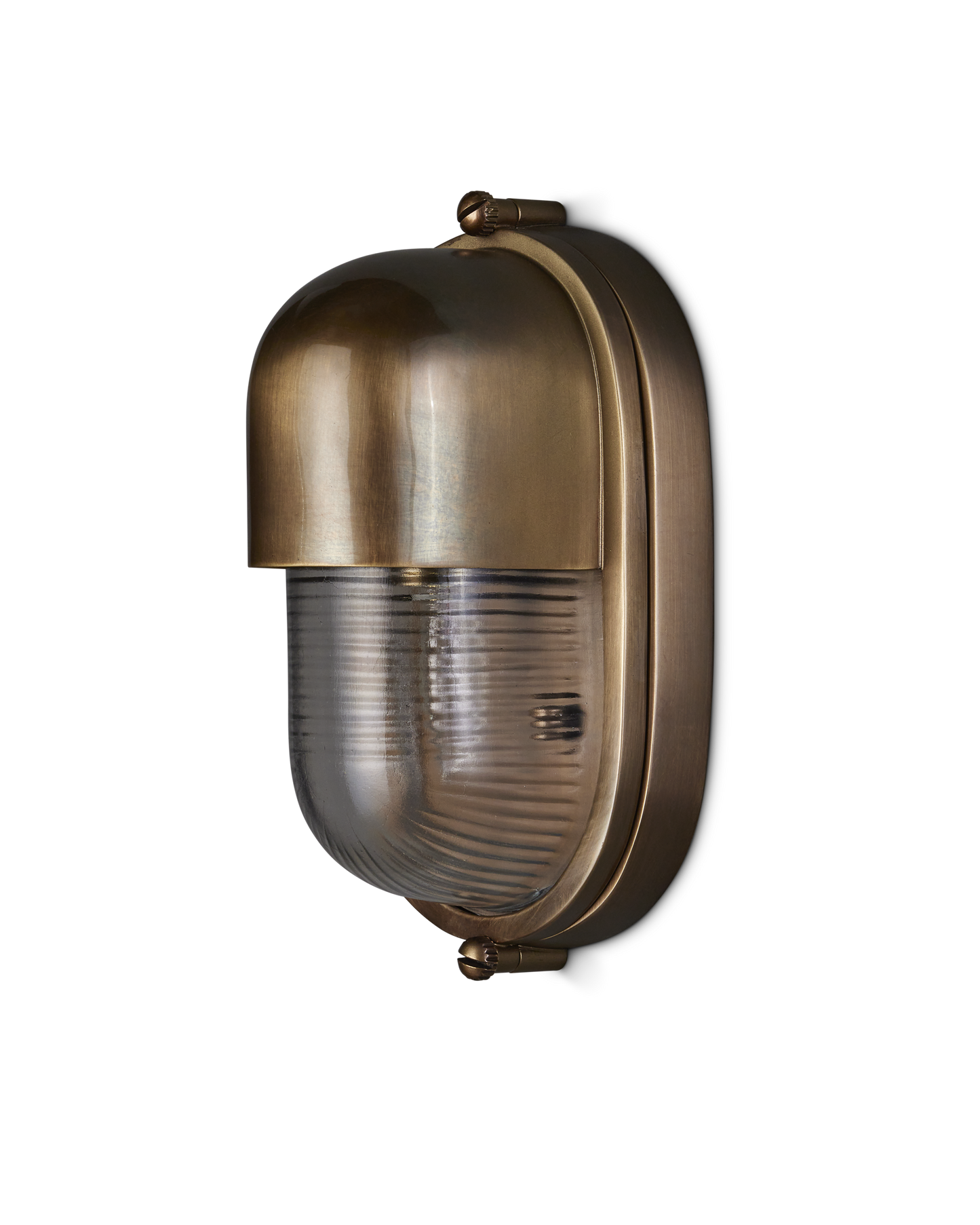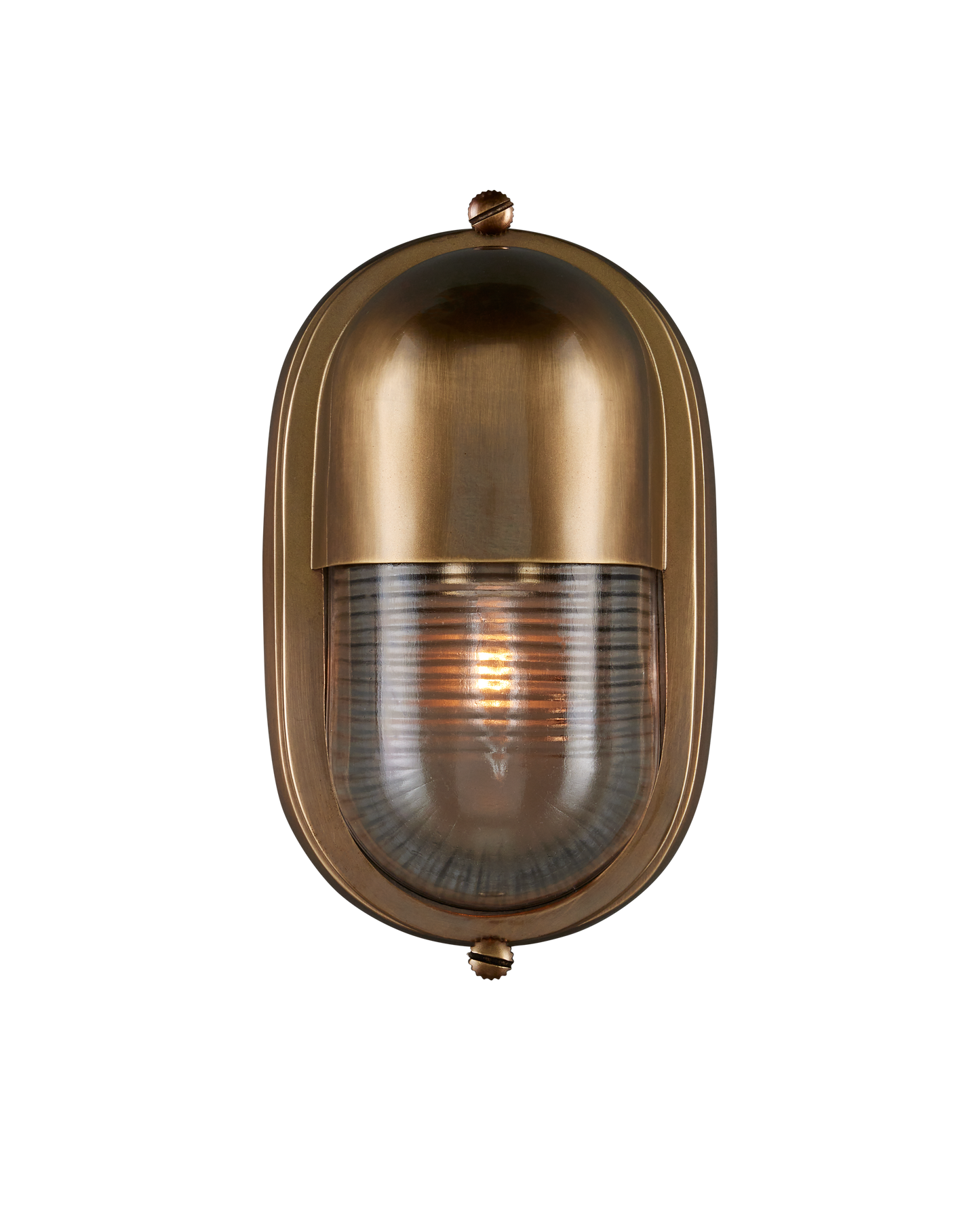 The Maritime Brass Outdoor Wall Sconce has its sea legs, so to speak, given it has the quintessential design attributes that have sailed the oceans for centuries. The antique brass body holds the ribbed glass shade in place. This gold outdoor sconce is a perfect choice for coastal environments given its stylistic notes harken to luxury yachts and schooners.