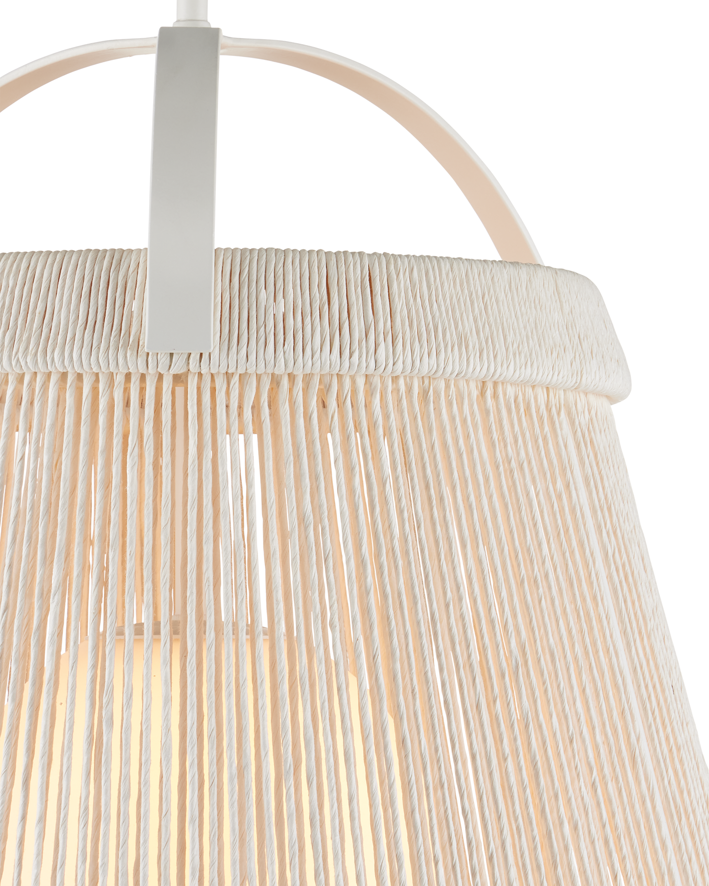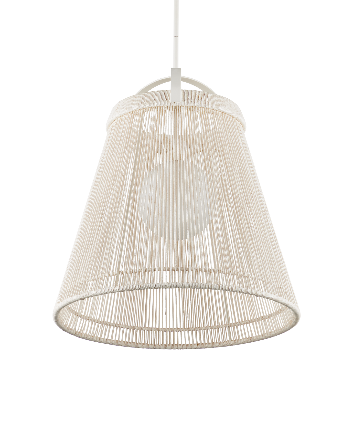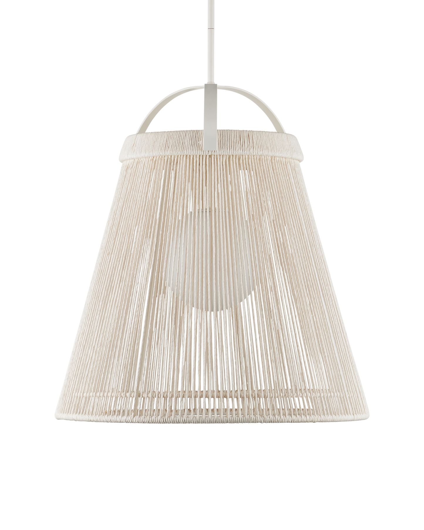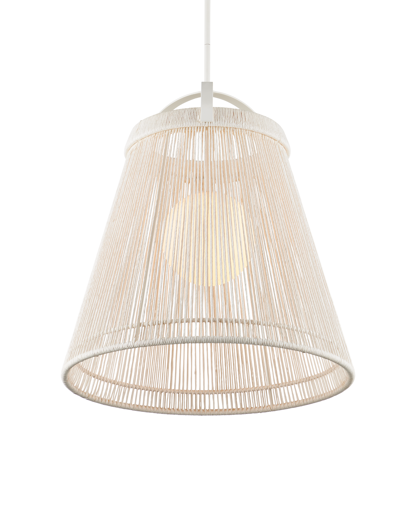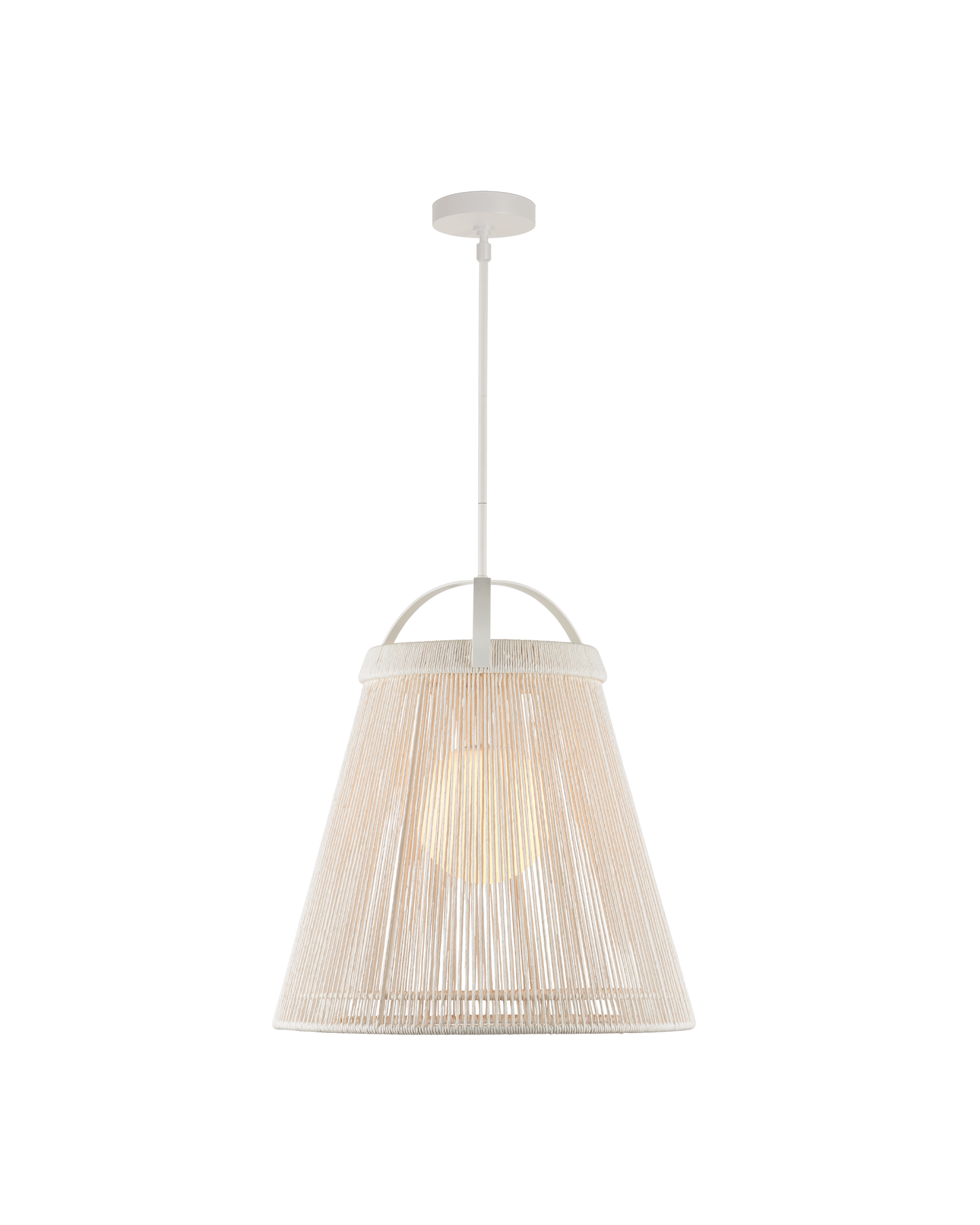 The Parnell Medium White Pendant resembles a bell made of Kraft Paper twine that is painstakingly double-wrapped on both the outside and the inside of the wrought iron frame in a gesso white finish. A frosted white glass globe holds the one light, which is dimmable, within the textured shade that flares to 24 inches in diameter at the bottom. Adjustable from 32.75" to 74.75" with use of included chain/rod kit/cable. If your space calls for a longer drop, additional chain/rods/cable is available for purchase.
