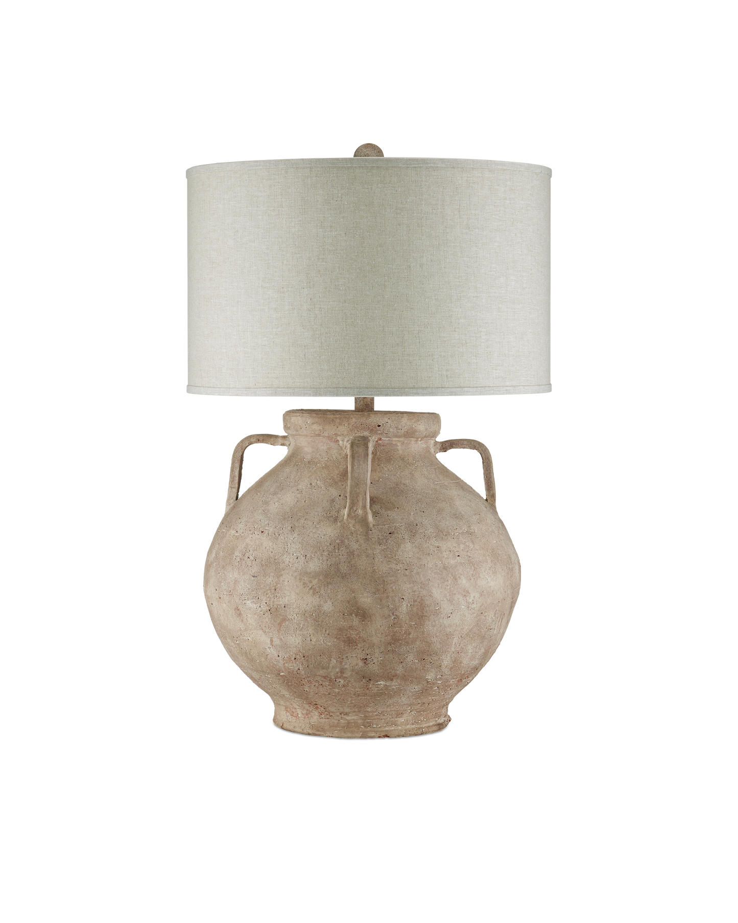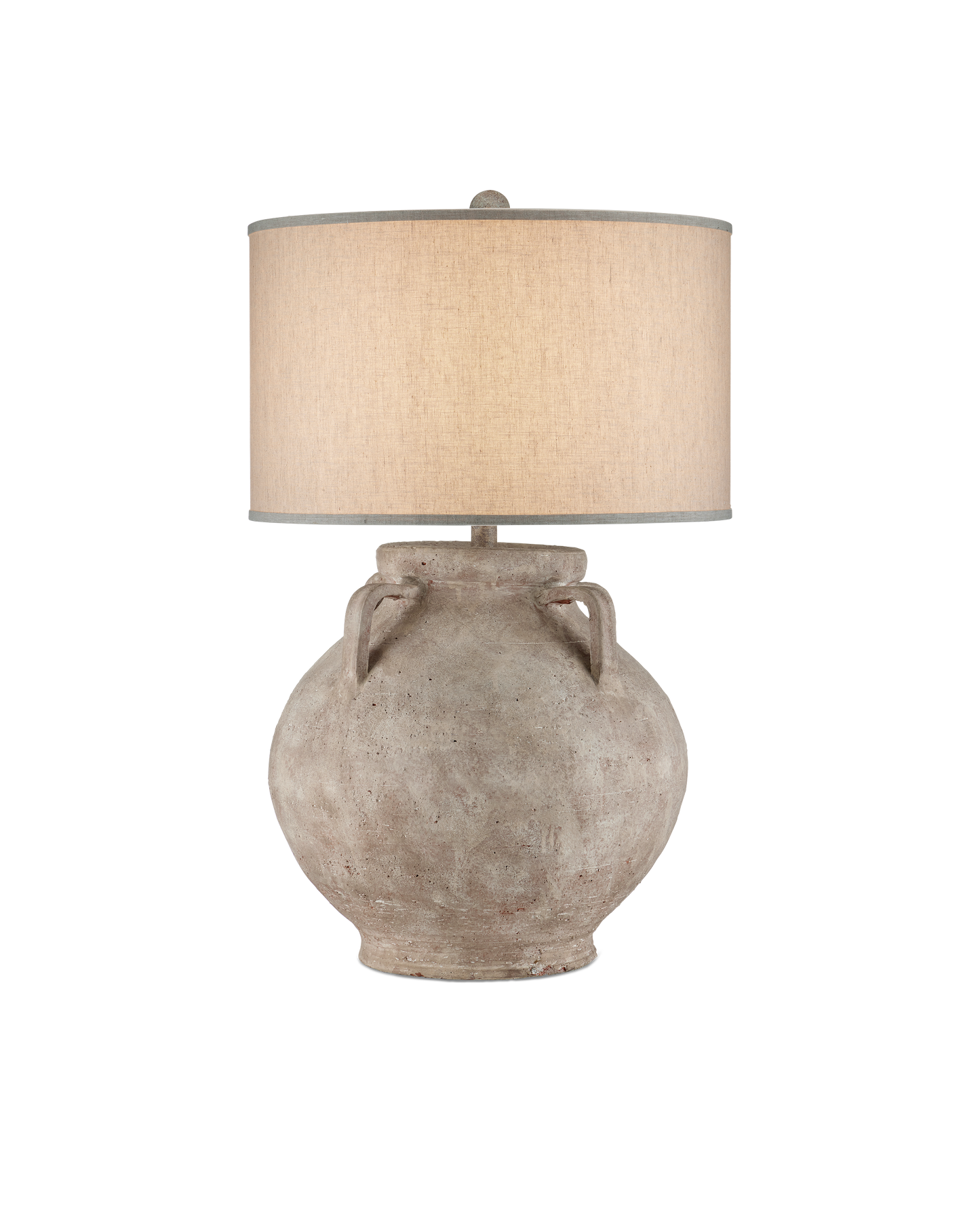 The Pompeii Table Lamp has a surface on its terracotta body that looks as if it could have been aged by the elements. The brownish-gray that swirls around it works in concert with the subtle roughness of the material to bring the tan lamp texture. This is a large lamp, and the trim on the shade is in sync with the hues on the terracotta.