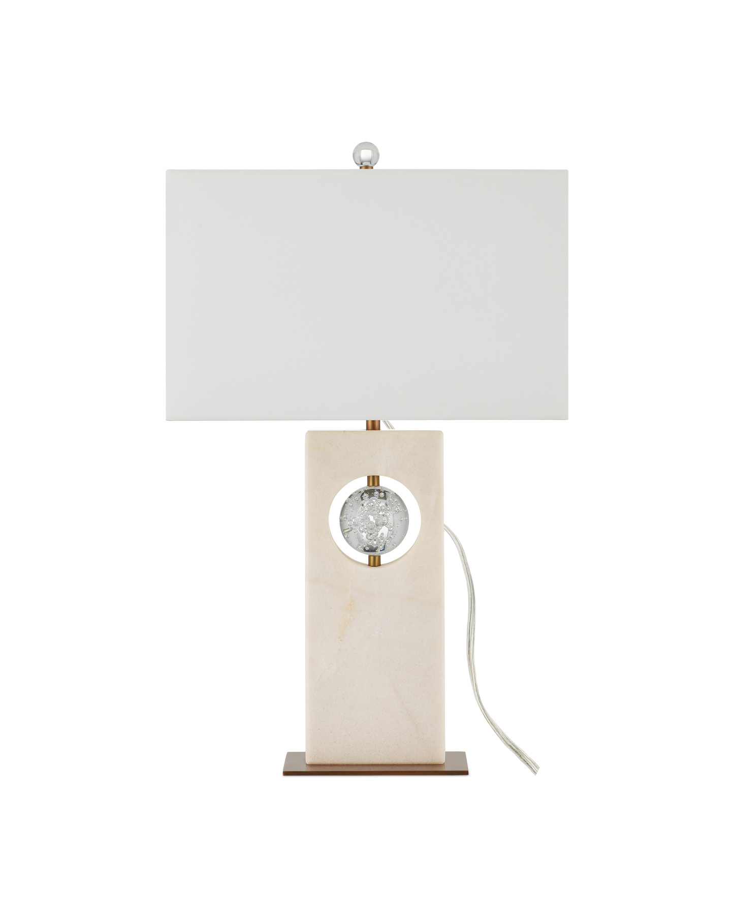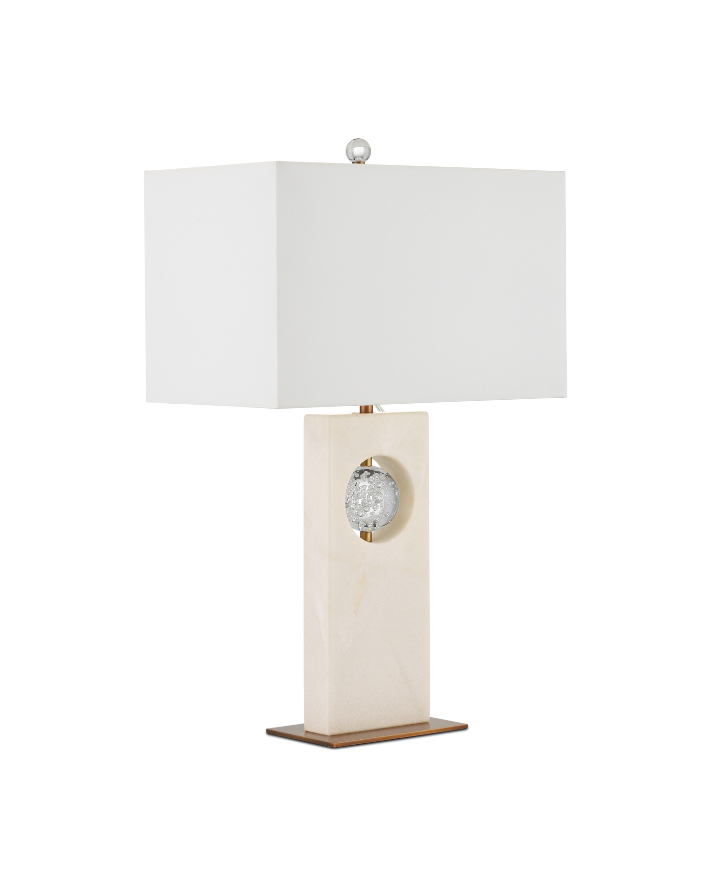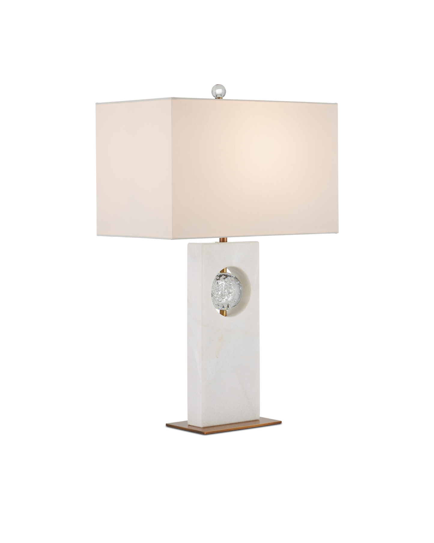 The Radiant Table Lamp has a sophisticated profile made of a glamorous mix of materials. The tall rectangular body, which is made of white marble, has a circular cut-out into which a bubbled optic-crystal orb is fastened. The rods that affix the globe and disappear under the shade are seamless in size and match the antique brass finish on the minimal base. The rectangular shade is perfectly scaled to the shape of the body of the white lamp.