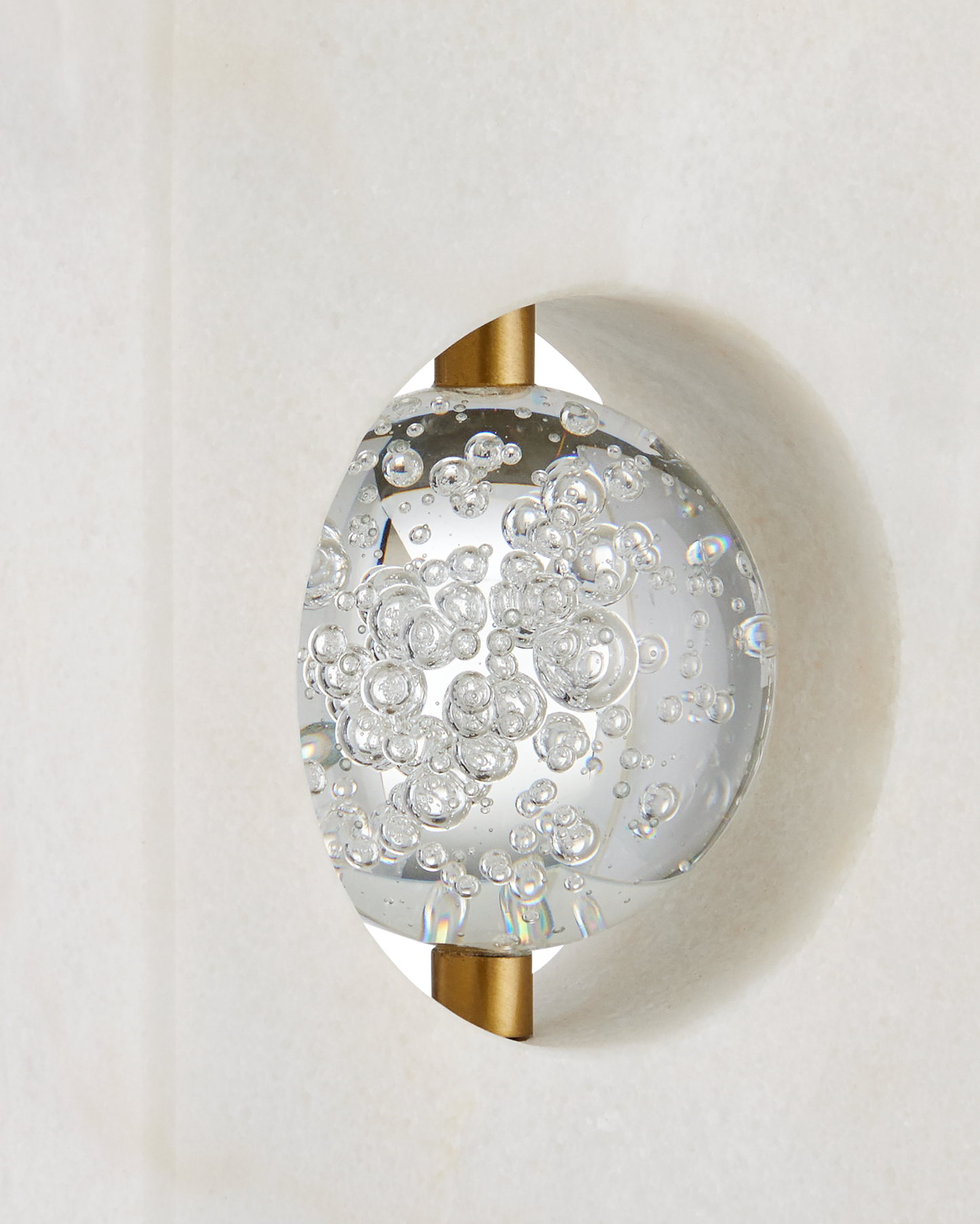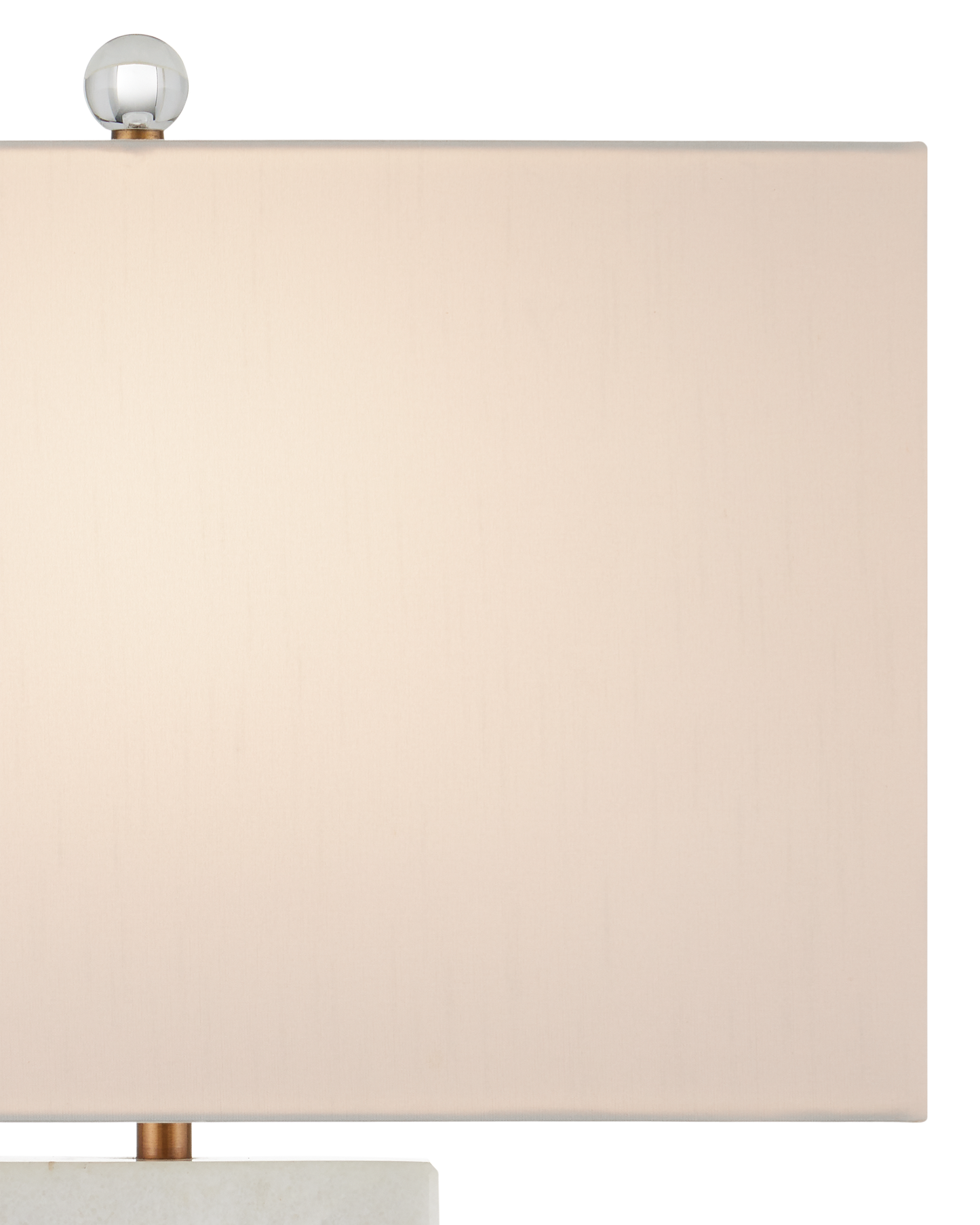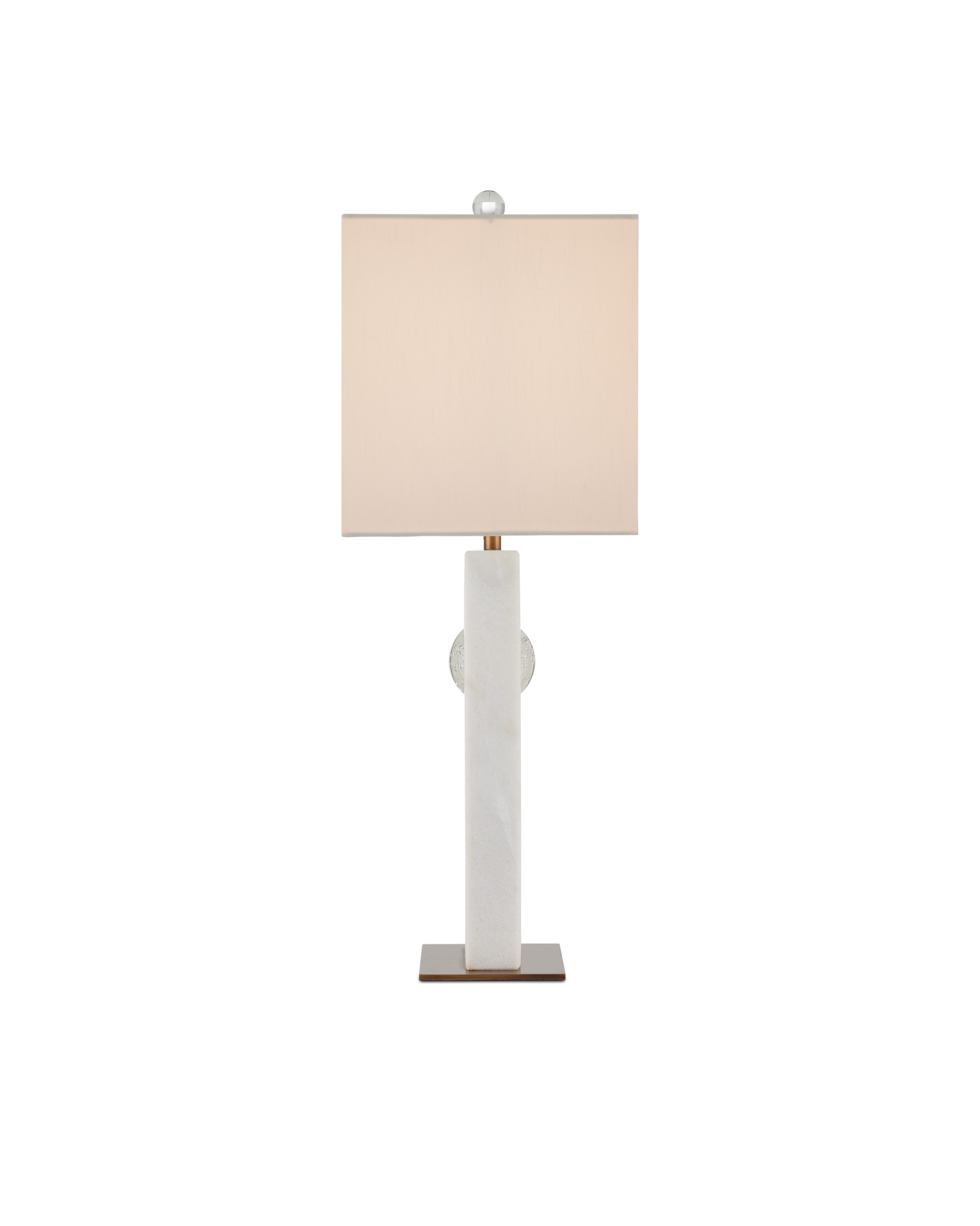 The Radiant Table Lamp has a sophisticated profile made of a glamorous mix of materials. The tall rectangular body, which is made of white marble, has a circular cut-out into which a bubbled optic-crystal orb is fastened. The rods that affix the globe and disappear under the shade are seamless in size and match the antique brass finish on the minimal base. The rectangular shade is perfectly scaled to the shape of the body of the white lamp.