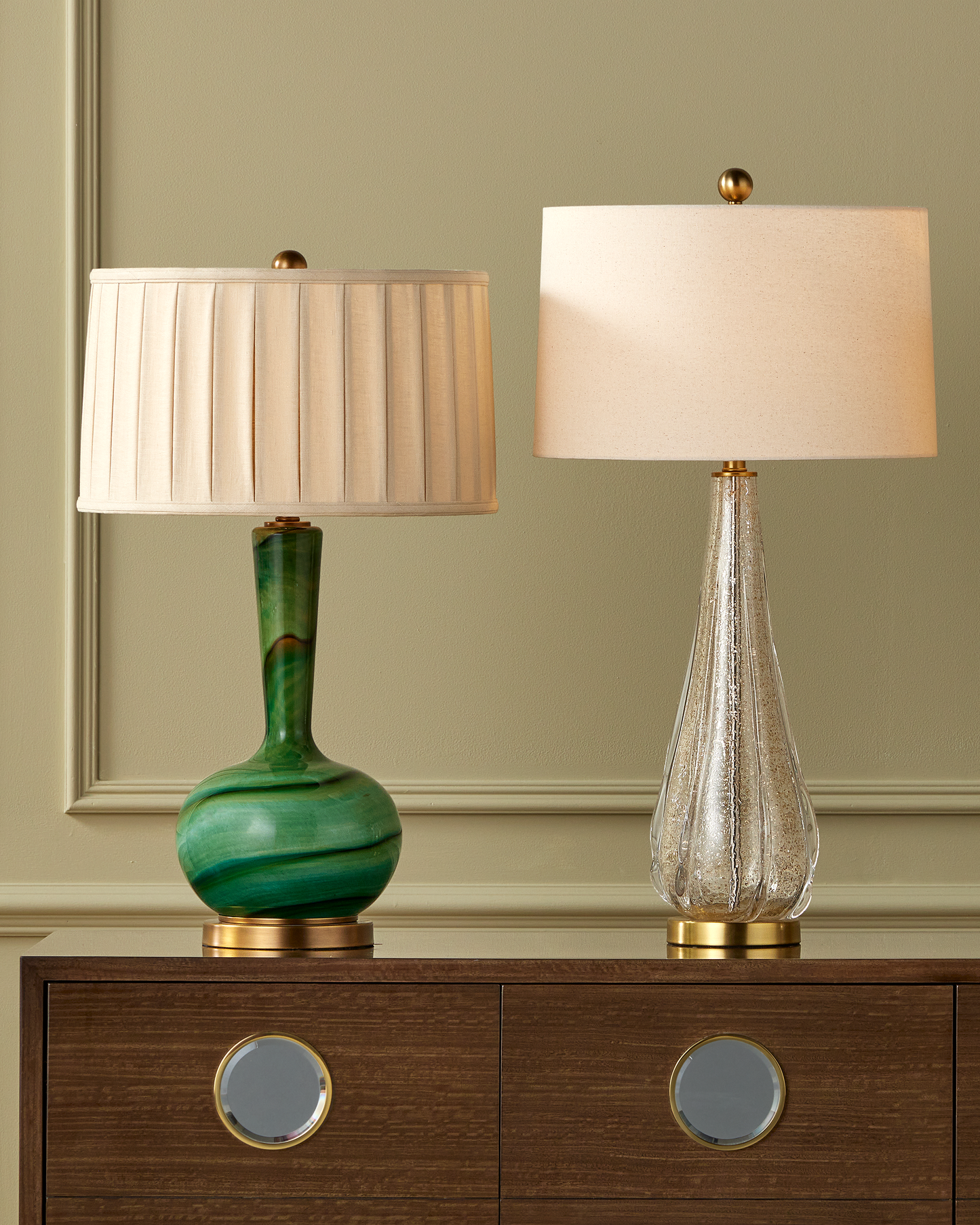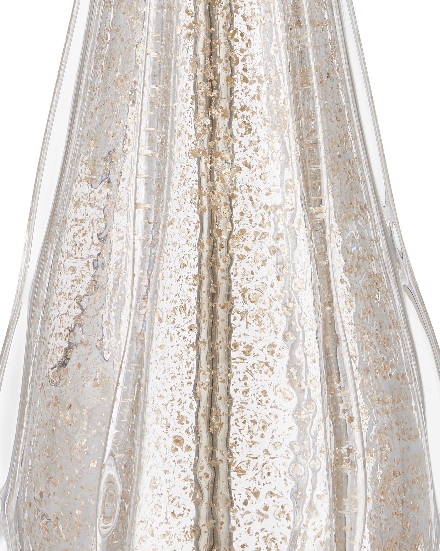 The Zyphyrine Table Lamp has a striking fluidity that stems from the flowing shape of the body that is made of blown glass. There are gold speckles sprinkled throughout the material, which adds a subtle textural feel to the clear lamp. The antique brass on the metal base and hardware draw out the flecks in the glass, as does the finial in the same finish. Because blown glass is so unique from creation to creation, there will be subtle differences in each of these fixtures.