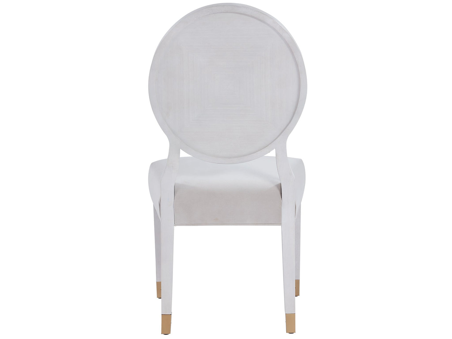 Boasting an exquisite rounded back, an upholstered seat, and soft gold metal caps on each leg, the Love Joy Bliss Oval Side Chair is a luxe seating choice.