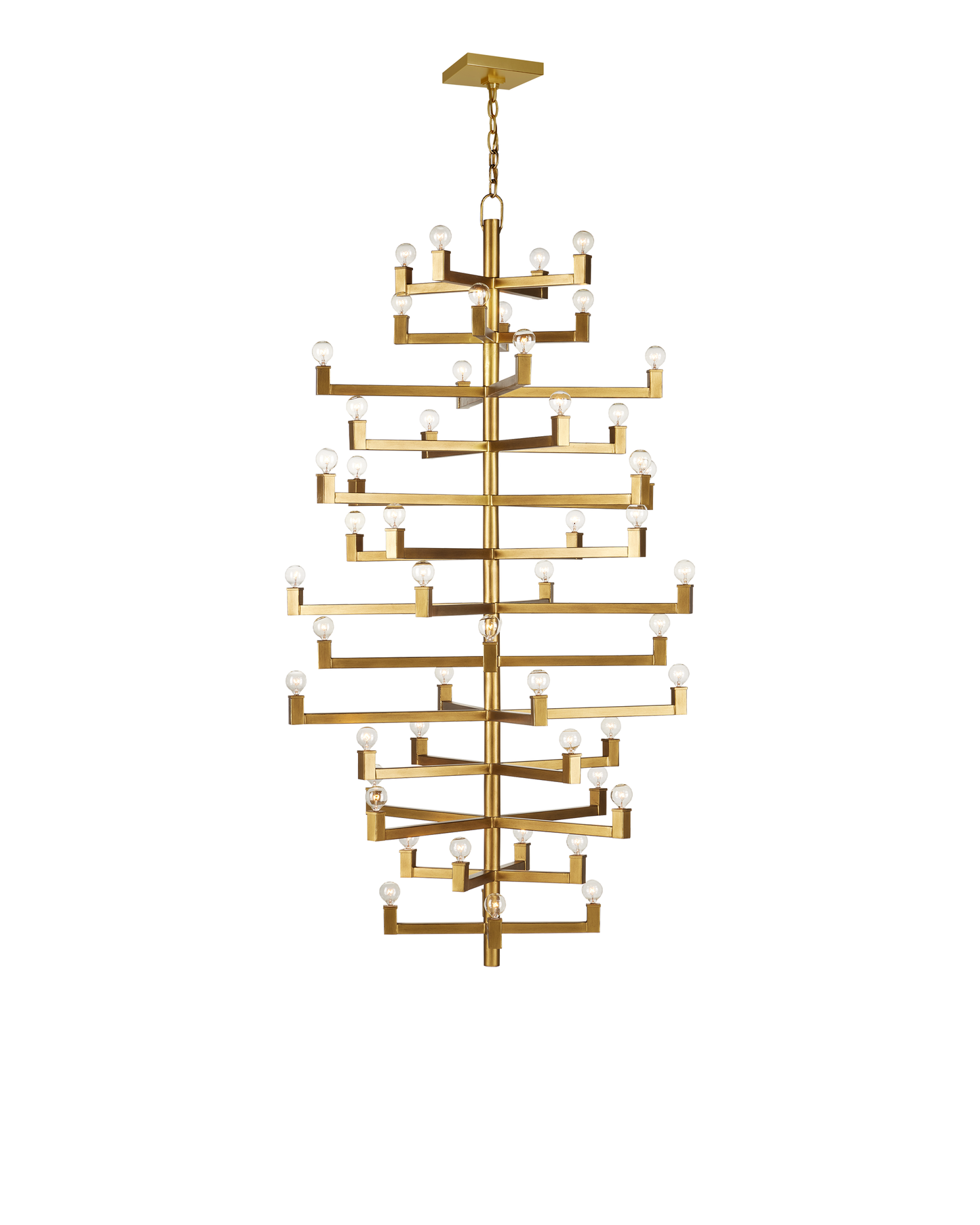 Clean articulated arms with resolute geometries make the big, bold Andre Grande Chandelier a powerful statement that can easily swing from contemporary to transitional styles, and many in between. Made of wrought iron in a brass finish, the gold chandelier will take on other personalities when the shapes of the bulbs are changed. Tall foyers and great rooms with high ceilings are perfect spots for this luminous modern light fixture with a stunning 52 lights. Adjustable from 78" to 169" with use of included chain/rod kit/cable. If your space calls for a longer drop, additional chain/rods/cable is available for purchase.