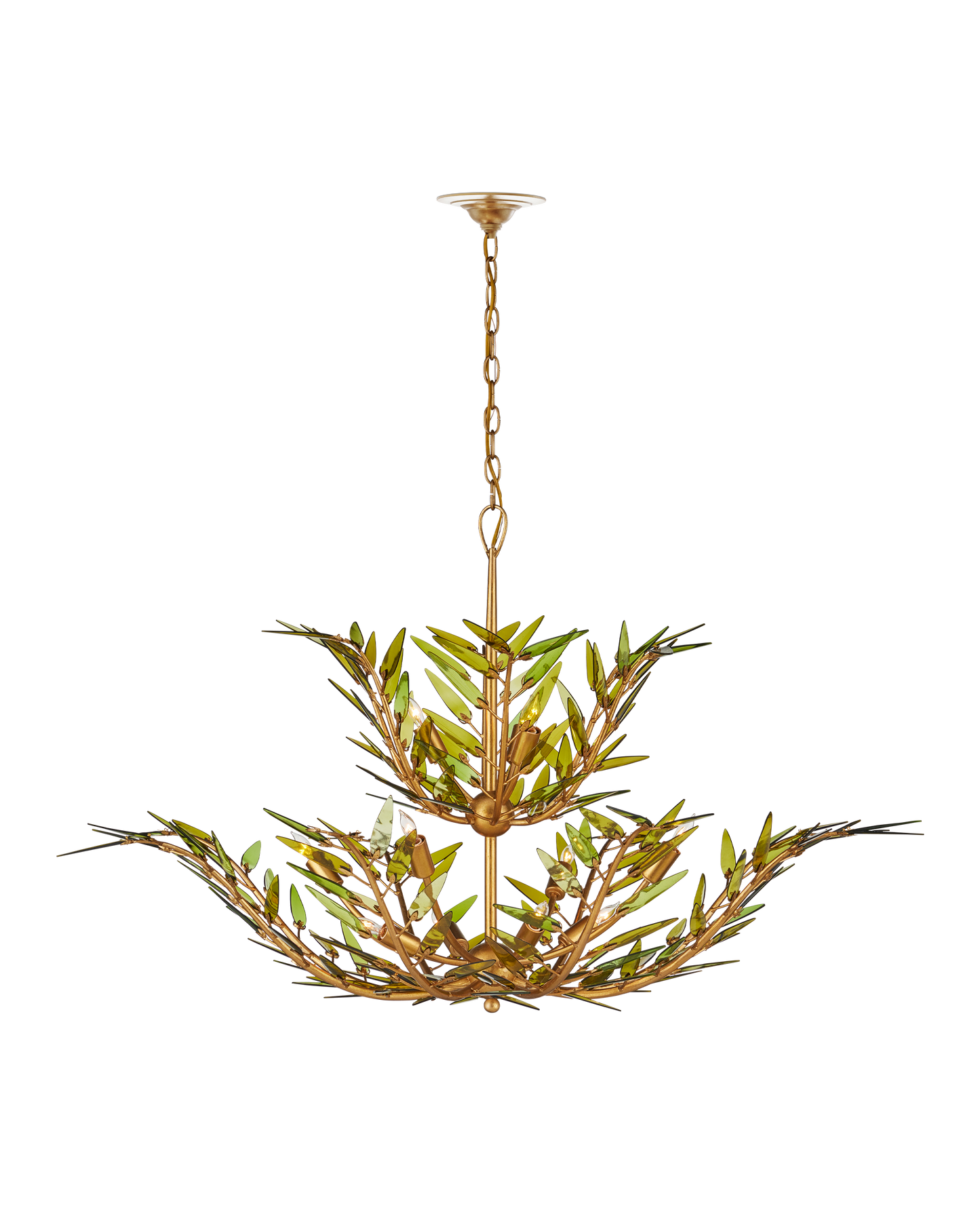 The Babylon Two-Tier Chandelier is formed from slender, curving stems of wrought iron in a contemporary gold leaf finish that have been shaped into an elegant floral silhouette. The tapering spikes are adorned with elongated green glass leaves, each hand-cut from recycled wine bottles, that look as if they are being stirred by a breeze. The edges are individually polished by hand and placed on the frame with metal pins that resemble the shapes of the glass pieces. There will be slight variations in color in the leaves on this dimmable 11-light chandelier. Adjustable from 33" to 101" with use of included chain/rod kit/cable. If your space calls for a longer drop, additional chain/rods/cable is available for purchase.