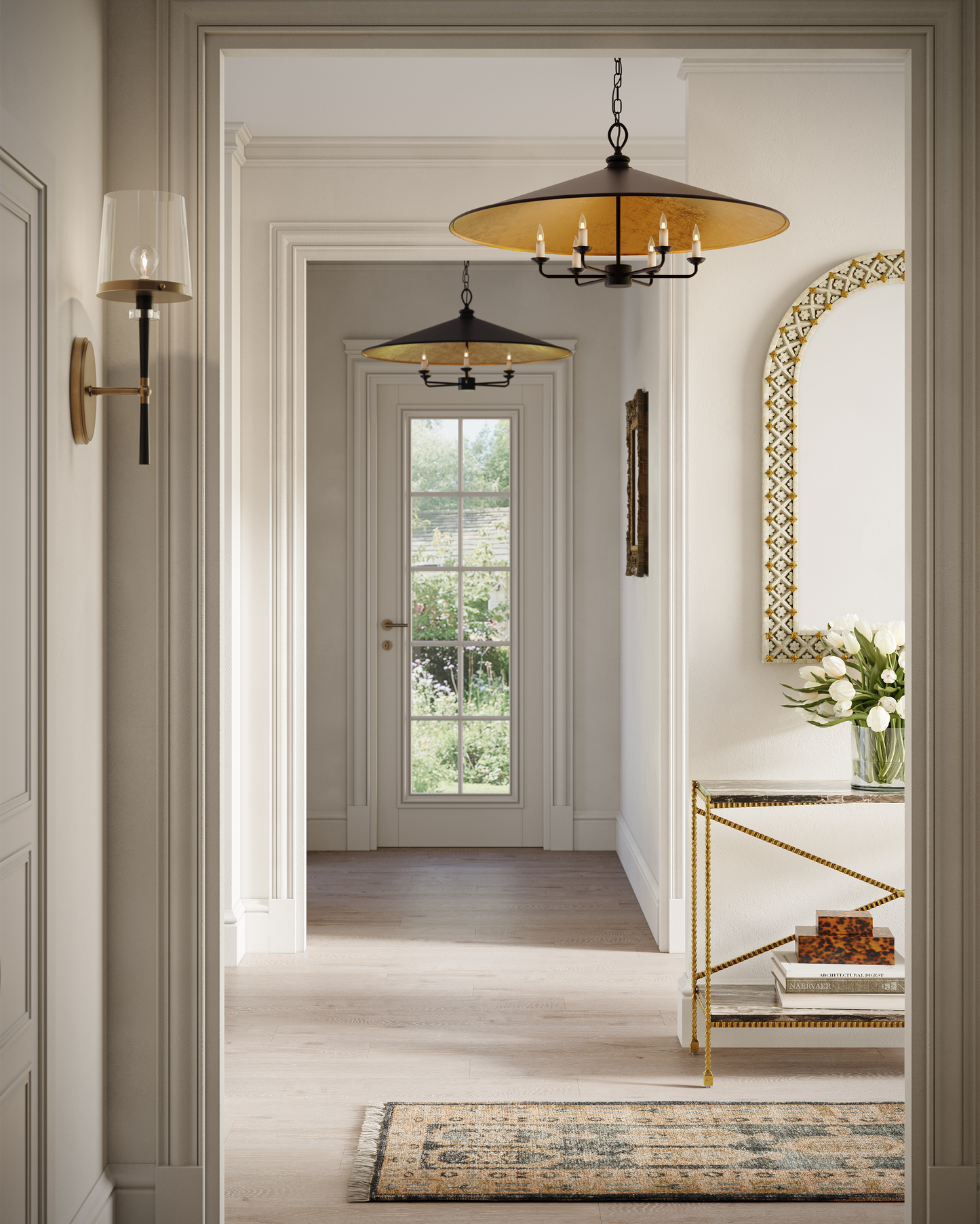 A handsome sprawling shade serves as the canopy for the Brussels Pendant with its subtle oriental profile. A smooth French black finish covers the outside of the shade, the stem, and the arms of this six-light black chandelier while the contemporary gold leaf on the interior of the shade adds contrast to the design. Adjustable from 24" to 91" with use of included chain/rod kit/cable. If your space calls for a longer drop, additional chain/rods/cable is available for purchase.