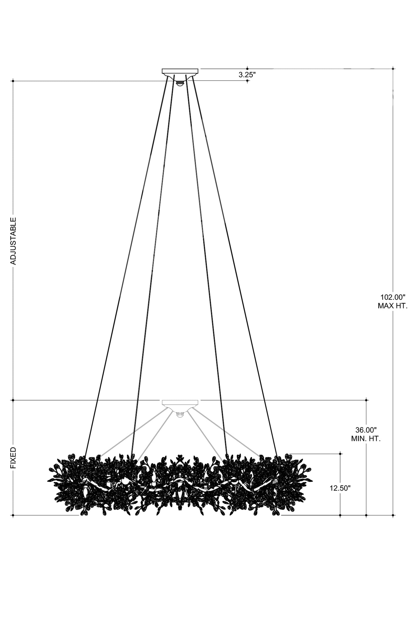 The Crystal Bud Grande Ring Chandelier has delicate faceted crystals unfurling from vines that flow around the fixture. The gleaming metal in a brass finish serves as a warm contrast to the luminous crystals; the interplay making the profile of this fixture complex and interesting. This stunning crystal chandelier is nearly 50 inches in diameter and the lights alternate pointing up and down to increase the sparkle and the luxurious aura. Adjustable from 36" to 102" with use of included chain/rod kit/cable. If your space calls for a longer drop, additional chain/rods/cable is available for purchase.
