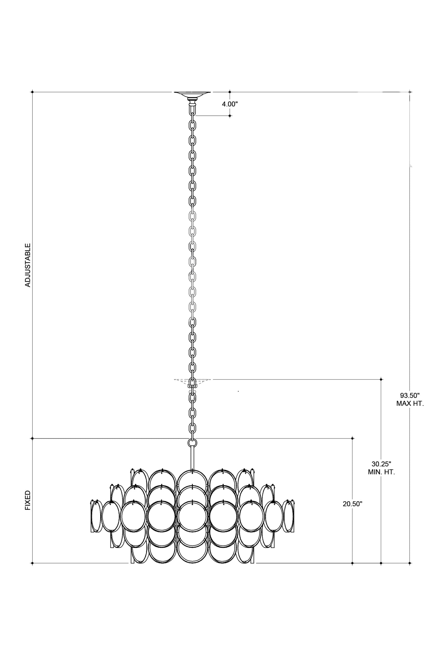 Myriad recycled, recast glass discs are individually attached by hand to hang from a wrought iron frame finished in bronze to make the shapely Galahad Small Chandelier a true statement piece. The ample charm of the fixture is heightened by the glass, as the light source travels around the shade to glint through each one of the discs depending upon the position from which it is viewed. Adjustable from 30.25" to 96.5" with use of included chain/rod kit/cable. If your space calls for a longer drop, additional chain/rods/cable is available for purchase.