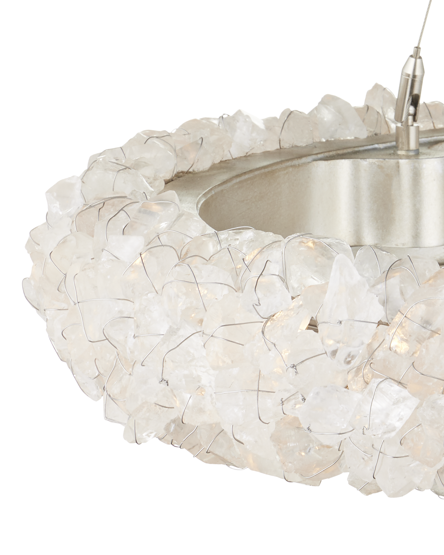 The Iconoclast Chandelier is a sparkling beauty with natural rock crystal affixed to a sturdy wrought iron frame in a contemporary silver leaf finish. Designed with attention to detail, the white wall sconce features rock crystals attached with very thin wire, creating visual interest without interfering with the luminosity of the stones. The pieces of pale material filter the light in the same way ice might, enhancing the beauty of this fixture. Adjustable from 24" to 148" with use of included chain/rod kit/cable. If your space calls for a longer drop, additional chain/rods/cable is available for purchase.