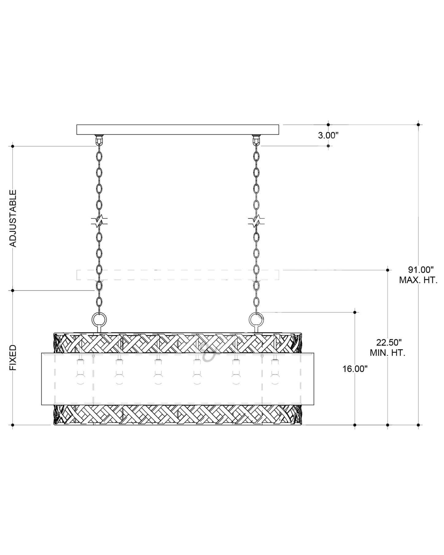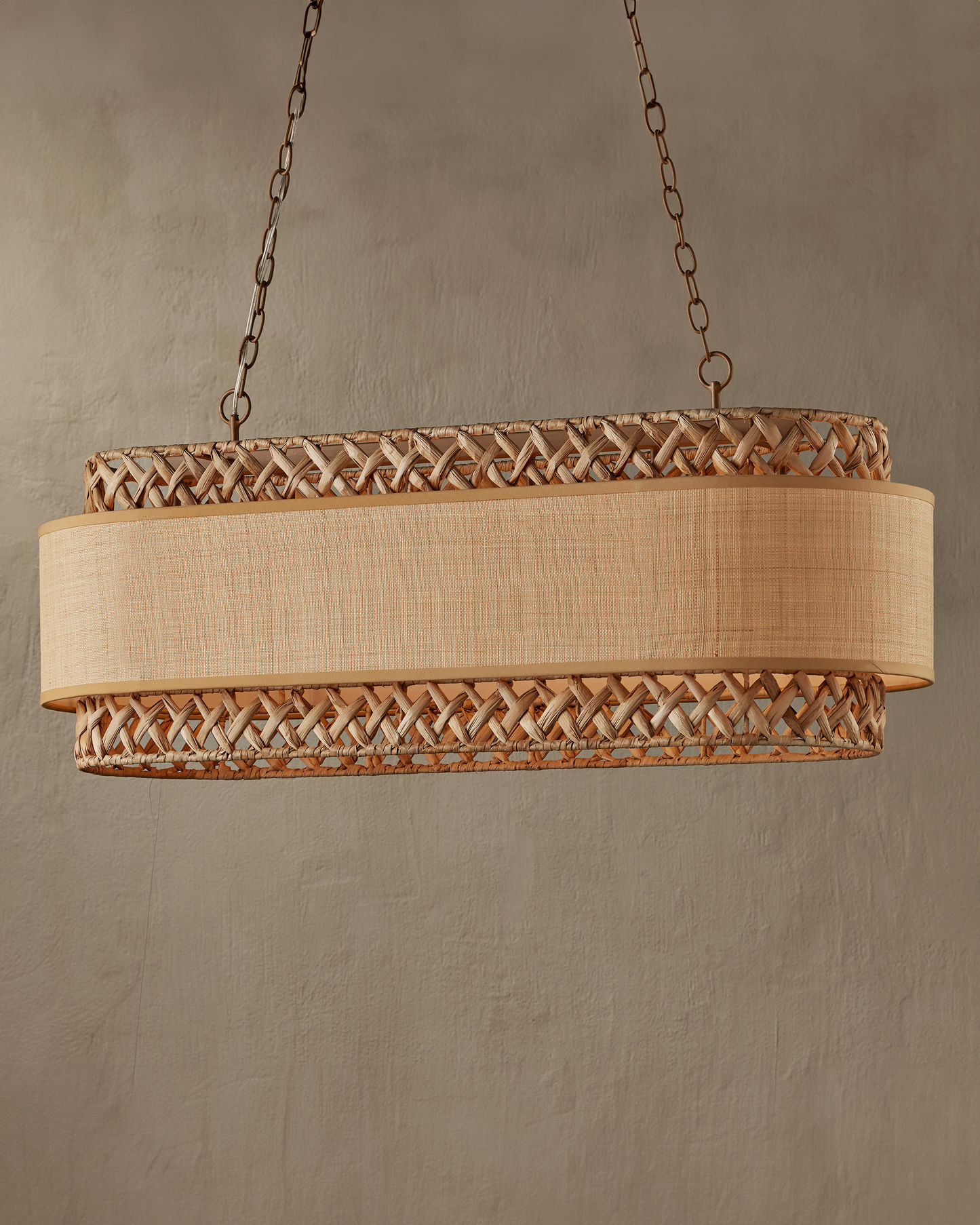 The natural material story continues with the Isola Chandelier with its wrought iron frame in a khaki finish and mix of natural water hyacinth and grasscloth fabric. The smaller, taller oval that encircles the light has a rough luxe weave of the water hyacinth; while the wider, shorter oval has a tighter weave that juxtaposes the looser crosshatching on this tan chandelier. A design detail of note is that the seams match up when the outer shade transitions from straight to curved. Adjustable from 34" to 100" with use of included chain/rod kit/cable. If your space calls for a longer drop, additional chain/rods/cable is available for purchase.