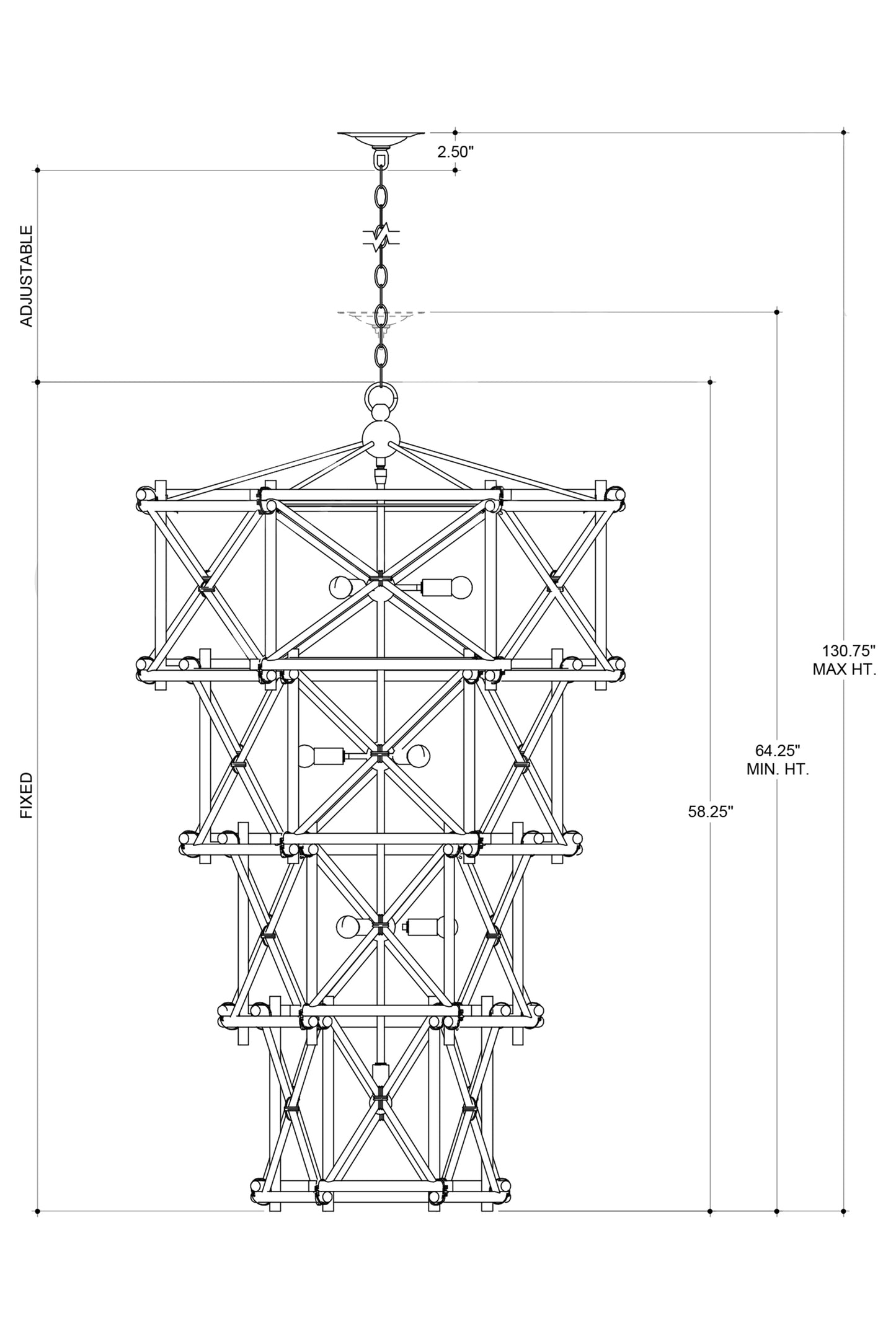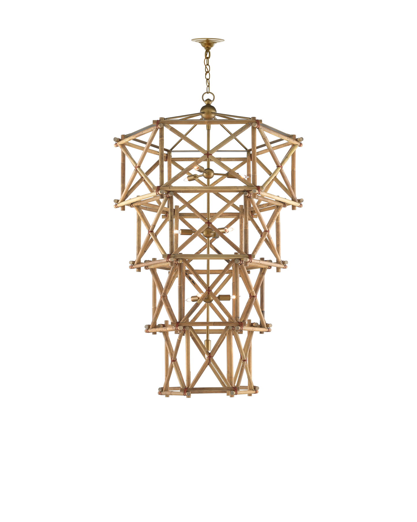 Our Kingali Grande Chandelier has interlocking sections of natural Rattan fastened by wrought iron ties in a new brass finish. Adjustable from 64.25" to 130.75" with use of included chain/rod kit/cable. If your space calls for a longer drop, additional chain/rods/cable is available for purchase.