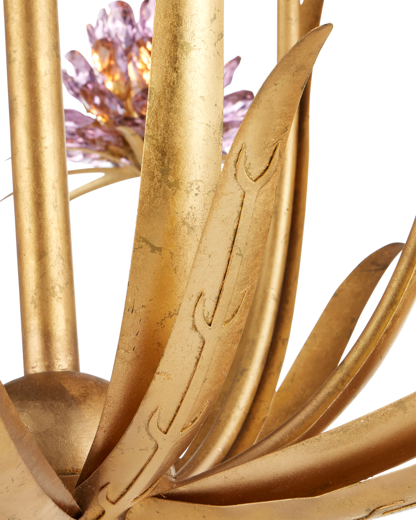 The Marilee Large Chandelier is a floral-inspired chandelier in a Dutch Gold Leaf finish with plant-like shapes flowing along each of the arms. The curved rods that make up the frame culminate in crystal blossoms that surround the bulbs, which makes them glow. The tiny palm-shaped details on the top and beneath the blossoms are artful details. The 12-light gold chandelier is dimmable. Adjustable from 39" to 107" with use of included chain/rod kit/cable. If your space calls for a longer drop, additional chain/rods/cable is available for purchase.