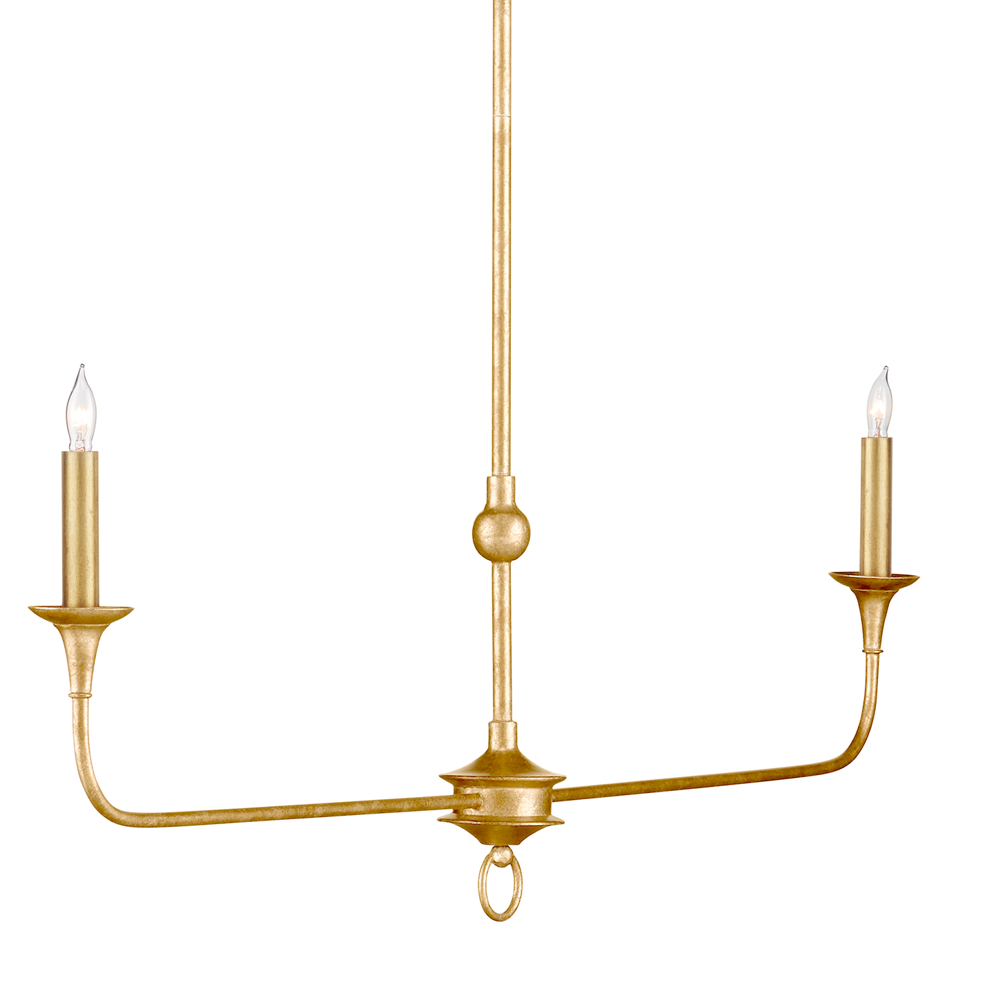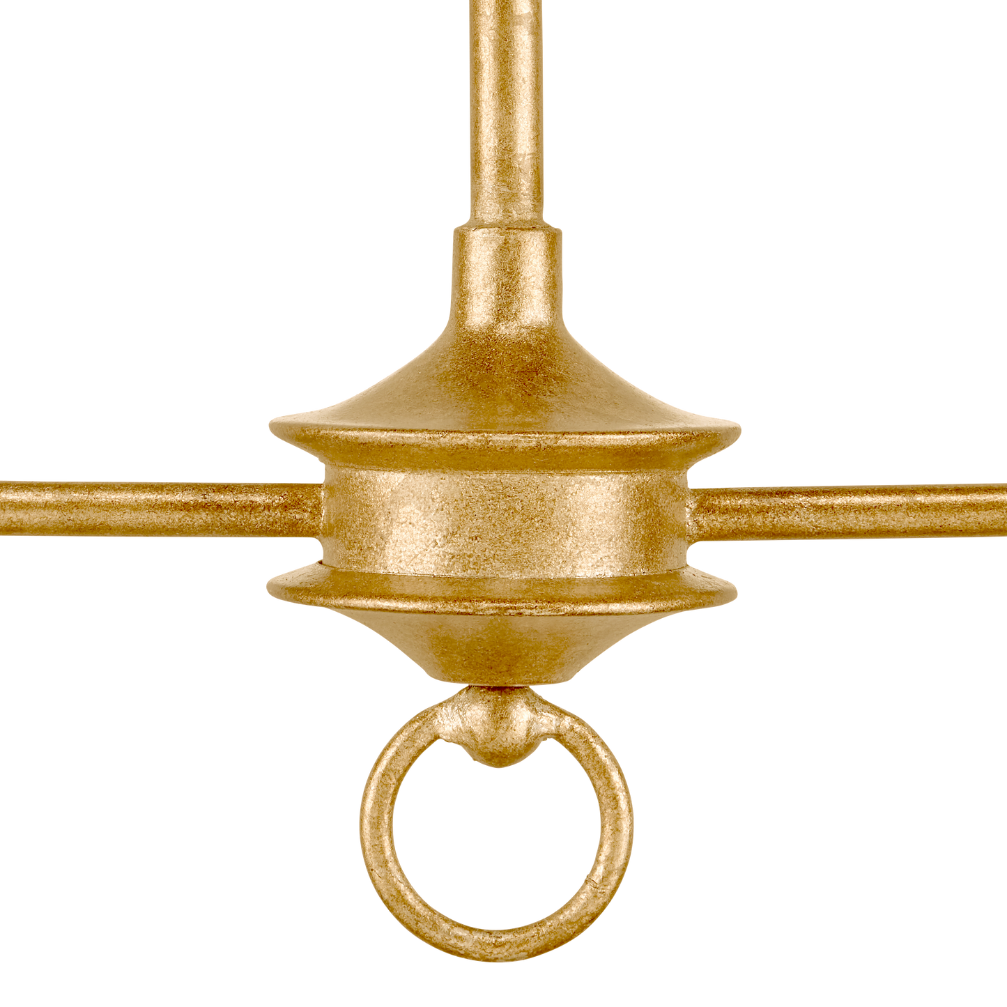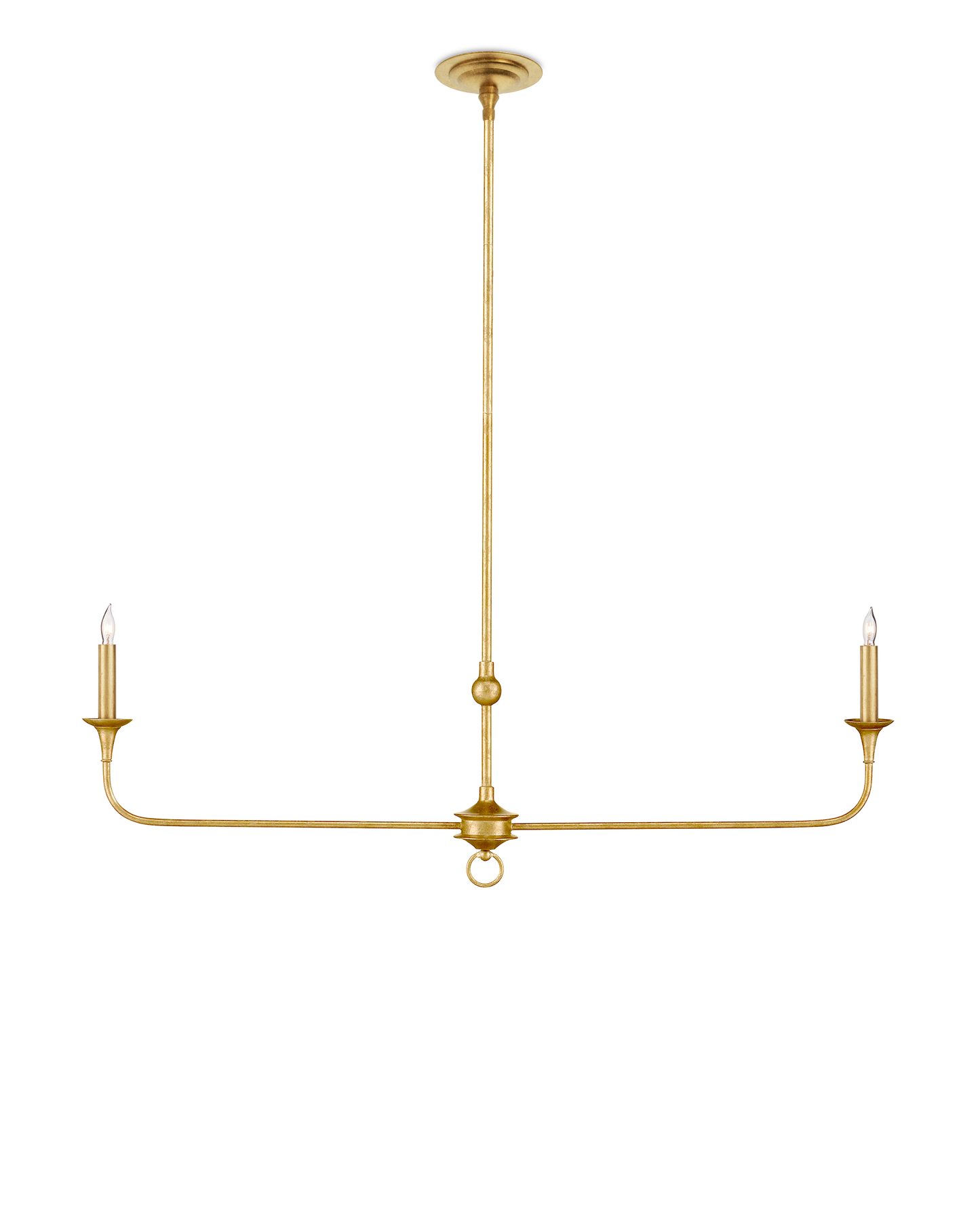 The Nottaway Linear Gold Chandelier has long arms that stretch gracefully from a small cog and a ring that ornaments its bottom-most point. The profile of the fixture has a lovely fluidity to it, and the contemporary gold leaf finish adds textural interest to the gold chandelier. The fact that the chandelier is hung from a rod rather than a chain modernizes this design, though it is still decidedly in the traditional design vernacular. Its shape makes it perfect for above kitchen islands and bars. Adjustable from 23.25" to 65.25" with use of included chain/rod kit/cable. If your space calls for a longer drop, additional chain/rods/cable is available for purchase.