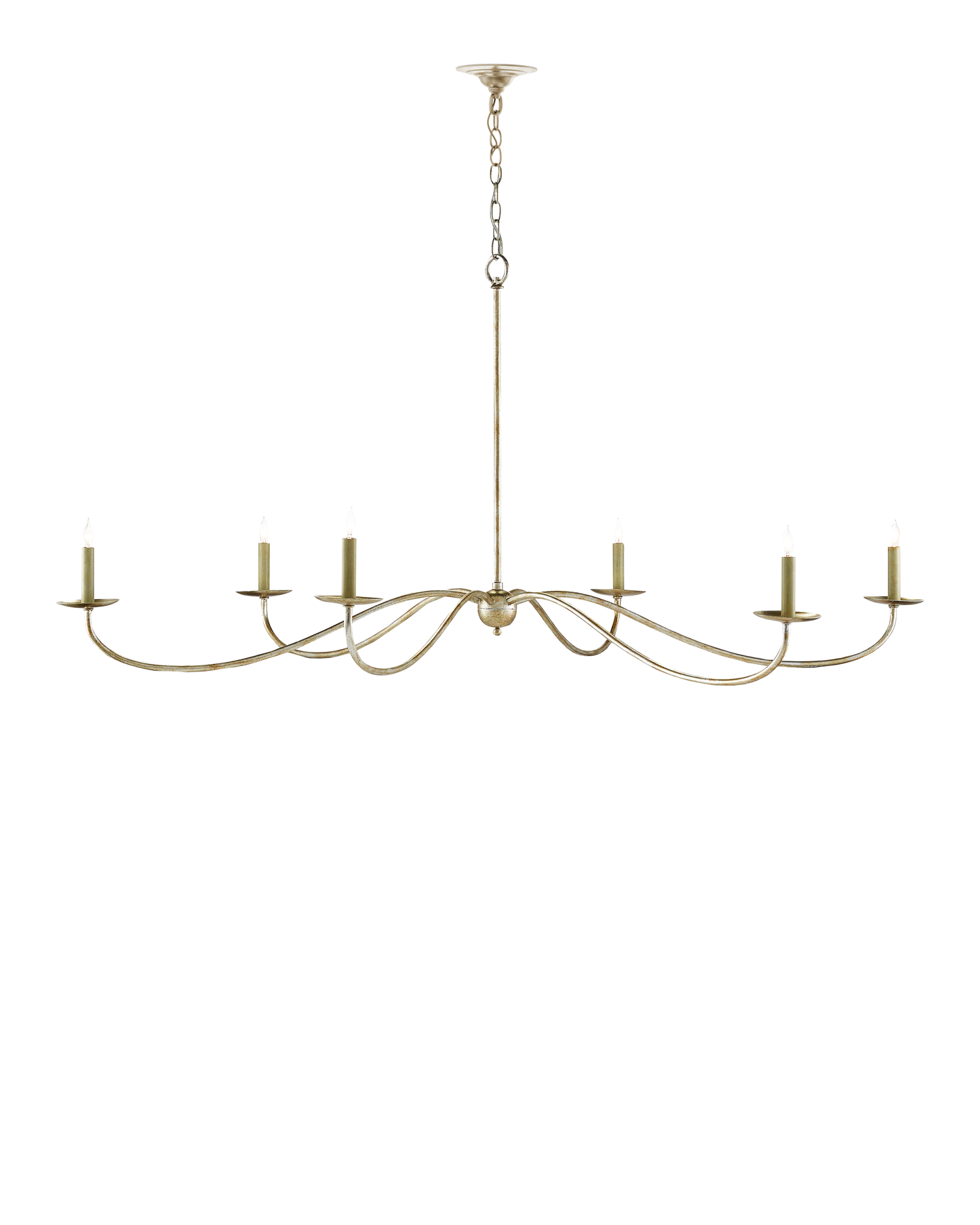 The Saxon Silver Chandelier is one of our monumental chandeliers that extends to an impressive 63-inches in diameter. Its shape and the silver Granello finish are nods to a bygone era but its slender lines that arc gracefully make its profile modern. Adjustable from 34" to 103" with use of included chain/rod kit/cable. If your space calls for a longer drop, additional chain/rods/cable is available for purchase.