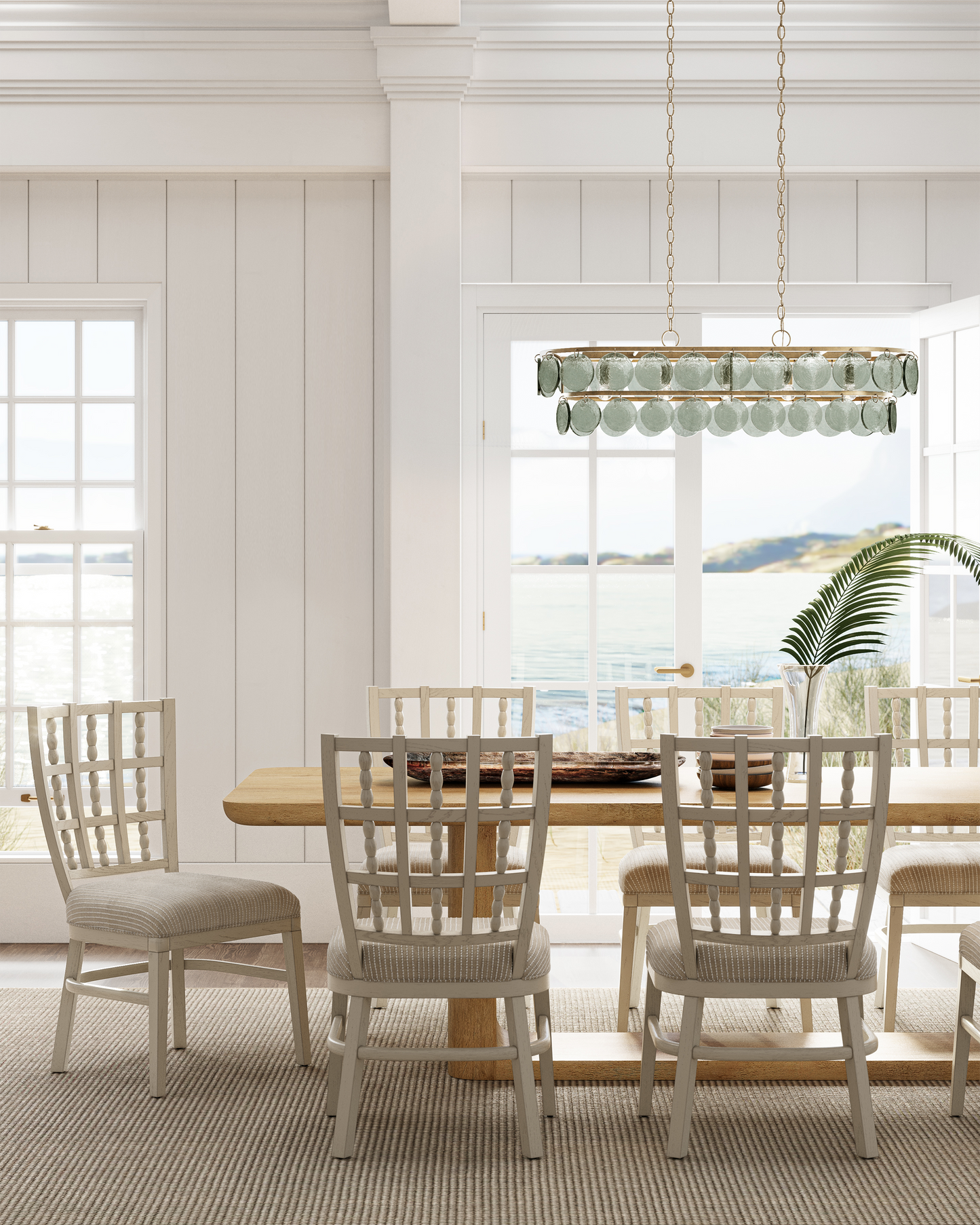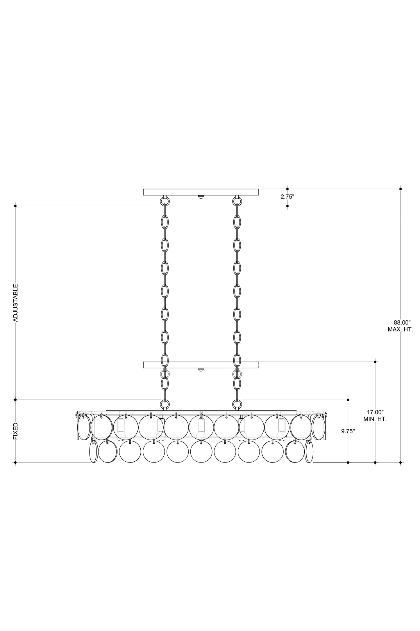 The Settat Chandelier has recycled glass discs dangling from stacked oval ribs in a silver leaf finish. This design is light and airy thanks to the gleaming finish, the minimal chains from which it hangs, and the reflectivily of the glass. The silver chandelier will also introduce a subtle texture to a space given the whorls inherent in the recycled material, which gleams beautifully when the lights are switched on. Adjustable from 16.75" to 84.25" with use of included chain/rod kit/cable. If your space calls for a longer drop, additional chain/rods/cable is available for purchase.