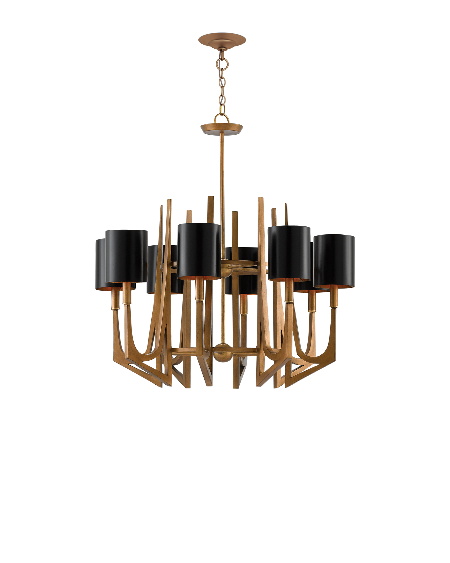 The Umberto Chandelier has an abstract appeal that can cross many stylistic lines. Made of wrought-iron in a brass finish, this eight-light gold chandelier has black metal shades set into the angular composition made of thin spiked lines. Adjustable from 41" to 108" with use of included chain/rod kit/cable. If your space calls for a longer drop, additional chain/rods/cable is available for purchase.