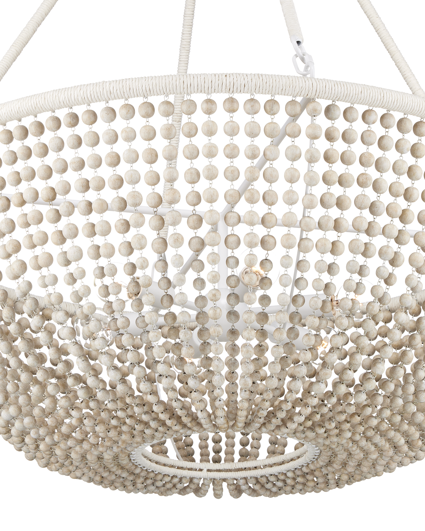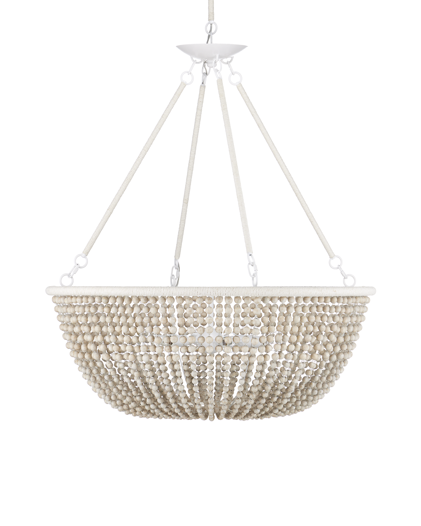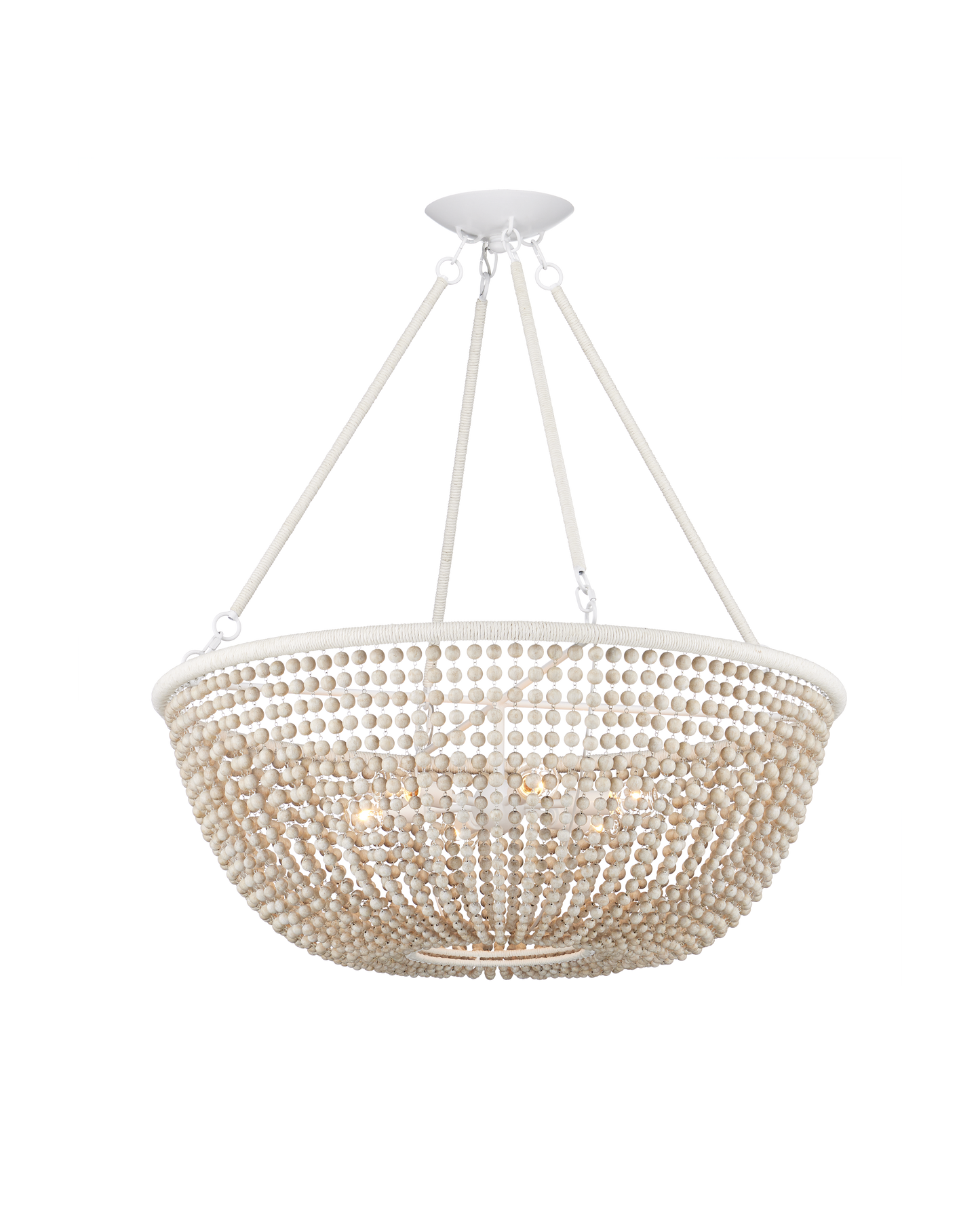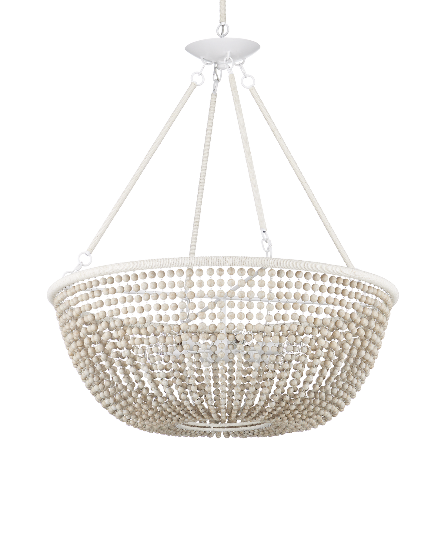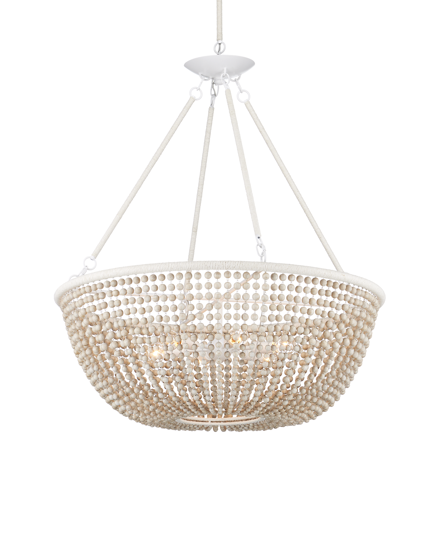 The Wychwood Chandelier is a classic shape that holds swags of wooden beads between its top and bottom rings. Several materials and finishes are in play on this design -- the sugar white finish on the wrought iron, the sandstone finish on the beads, and the Kraft paper twine wrapped around the rings themselves. Adjustable from 42.25" to 123" with use of included chain/rod kit/cable. If your space calls for a longer drop, additional chain/rods/cable is available for purchase.