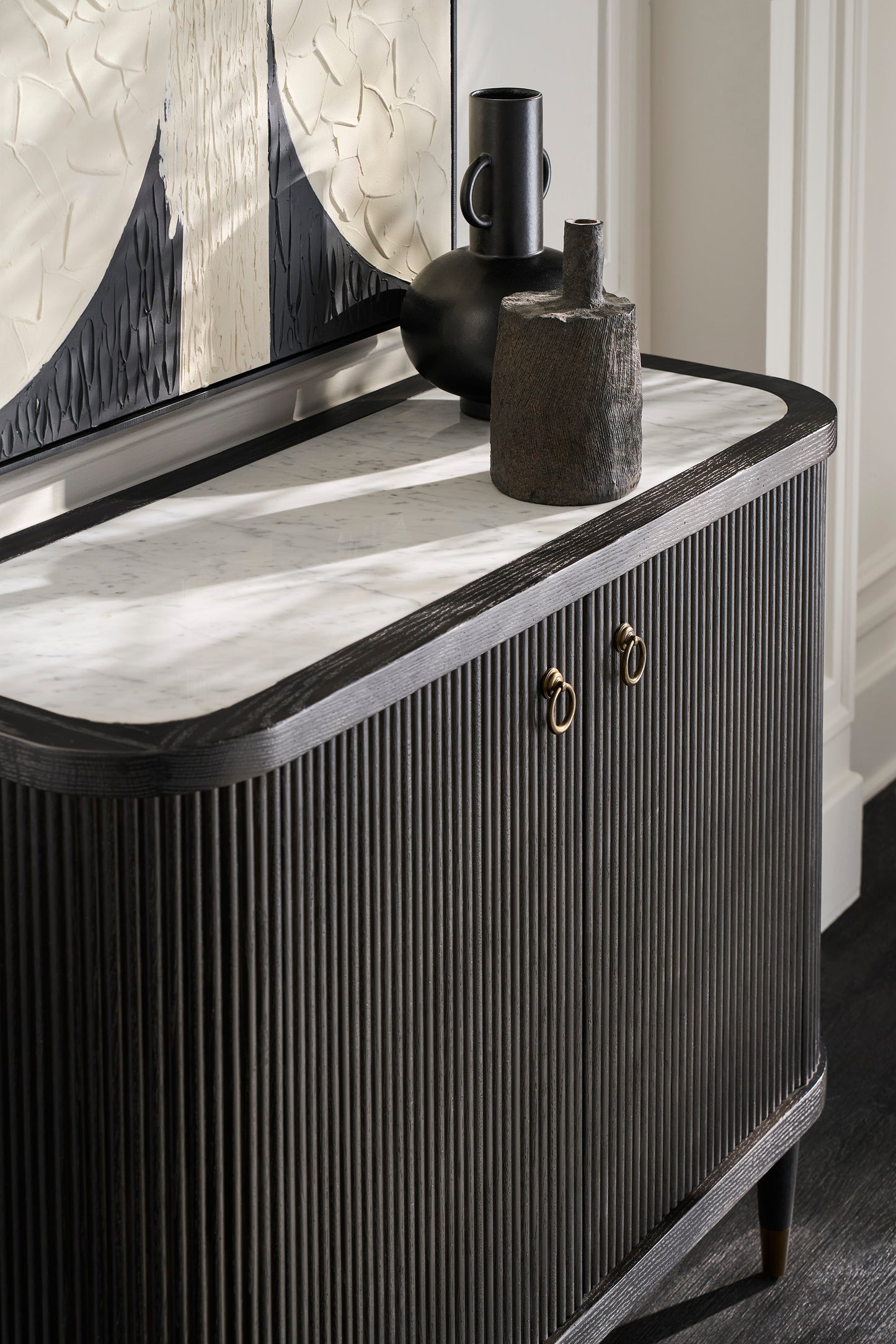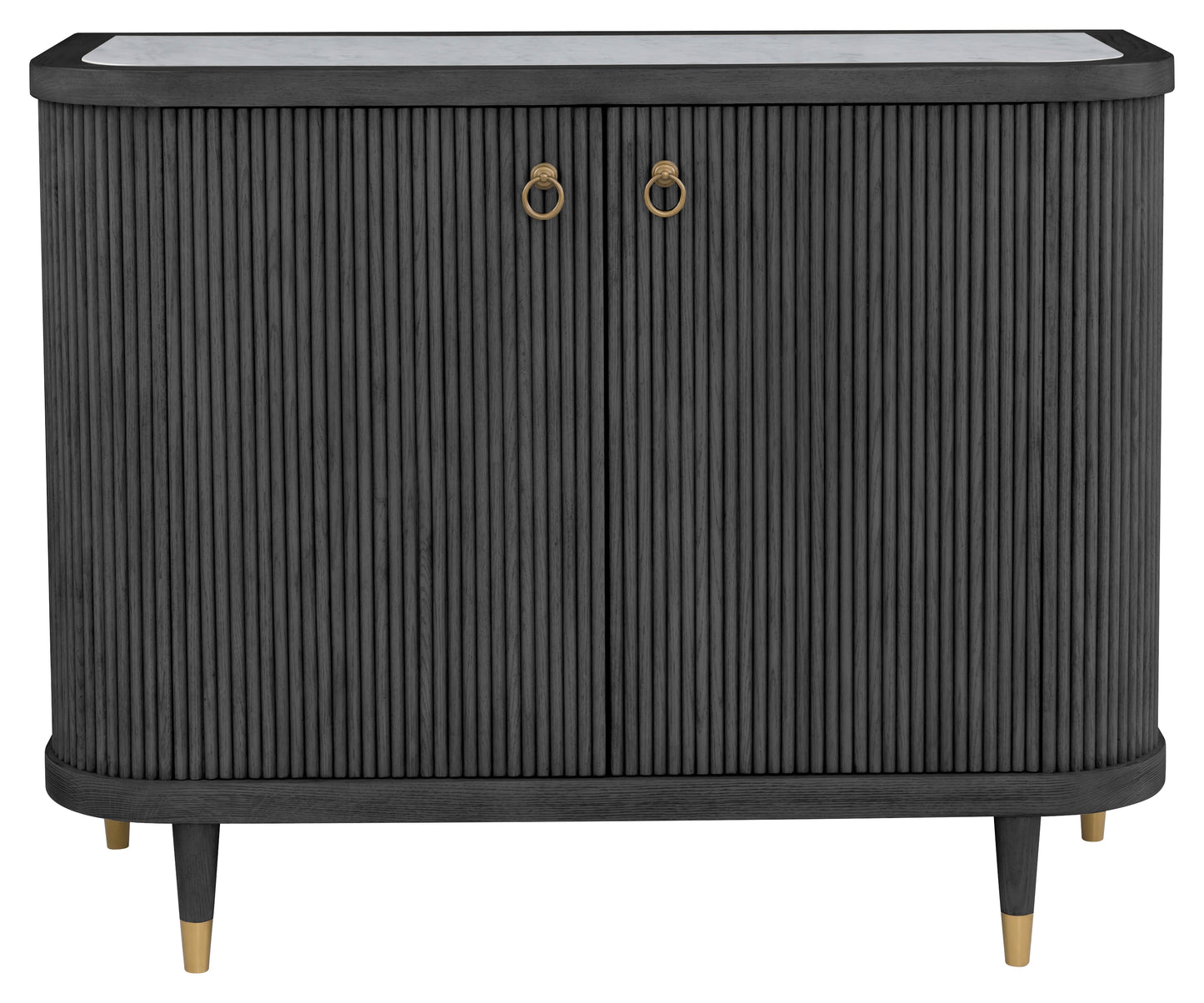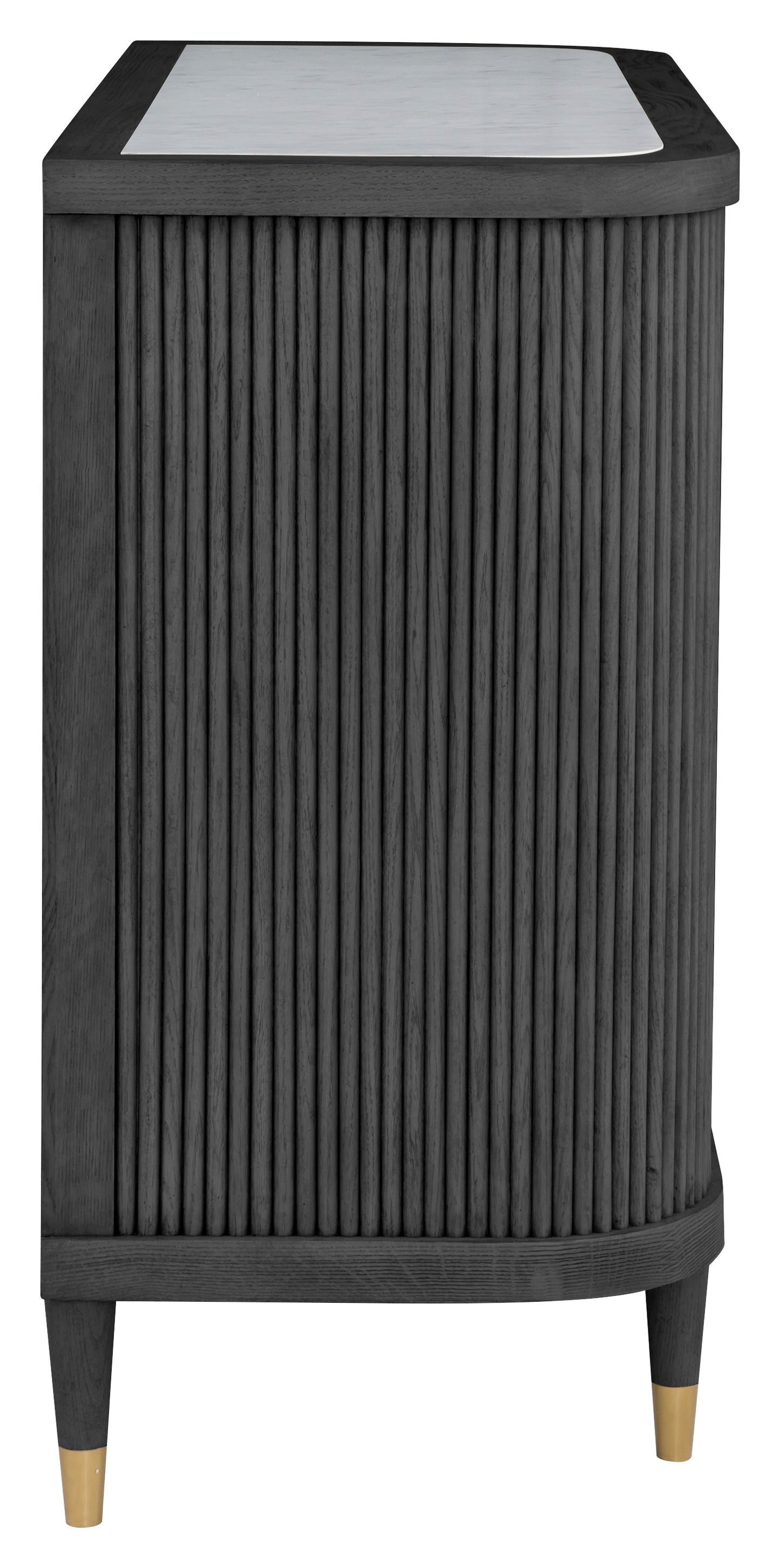 Regular price $2,081.25This sleek charcoal version of the Demilune Credenza brings bold sophistication to your space. Its curved reeded wood front, rich dark finish, and brass-finished feet offer a moody yet refined look. Ideal for entryways, dining rooms, or anywhere stylish storage is needed.