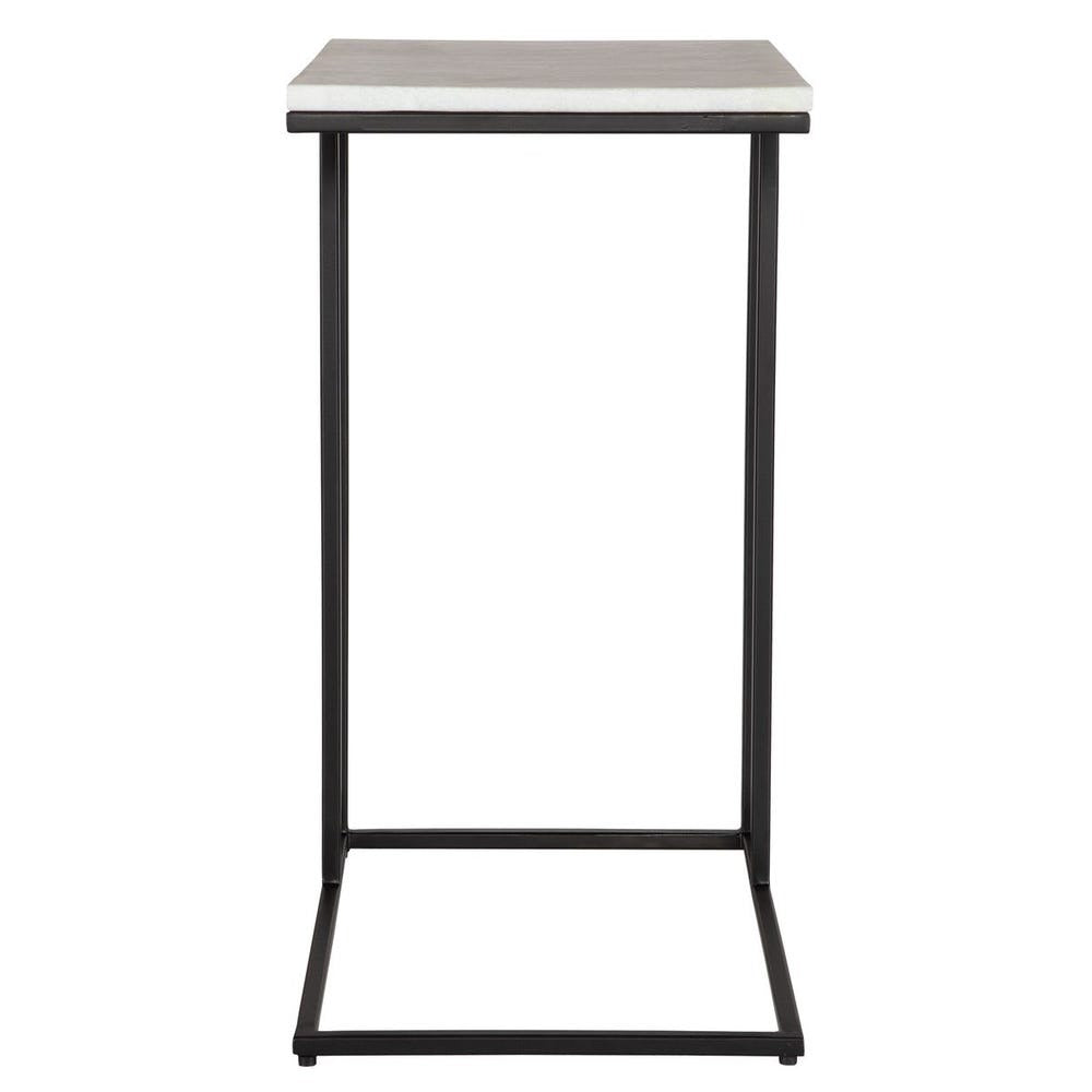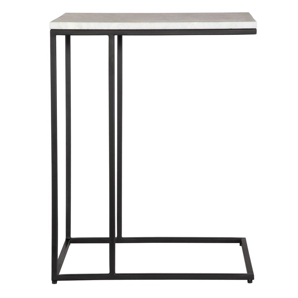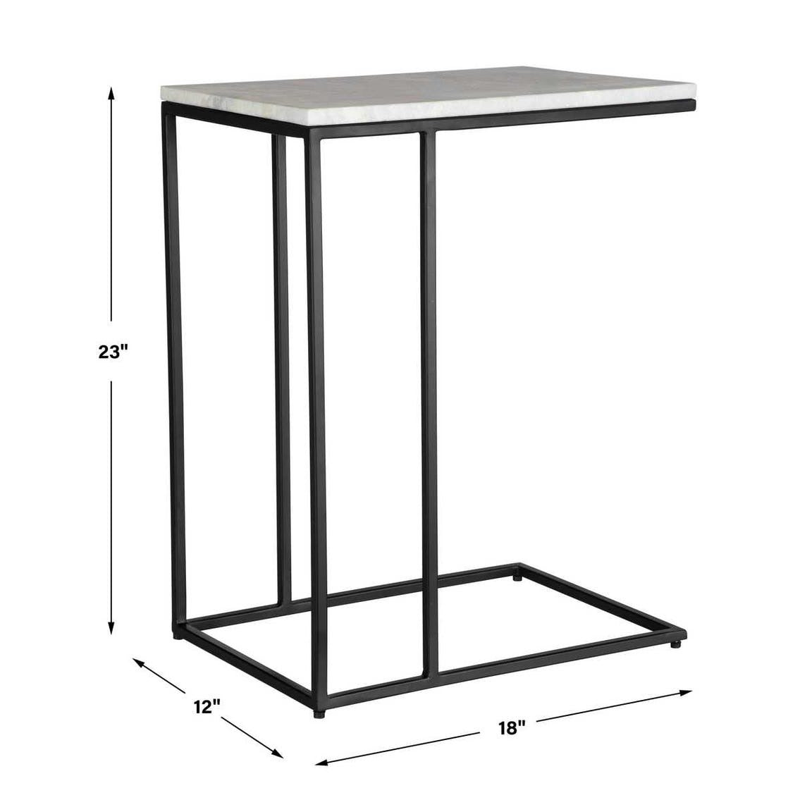 This perfectly sized accent table, with it's open design, will look great beside your favorite chair. The black metal frame is topped with a beautiful piece of white Morwad honed marble. Due to the nature of marble, natural veining will make each piece unique.