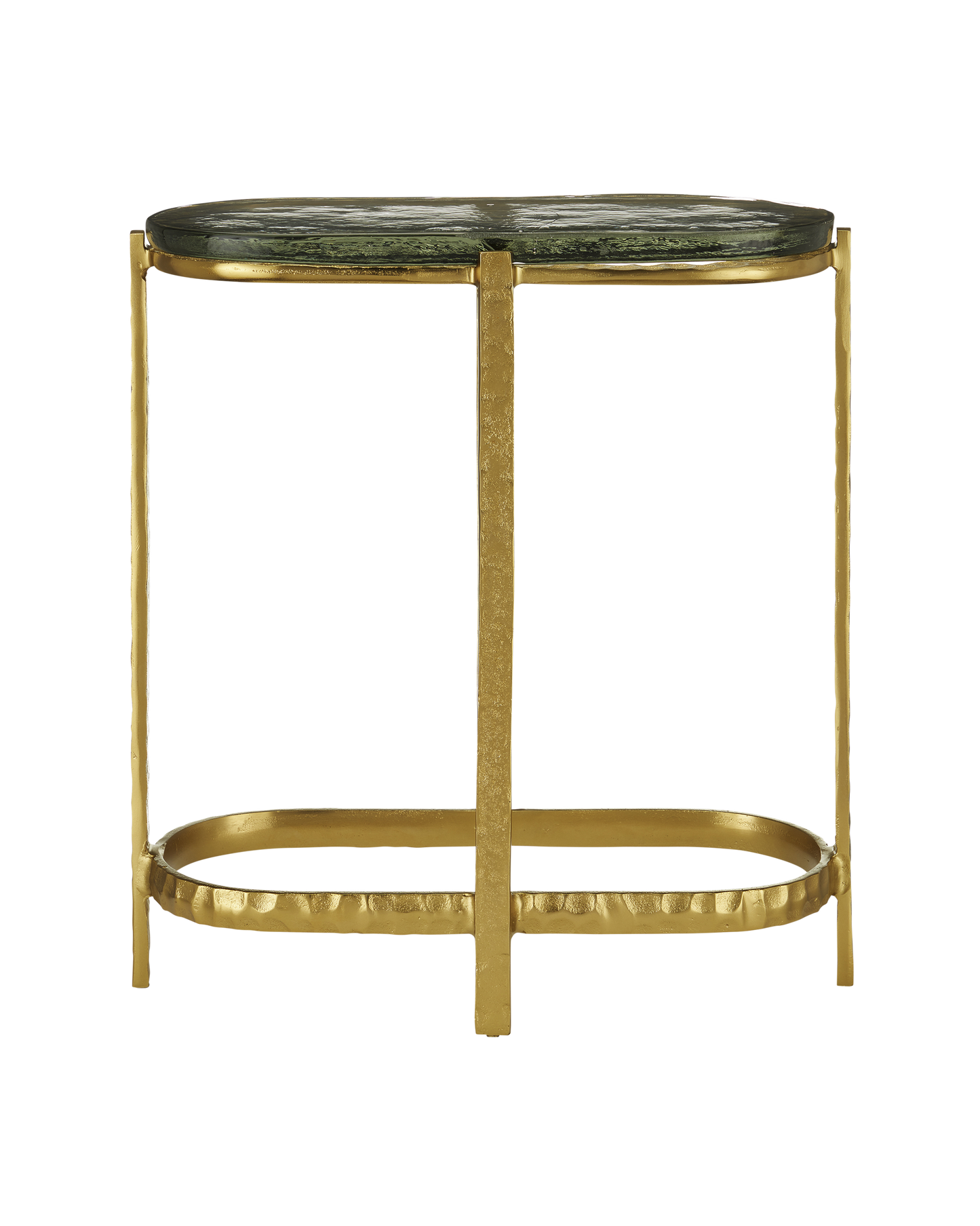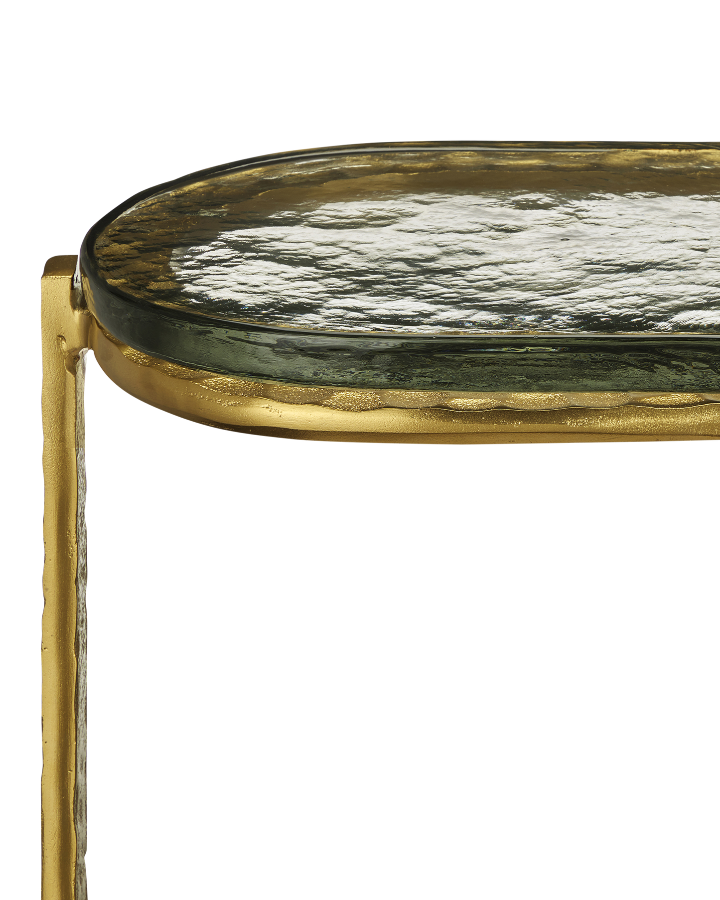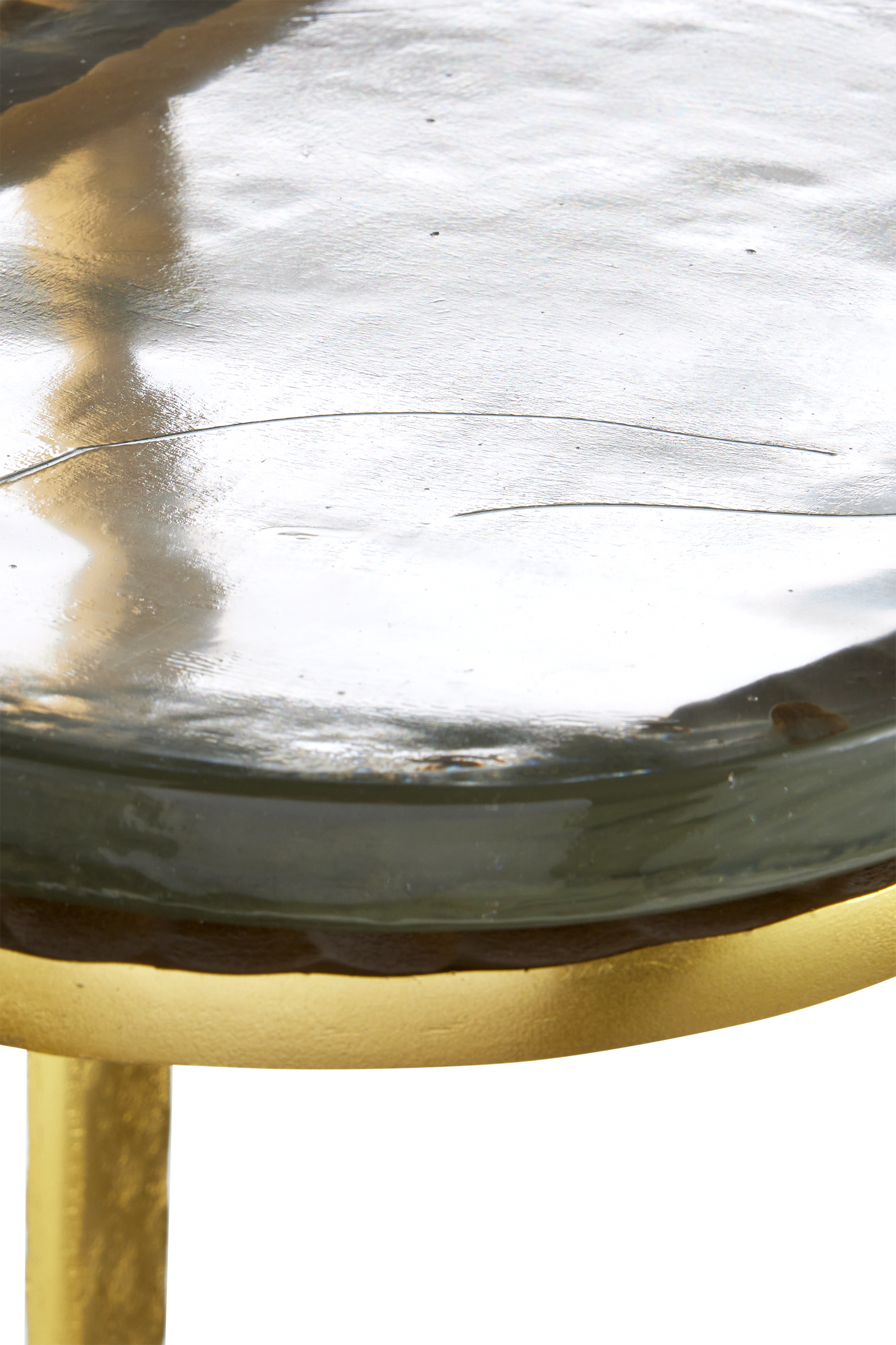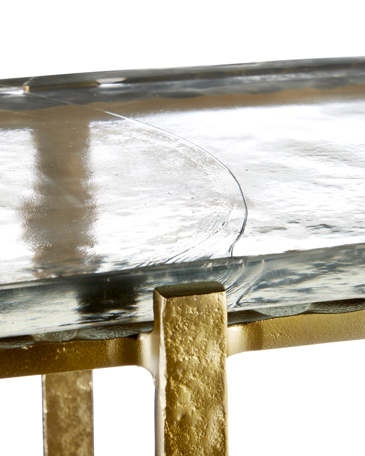 The point at which art and fine craftsmanship meet is where the Acea Gold Side Table resides. Made of cast aluminum poured into a hammered mold to create even greater texture, the gold side table is topped with a cast glass top that is equally textural and luminous. This table will be a piece of jewelry in a space.