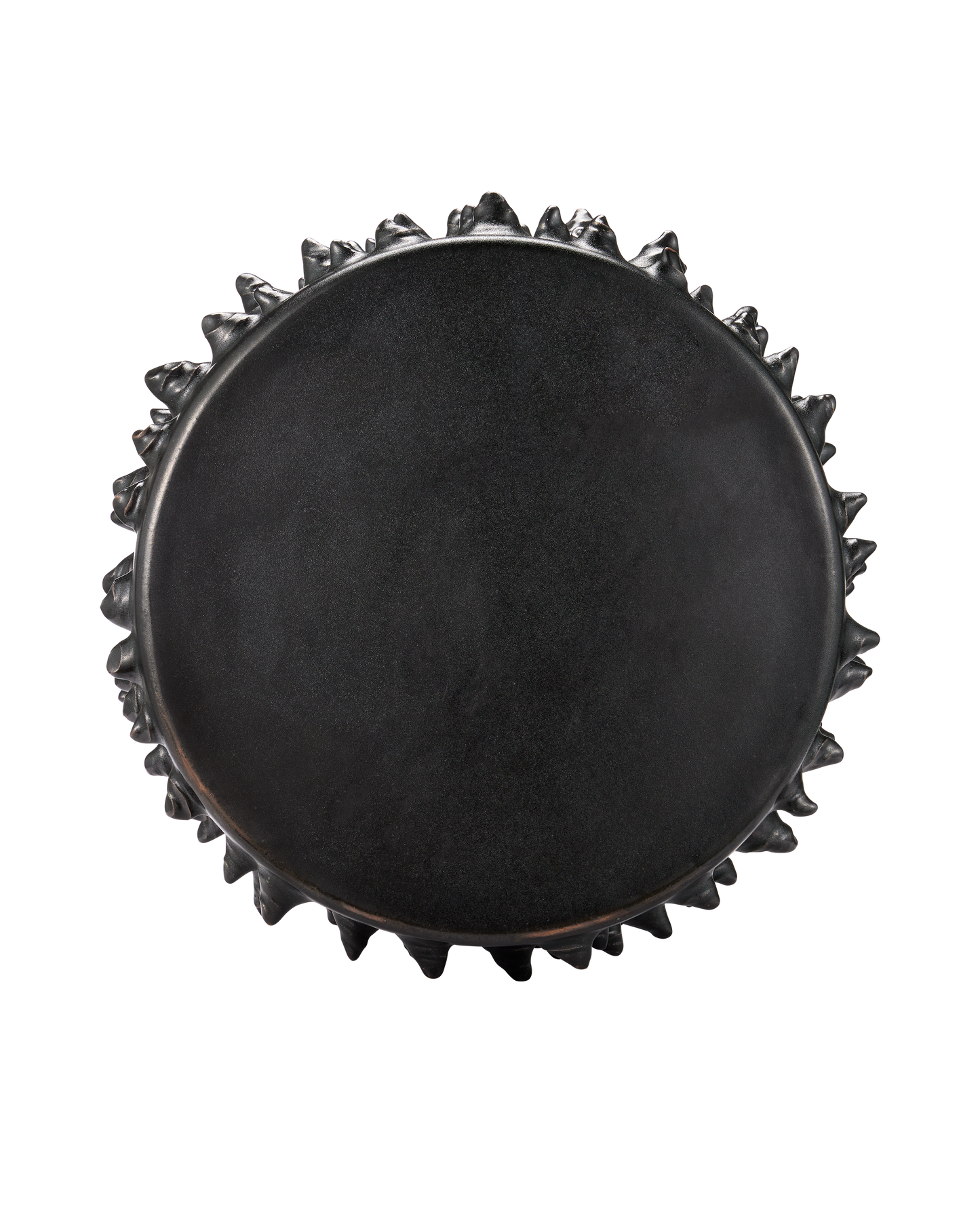 The Baltz Black Accent Table is made of ceramic covered in a rich black glaze. The protrusions that form the dimples on the sides of the table are done by hand by a group of women artisans who live at the border of Burma and Thailand. Then the black glazing is applied. This table is weather-worthy so it can be placed outside.