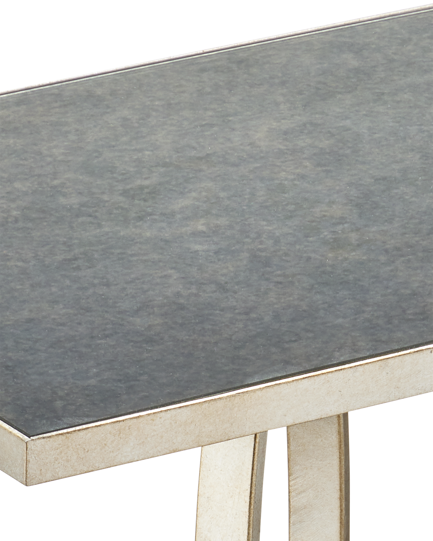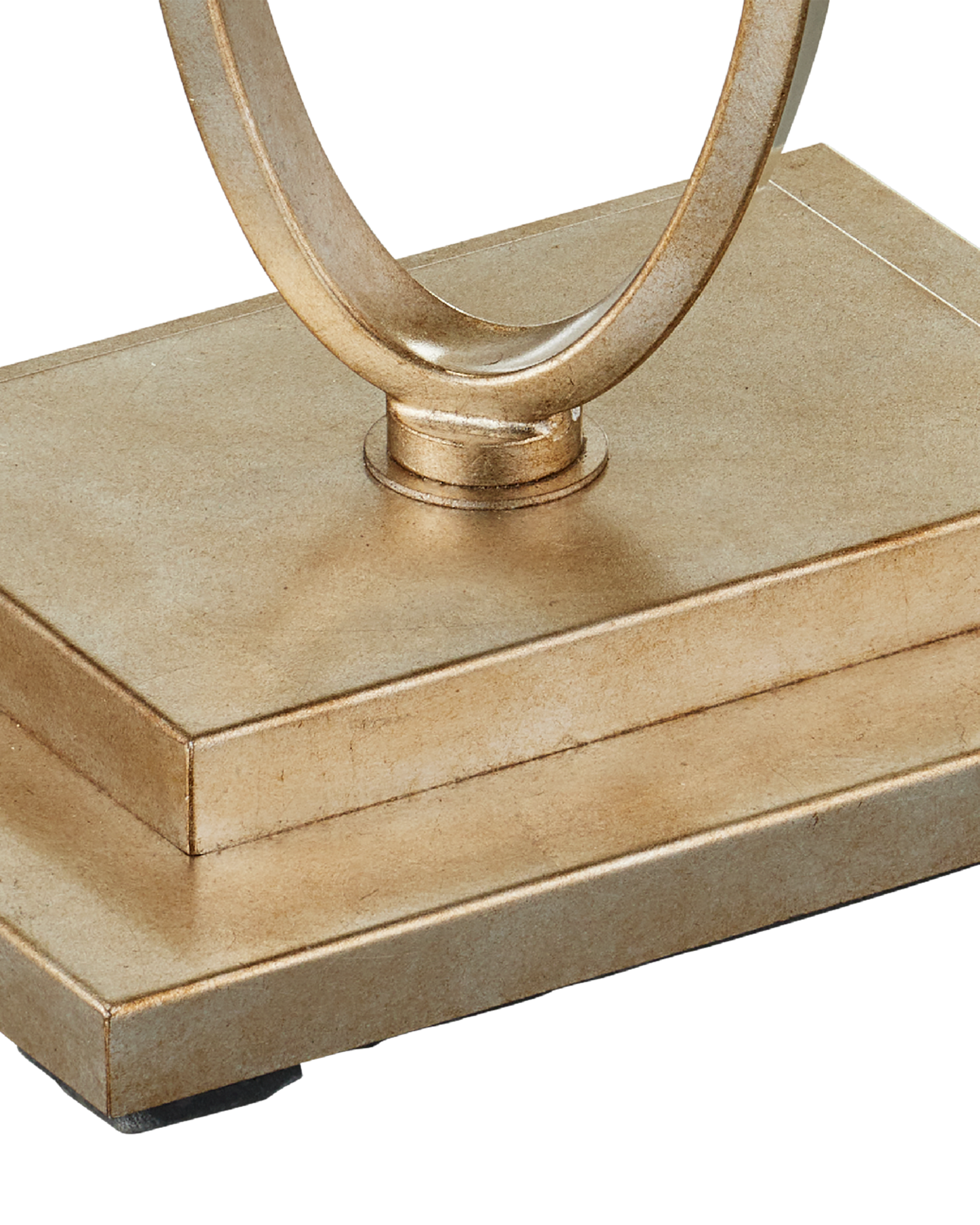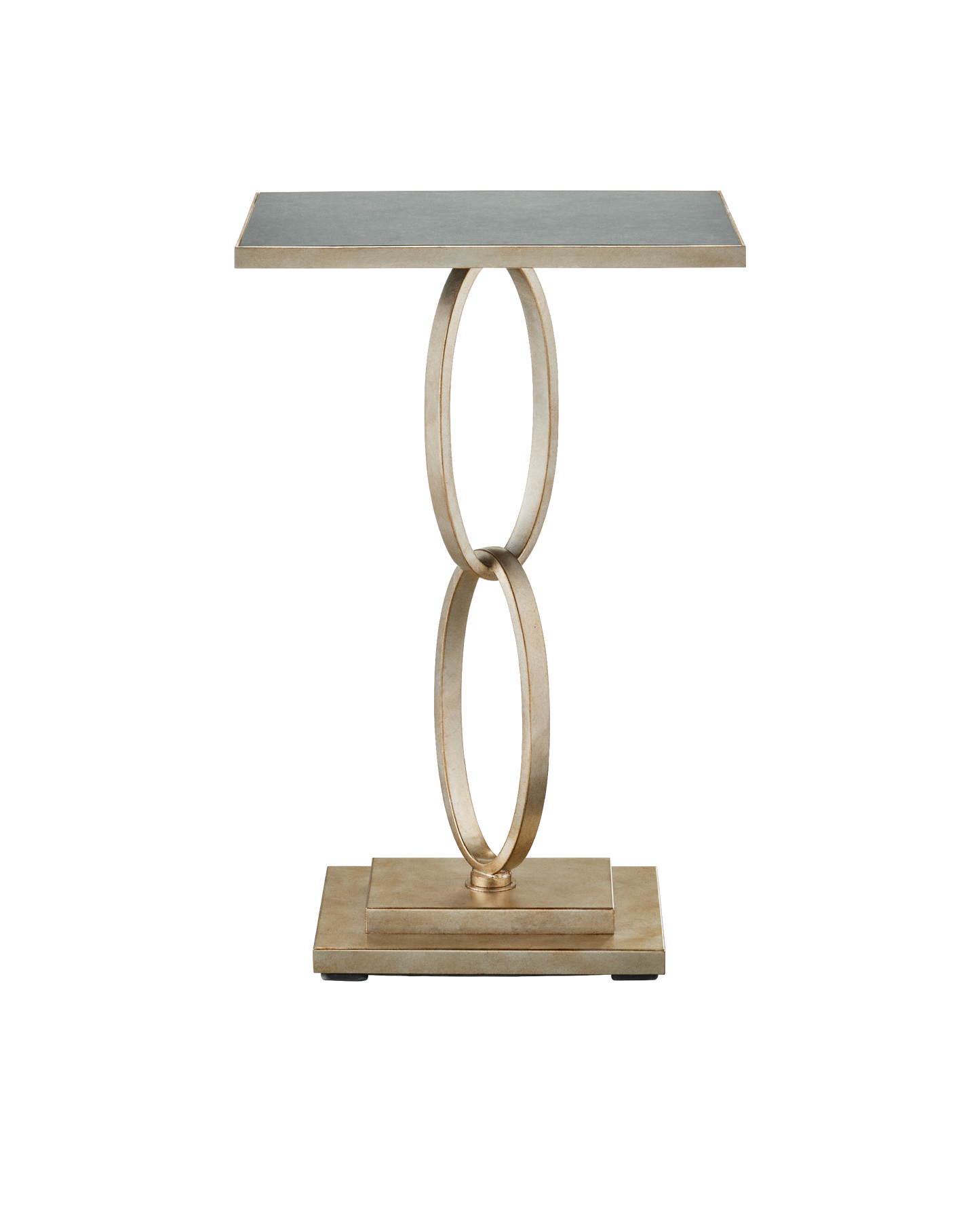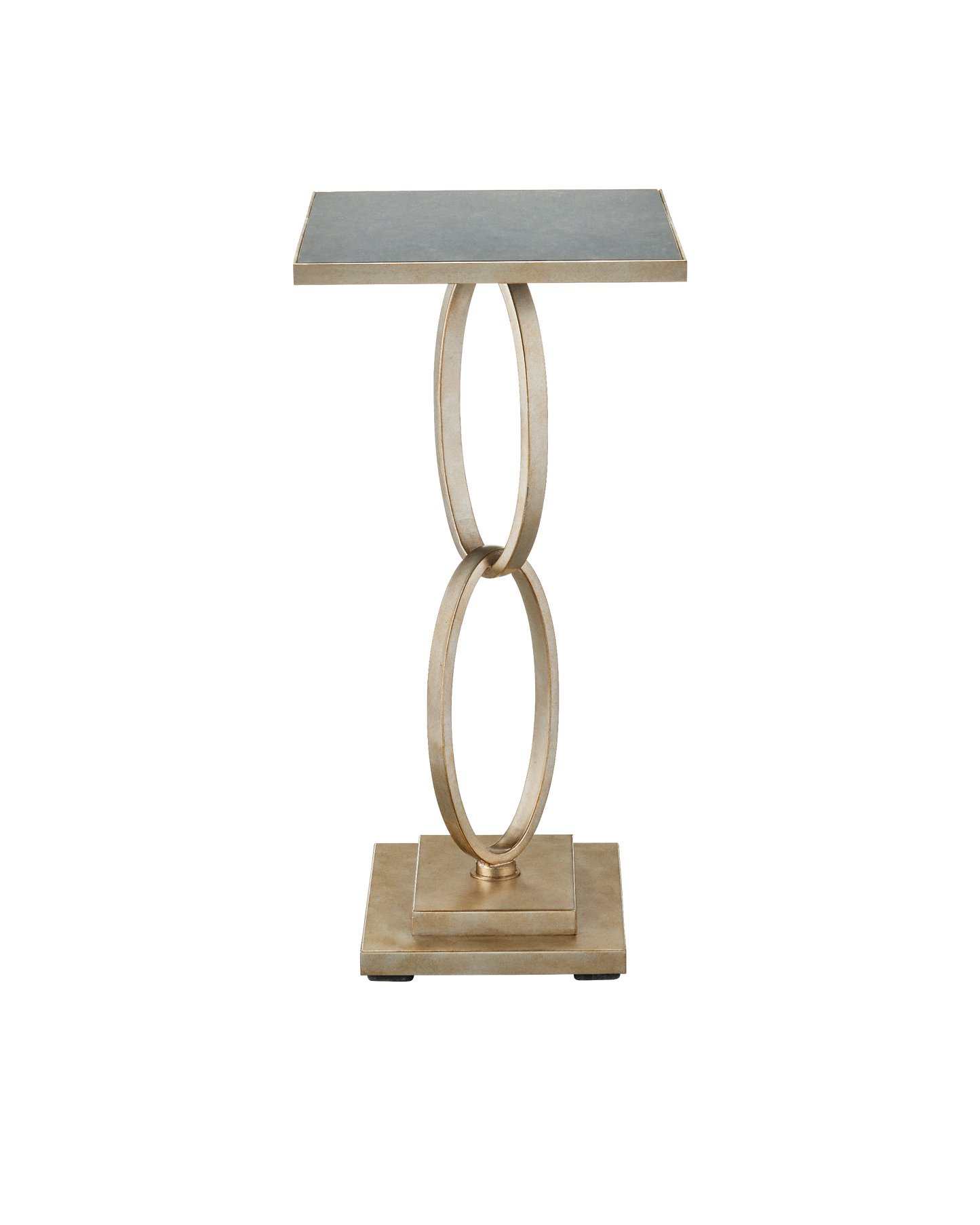 The Bangle Champagne Accent Table will ornament a room with transitional style. The silvered-gold accent table with its antique mirror top has an open design made of two wrought-iron rings that inspired its name. The interconnecting bangles are fitted between a stacked base and a rectangular top, which is slightly larger than the base.