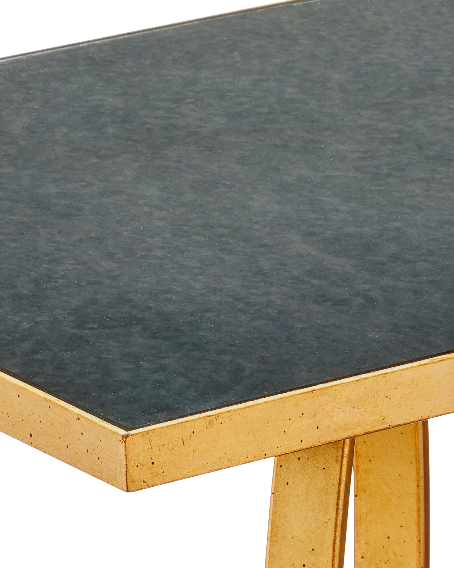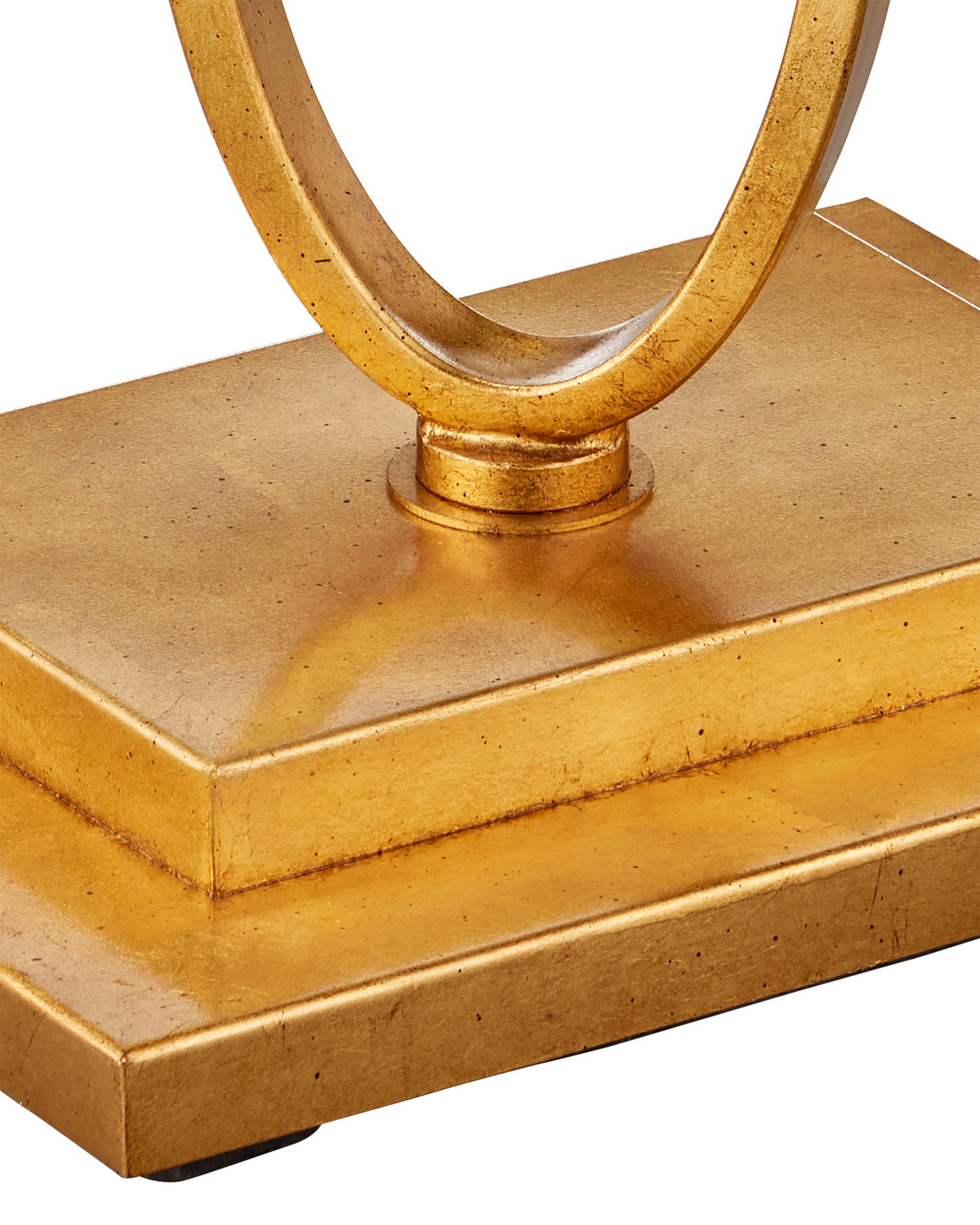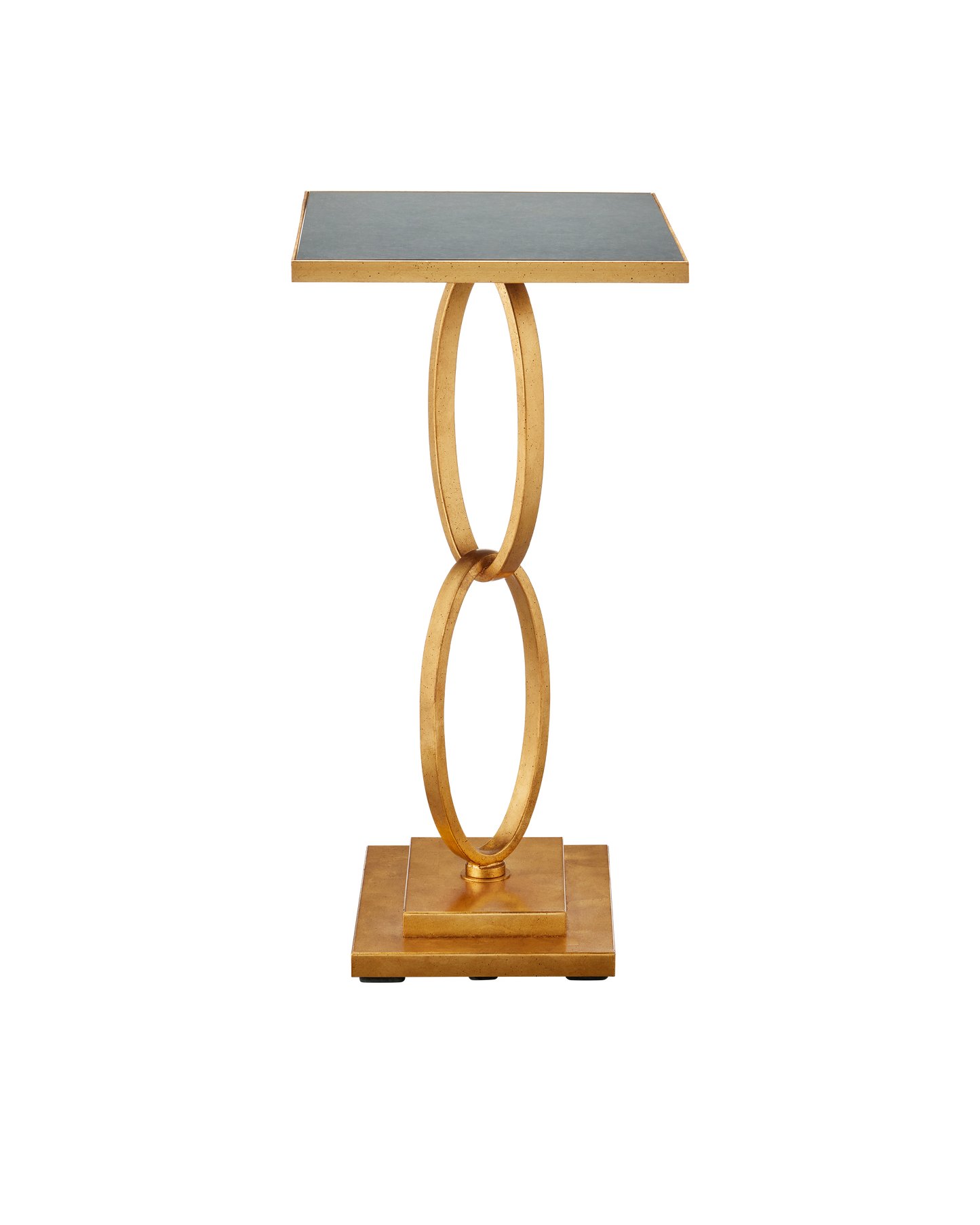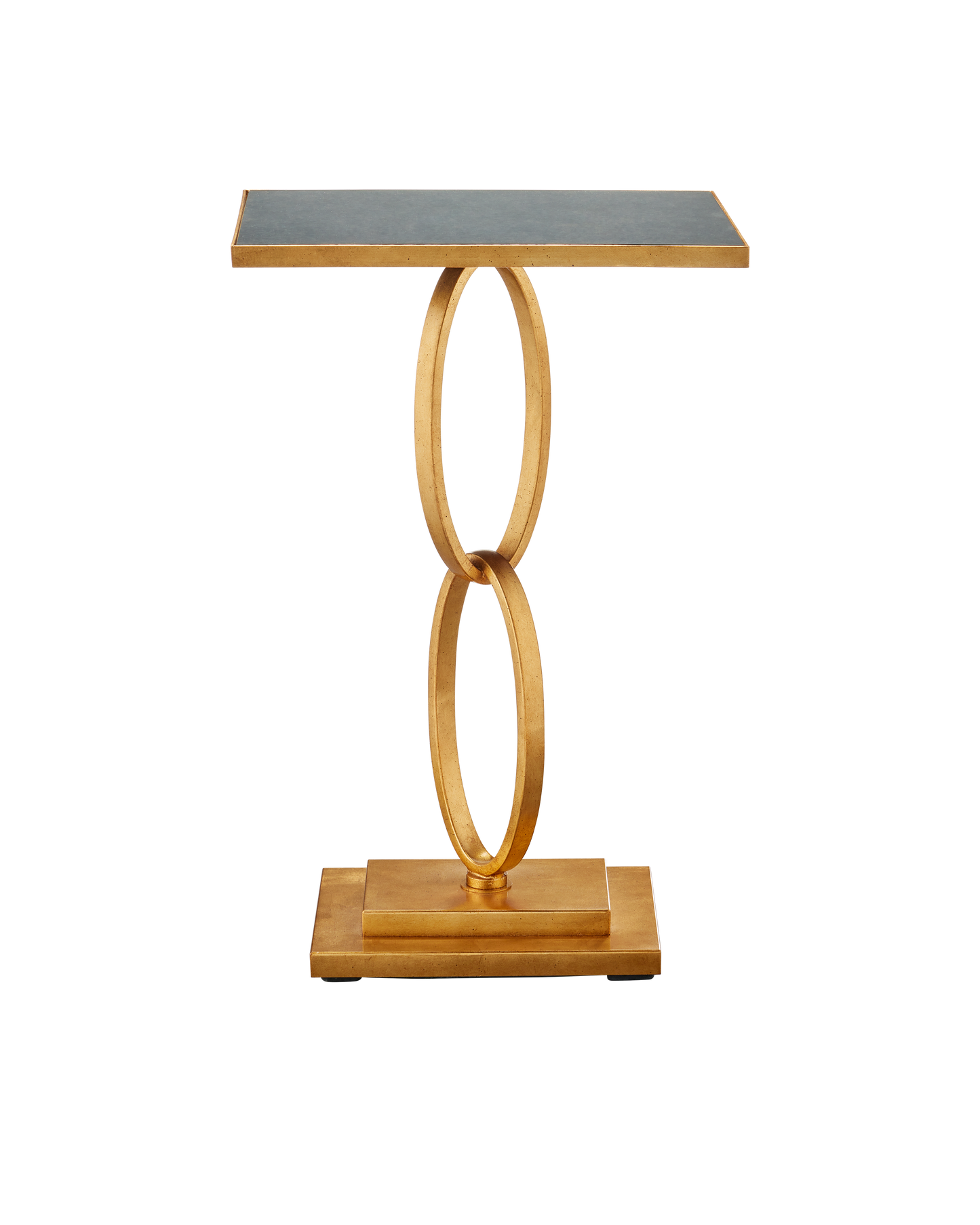 The Bangle Gold Accent Table will ornament a room with transitional style. The luminous gold accent table with its antique mirror top has an open design made of two wrought-iron rings that inspired its name. The interconnecting bangles are fitted between a stacked base and a rectangular top, which is slightly larger than the base.
