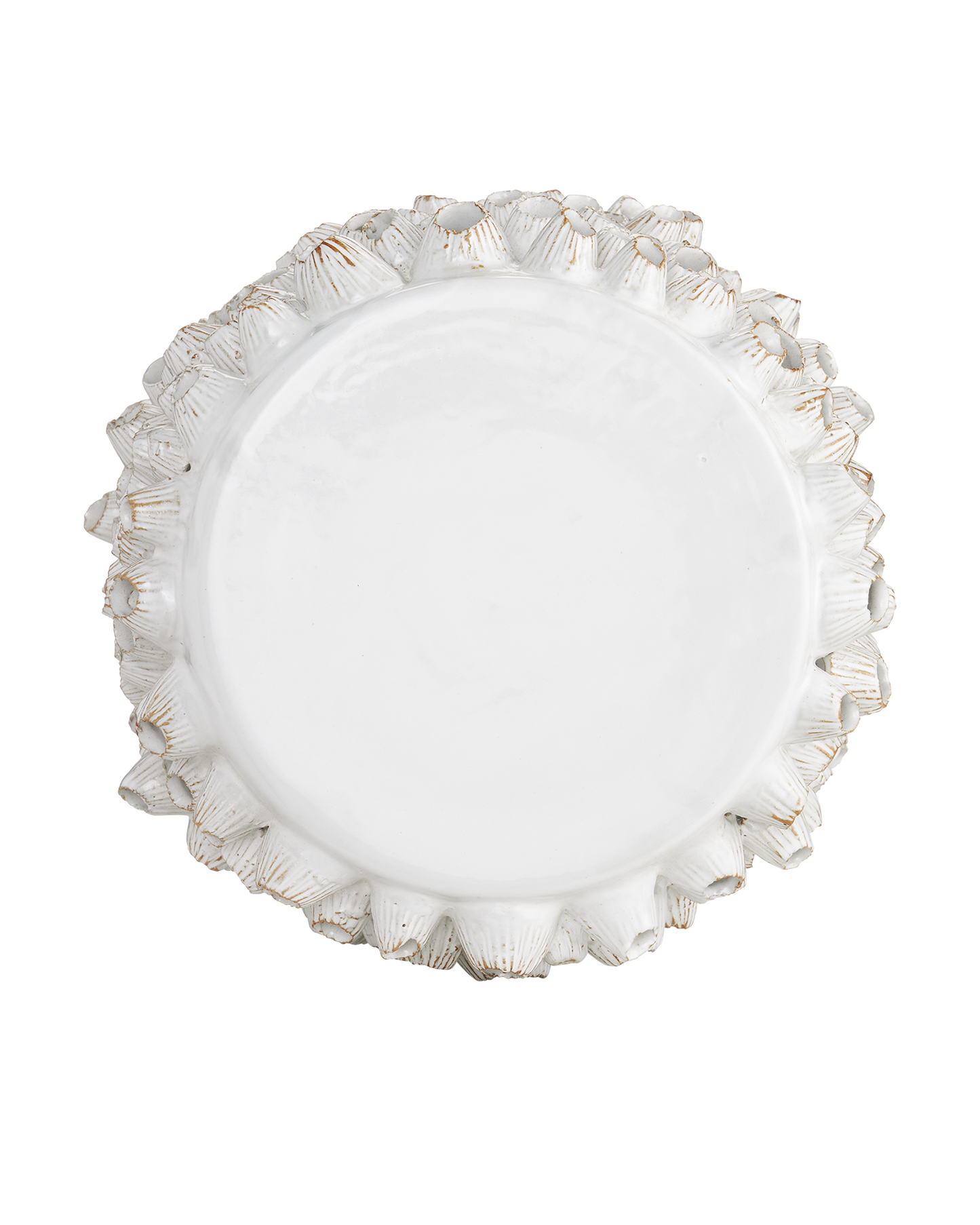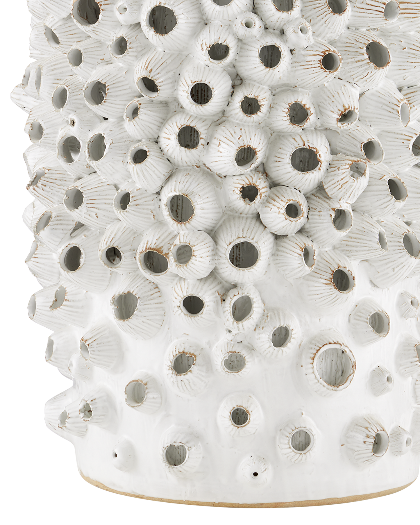 The Barnacle White Accent Table is made by a group of women who live at the border of Burma and Thailand. Made from ceramic, this incredible hand-thrown table is completely covered in handmade ornamentations that look like small barnacles. Once the decorative elements are in place, the vase is glazed with an antique white that provides the table with its depth and personality.