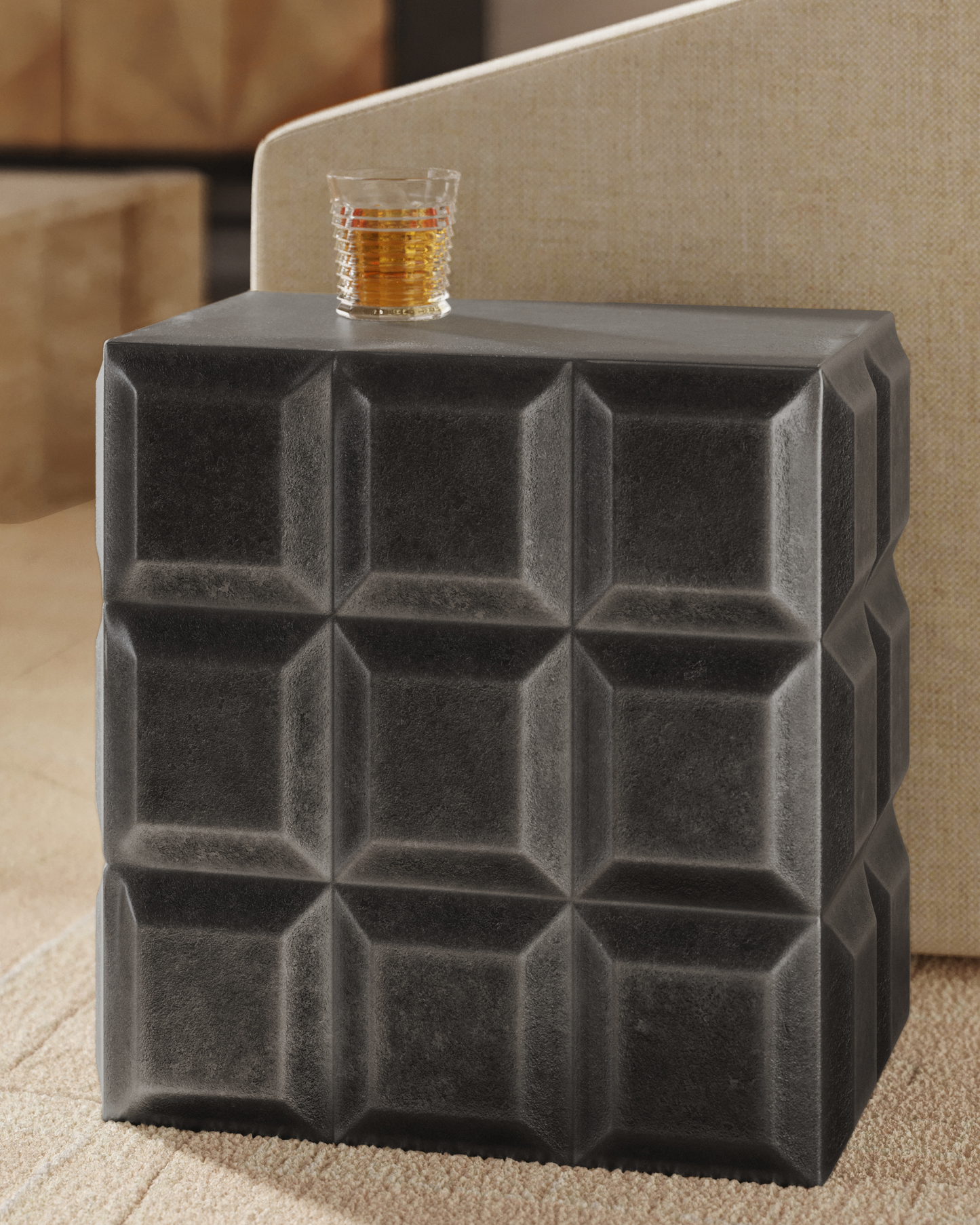 The Bower Side Table is made of cast aluminum finished in black nickel. The columns of squares that flow up toward the top bring the black side table a brutalist feel, which is enhanced by the stippled surface and the matte finish. The Bower would fit well within a number of interior styles, including rough luxe and contemporary.
