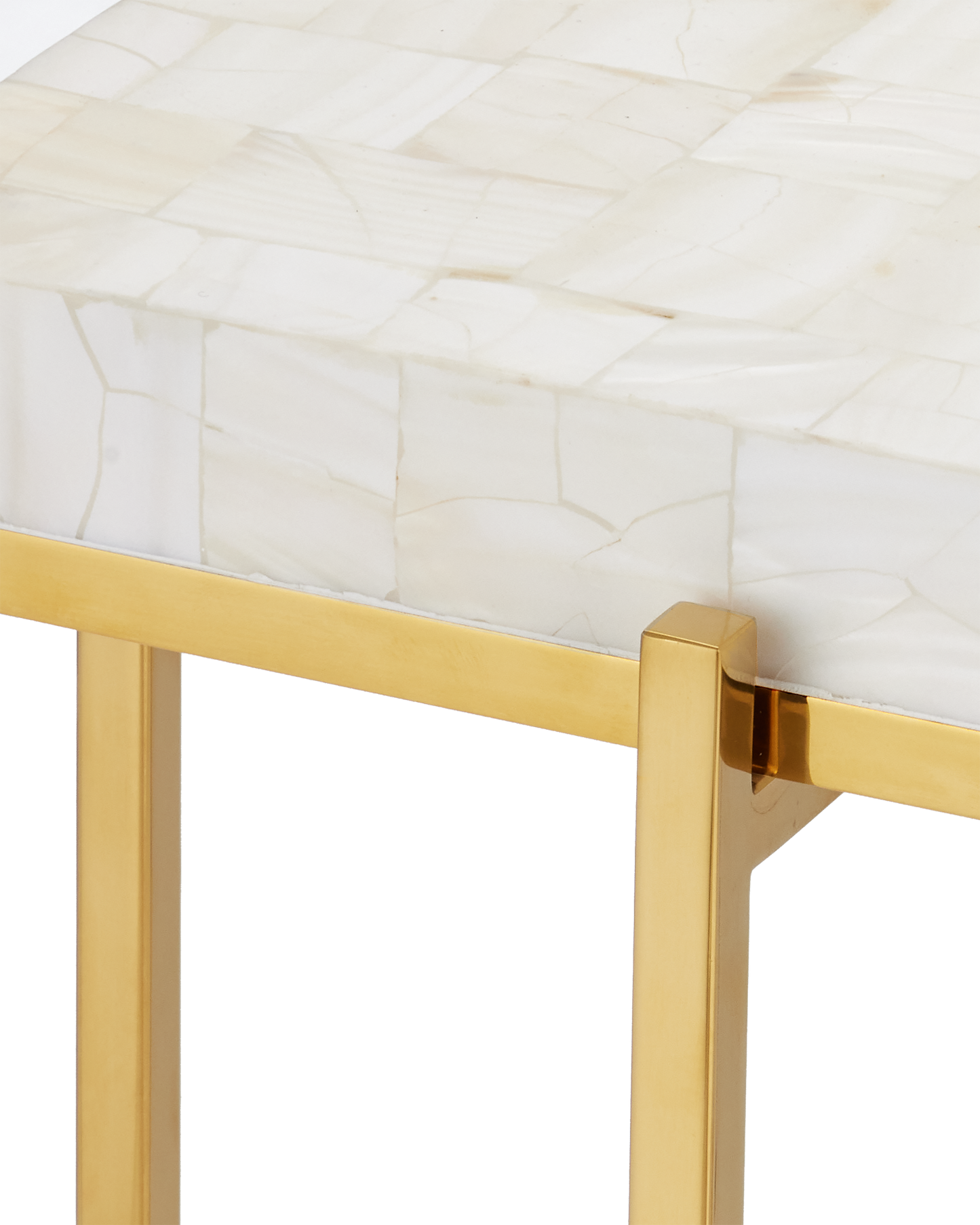 The Casey Mother of Pearl Accent Table has a top covered in a mosaic of shells expertly placed to cover the rectangular slab, which is inset into the metal frame like a gem. Four legs made of stainless steel in a warm brass finish are connected by an ex-shaped stretcher. The gold and ivory drinks table stands just over 23 inches tall, making it ideal for rooms where space is limited.