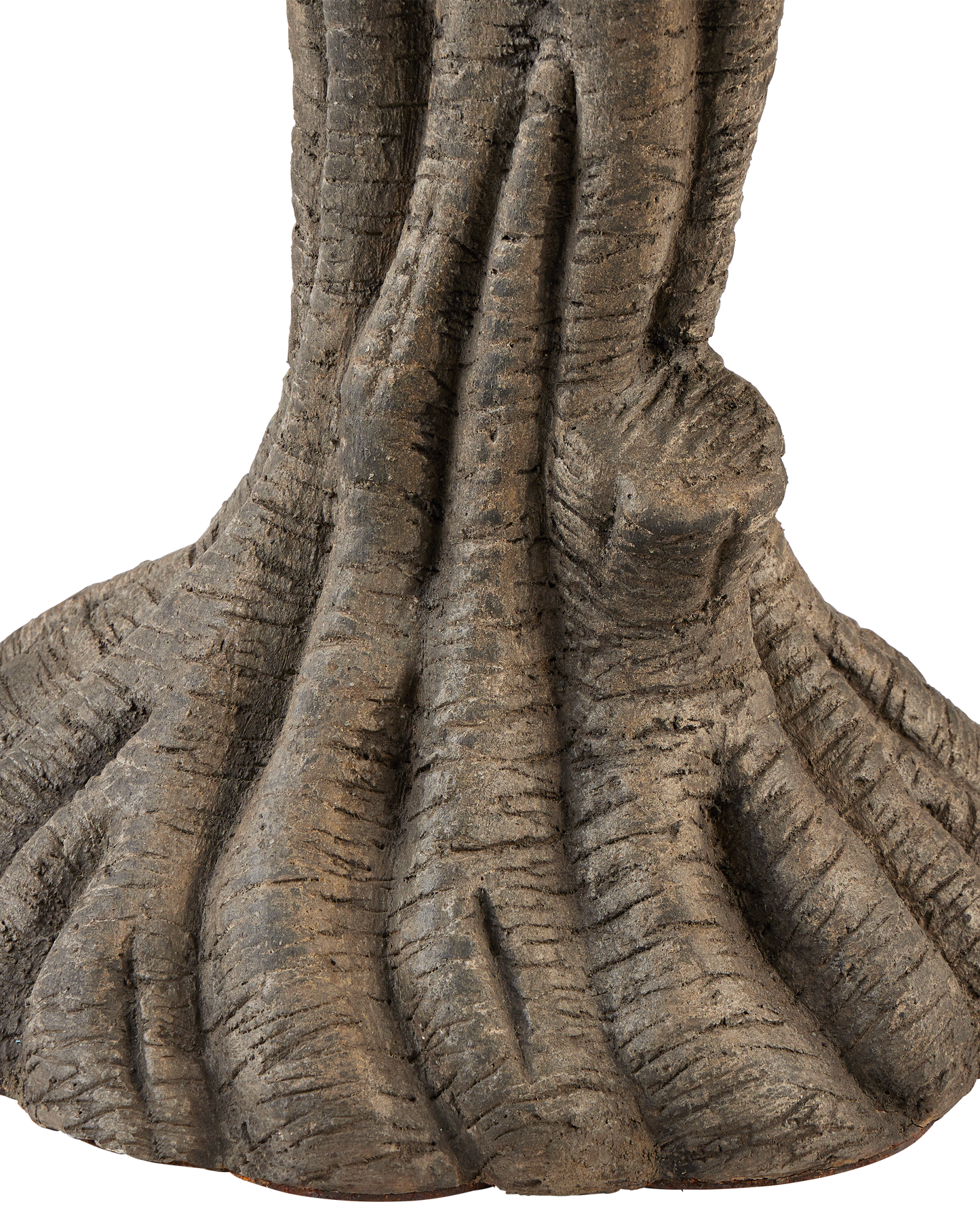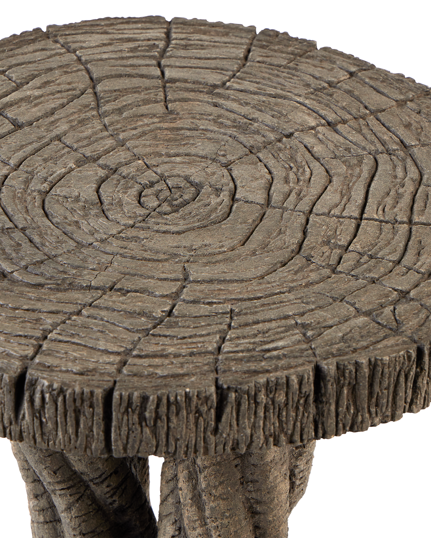 In the Currey & Company fashion of producing exemplary designs in faux bois, the Dunmore Accent Table has a striated texture that makes it feel so convincingly like wood, it lives up to its centuries-old designation. Furthering the natural feel is the Charbon de Bois finish applied to the entire piece, and the top, which is formed to look like it has the life rings of a real tree. The way the root-like formations on the base twist is a graceful element to the design.