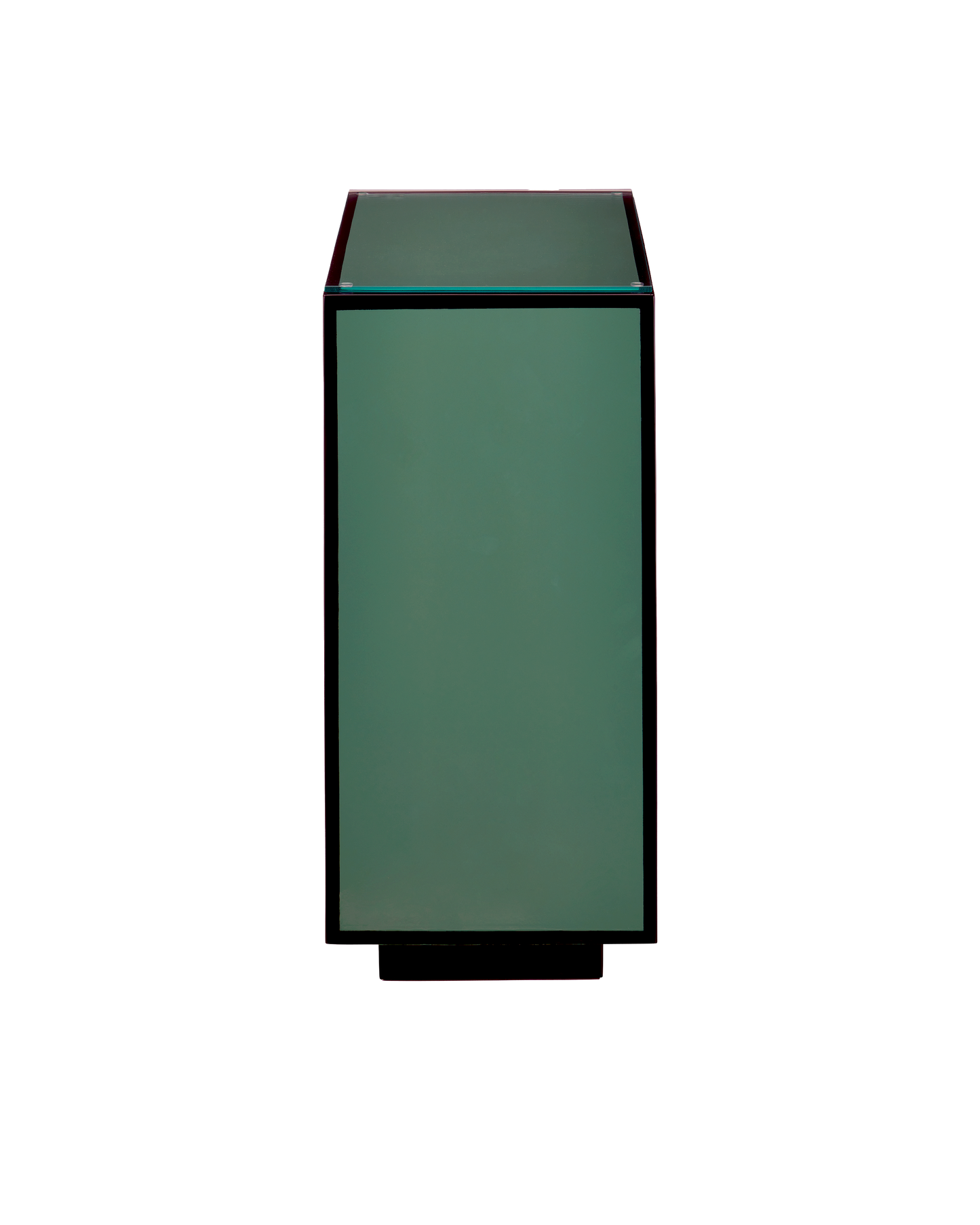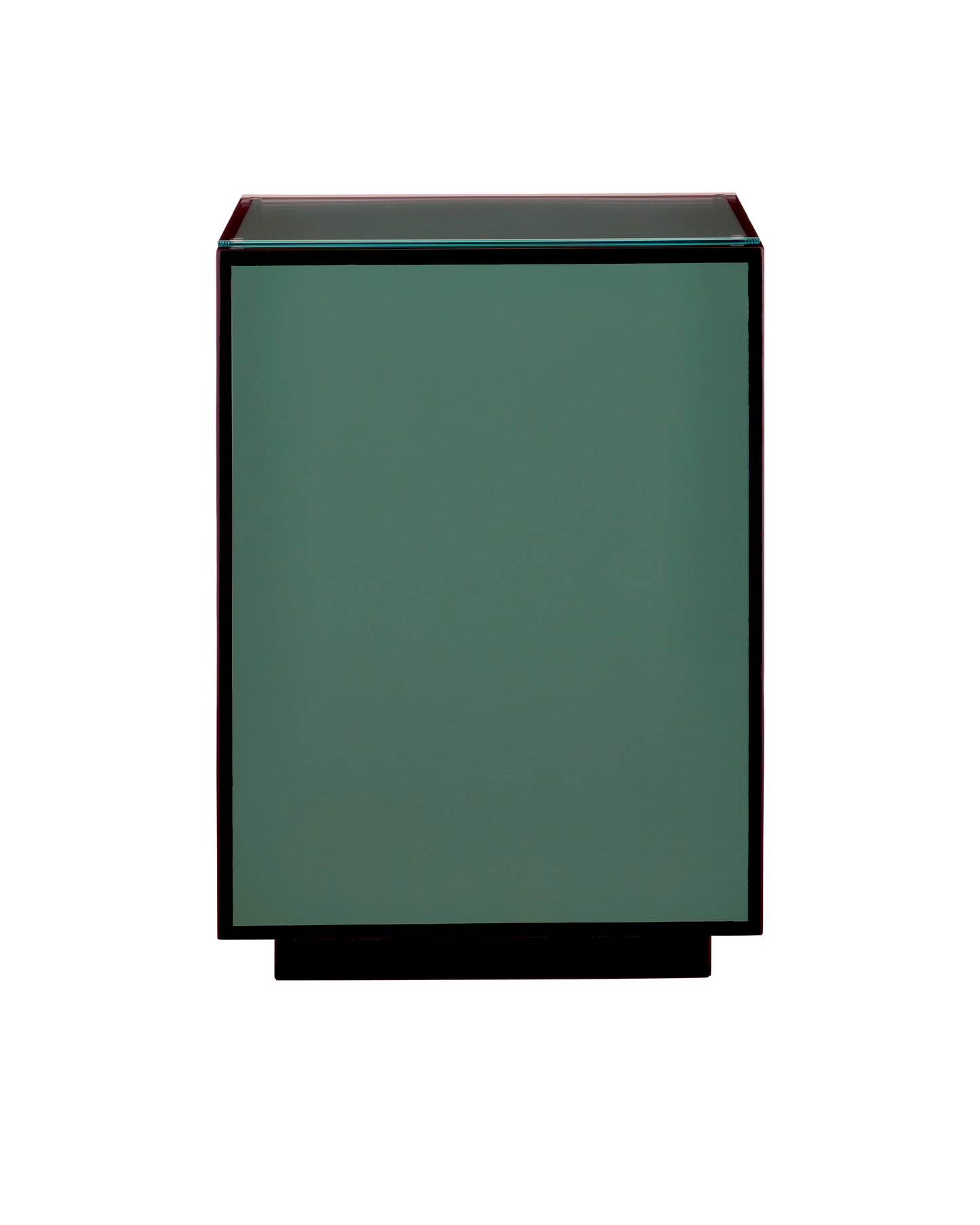 Nothing beats the sheen of lacquer where decorative elements are concerned, as is evident in the sleek surfaces of the Green Lacquer Side Table. Made of wood, the accent table has been covered in the time-honored lacquer process. The luxe green surfaces are rimmed in rich black, and the top is fitted with a square of tempered glass. The plinth base is a design feature of note.
